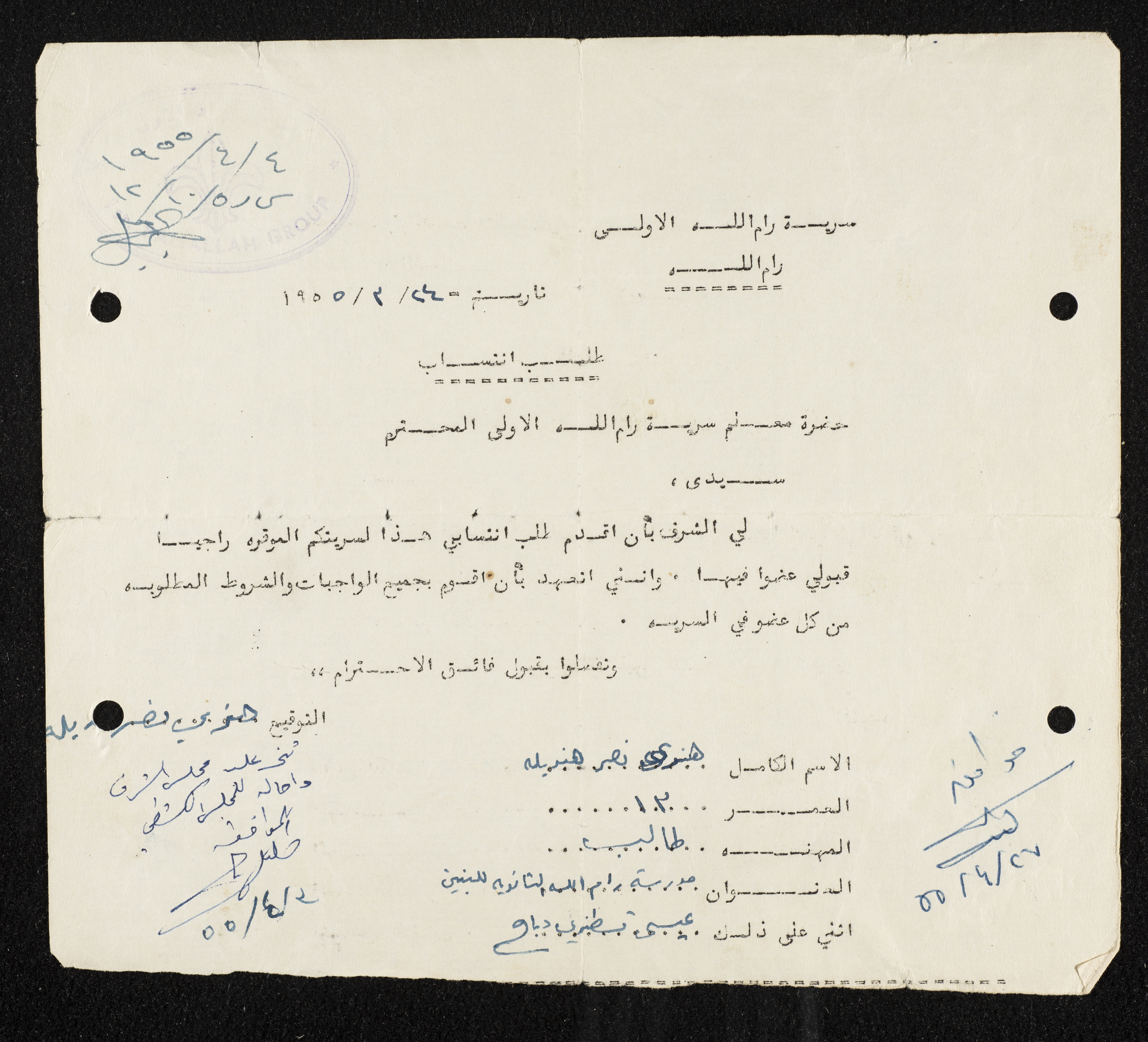 طلب انتساب الى سرية رام الله الاولى عام 1955