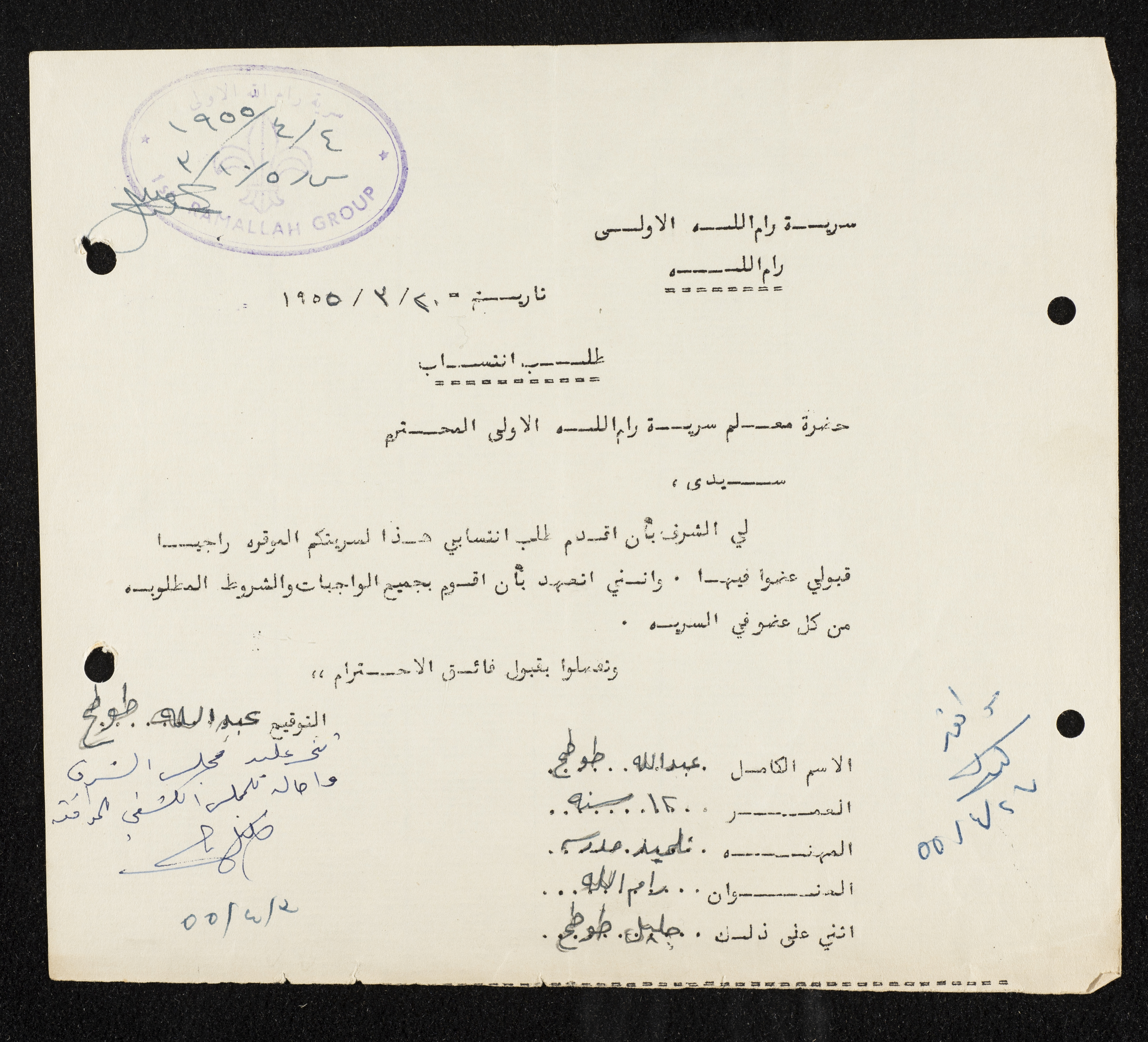 وثيقة مطبوعة باللغة العربية، تتضمن طلب انتساب مقدم من عبد الله طوطح الى سرية رام الله ليصبح عضوا فيها ويتعهد في القيام بجميع الاعمال والواجبات والشروط المطلوبة عام 1955
