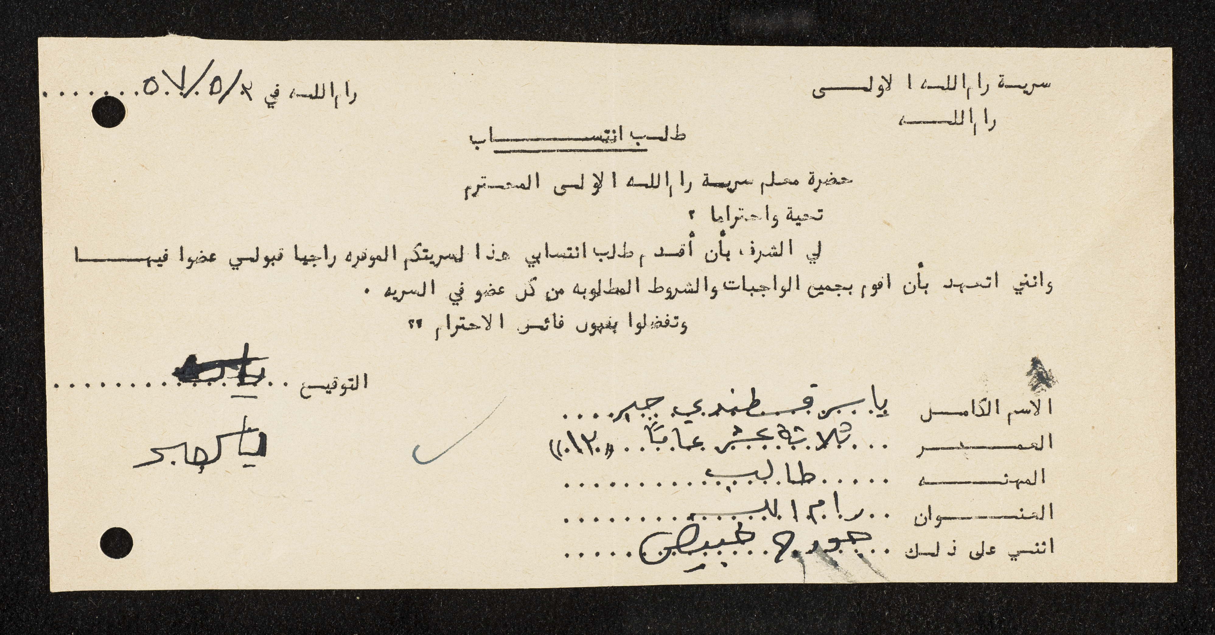 A Membership Application for Sareyyet Ramallah, 1957