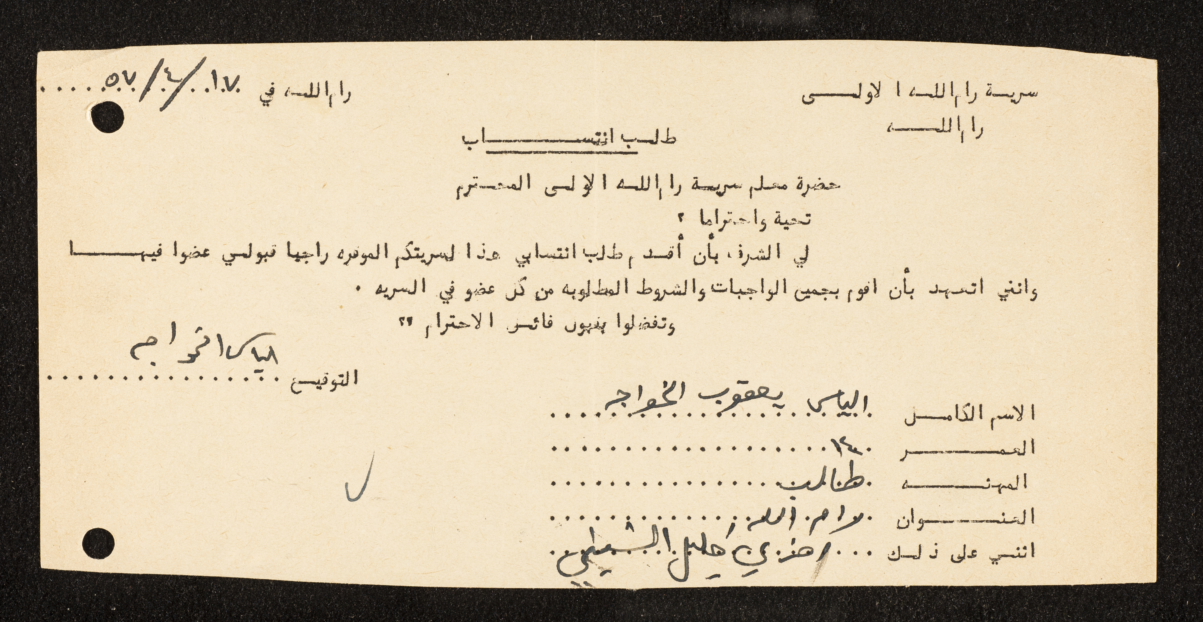 وثيقة مطبوعة باللغة العربية، تتضمن طلب انتساب مقدم من الياس يعقوب الخواج الى سرية رام الله ليصبح عضوا فيها ويتعهد في القيام بجميع الاعمال والواجبات والشروط المطلوبة عام 1957