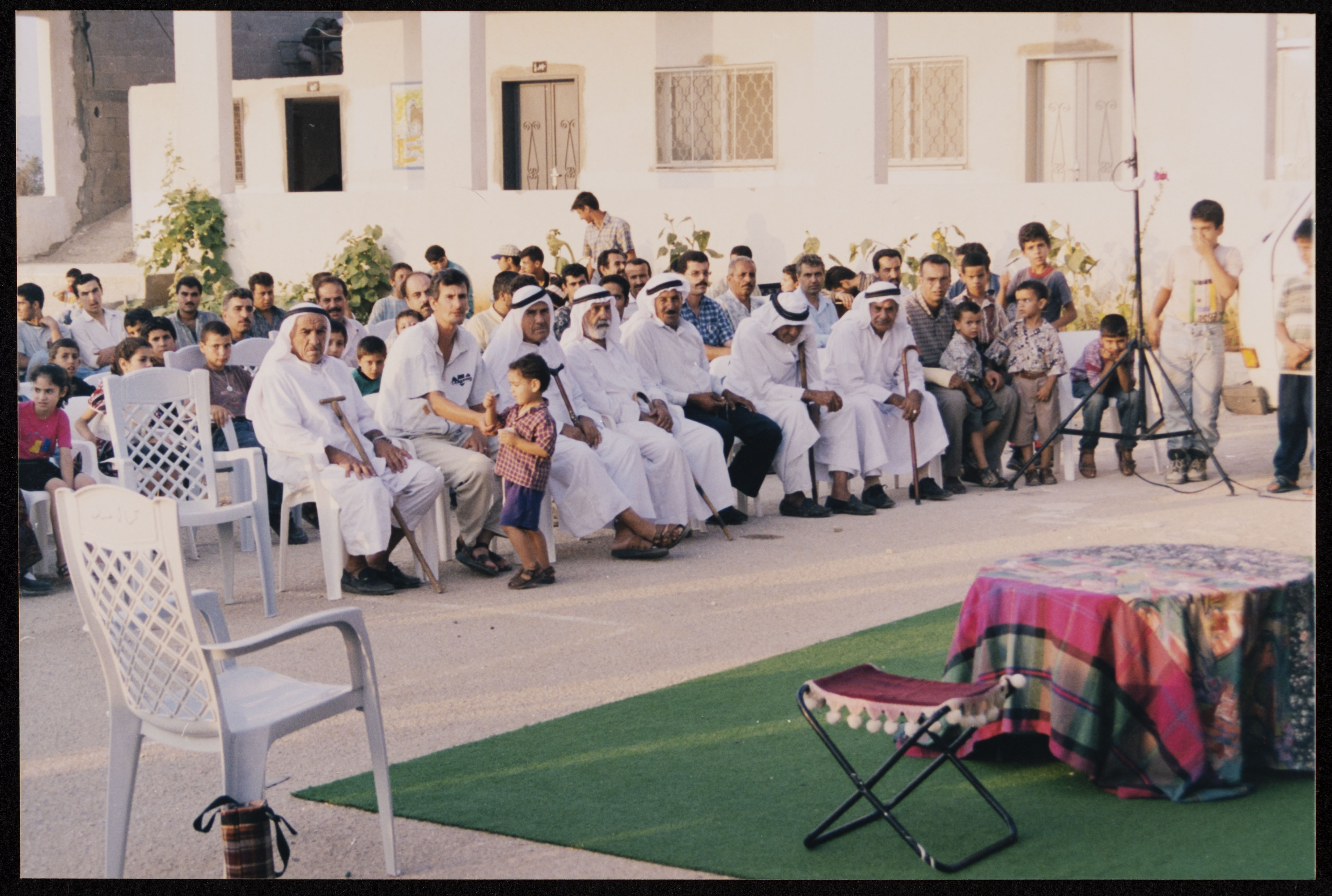 صورة من مسرحية "شؤون أبو شاكر" من إنتاج عشتار لإنتاج وتدريب المسرح، وهي سلسلة من العروض المسرحية التي بدأت عام 1997 واستمرت حتى عام 2001.