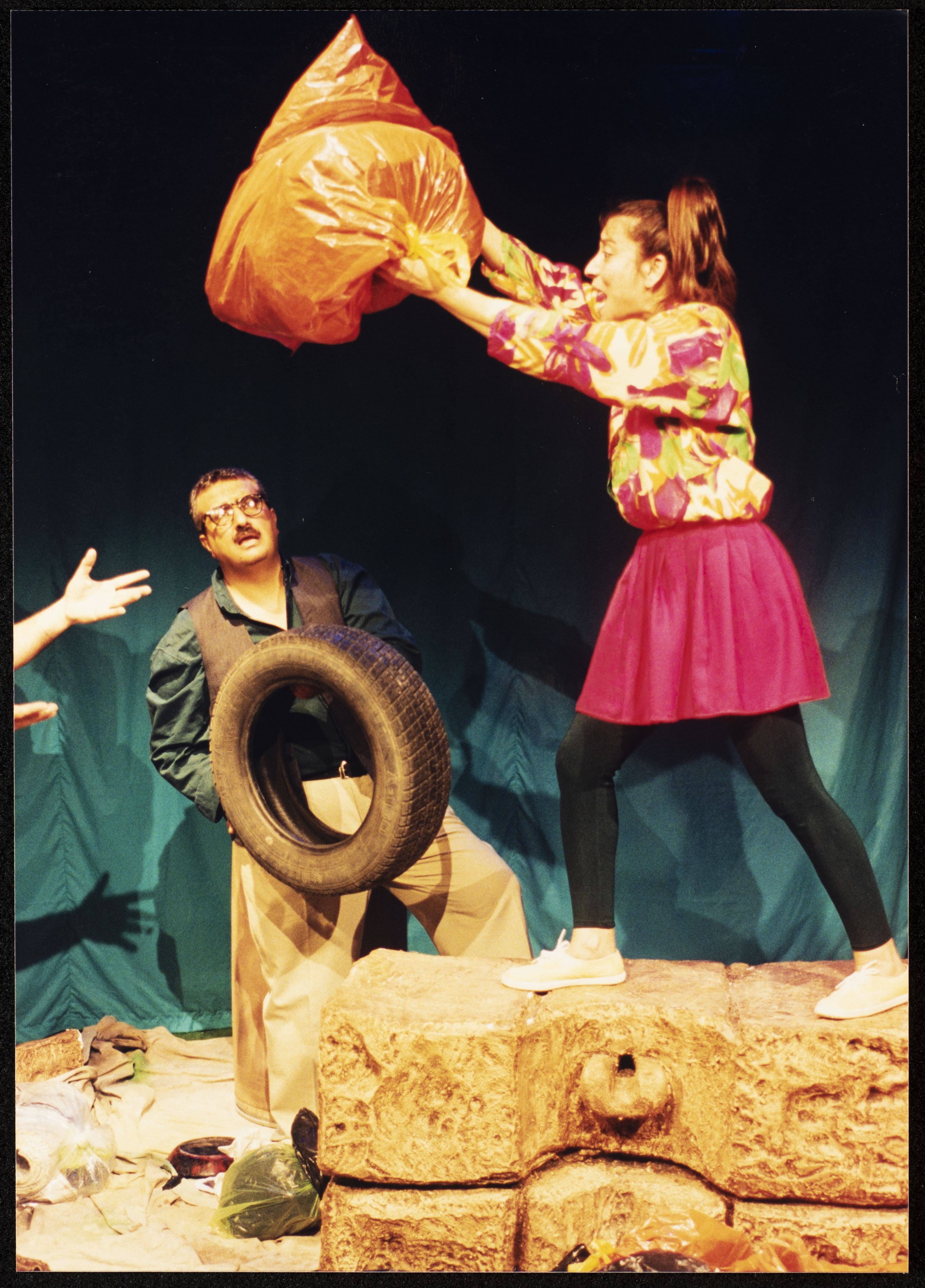 Taken in 2000, this colour photograph shows a glimpse of the "Ard Wa Sama [Earth and Sky]" children play produced by Ashtar Theatre. Written by Waddah Zaqtan, this play was directed by Edward Mʿallem, scenographied by Majid az-Zubaydi, and performed by Raʿid al-ʿiseh, Walid ʿabdes-Salam, and Munira Zurayqi. Performed for the first time at Ashtar Theatre, the play was performed in schools in the West Bank.