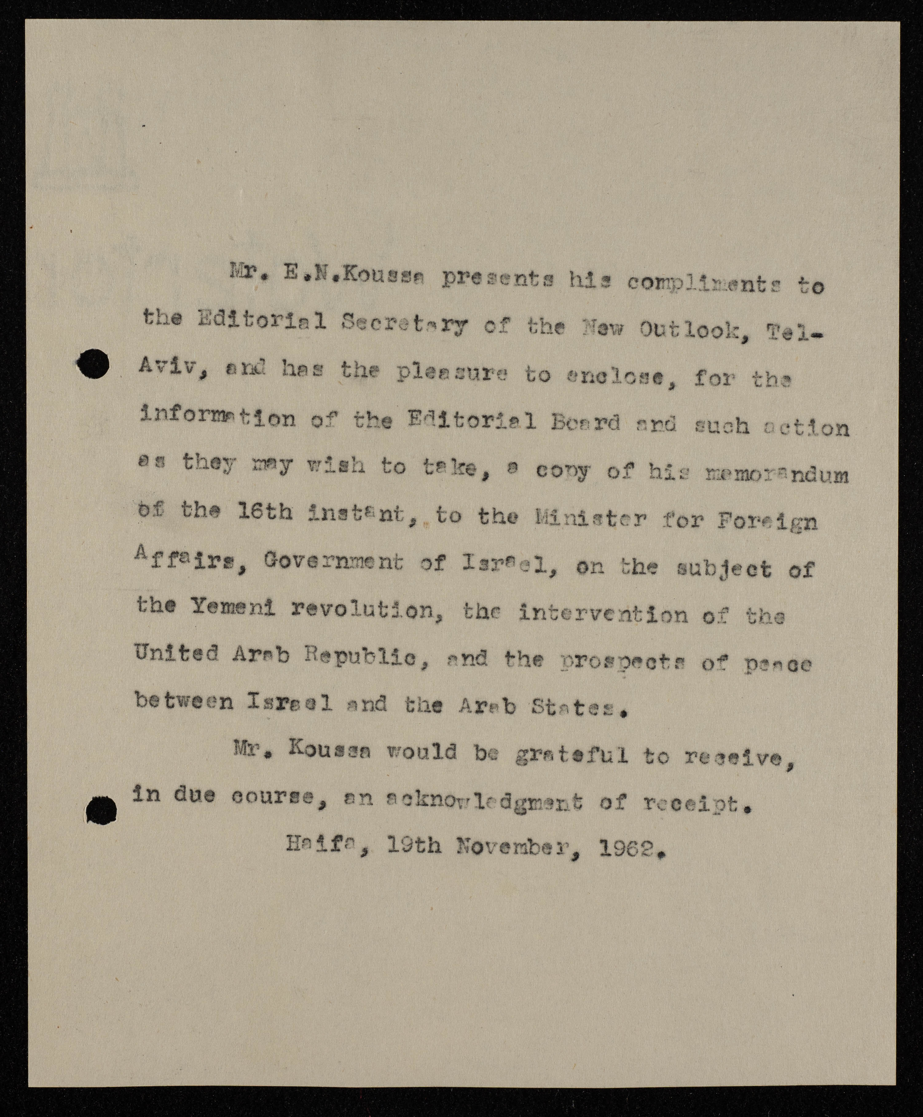 رسالة مطبوعة باللغة الانجليزية من إلياس كوسا إلى هيئة تحرير مجلة نظرة جديدة بتاريخ 19 تشرين الثاني 1962، بخصوص مذكرته التي أرسلها إلى وزير الشؤون الخارجية في الحكومة الاسرائيلية بخصوص الثورة اليمنية ودعم الجمهورية العربية المتحدة لها (جمال عبد الناصر)، وآفاق السلام بين الدول العربية واسرائيل.