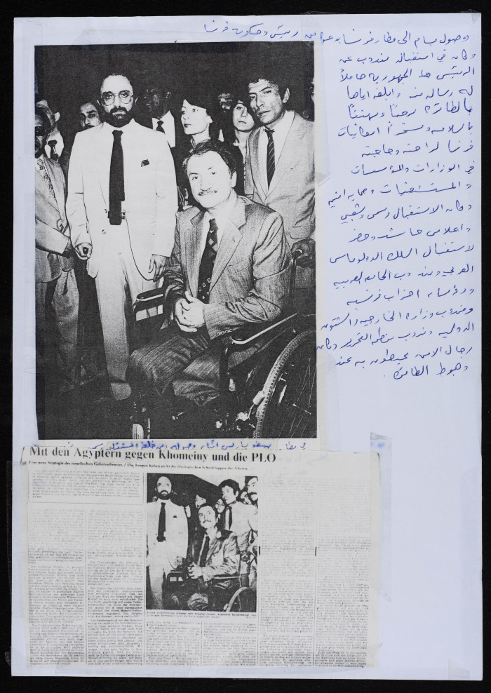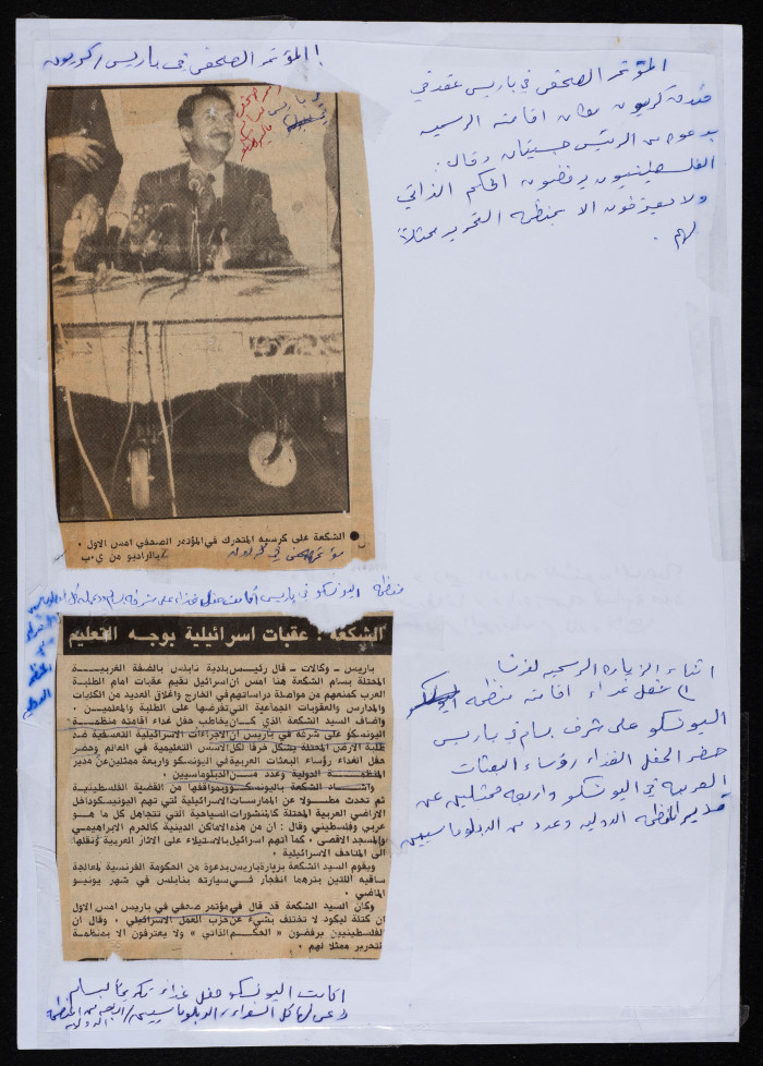 وثيقة مطبوعة باللغة الانجليزية مكونة من صفحتين، تتضمن قصاصة من جريدة يظهر فيها صورة بسام الشكعة اثناء وصوله مطار فرنسا بدعوة من رئيس حكومة فرنسا وكان في استقباله مندوب عن رئيس جمهورية فرنسا وكان الاستقبال رسمي وشعبي واعلامي حاشد، وحضر الاستقبال الدبلوماس العرب من الجامعة العربية ورؤساء احزاب فرنسا واخرين. كما تتضمن قصاصة من جريدة تظهر فيها بسام الشكعة على كرسيه المتحرك في المؤتمر الصحفي في باريس عقد في فندق الكربون بدعوة من الرئيس جيستان.
