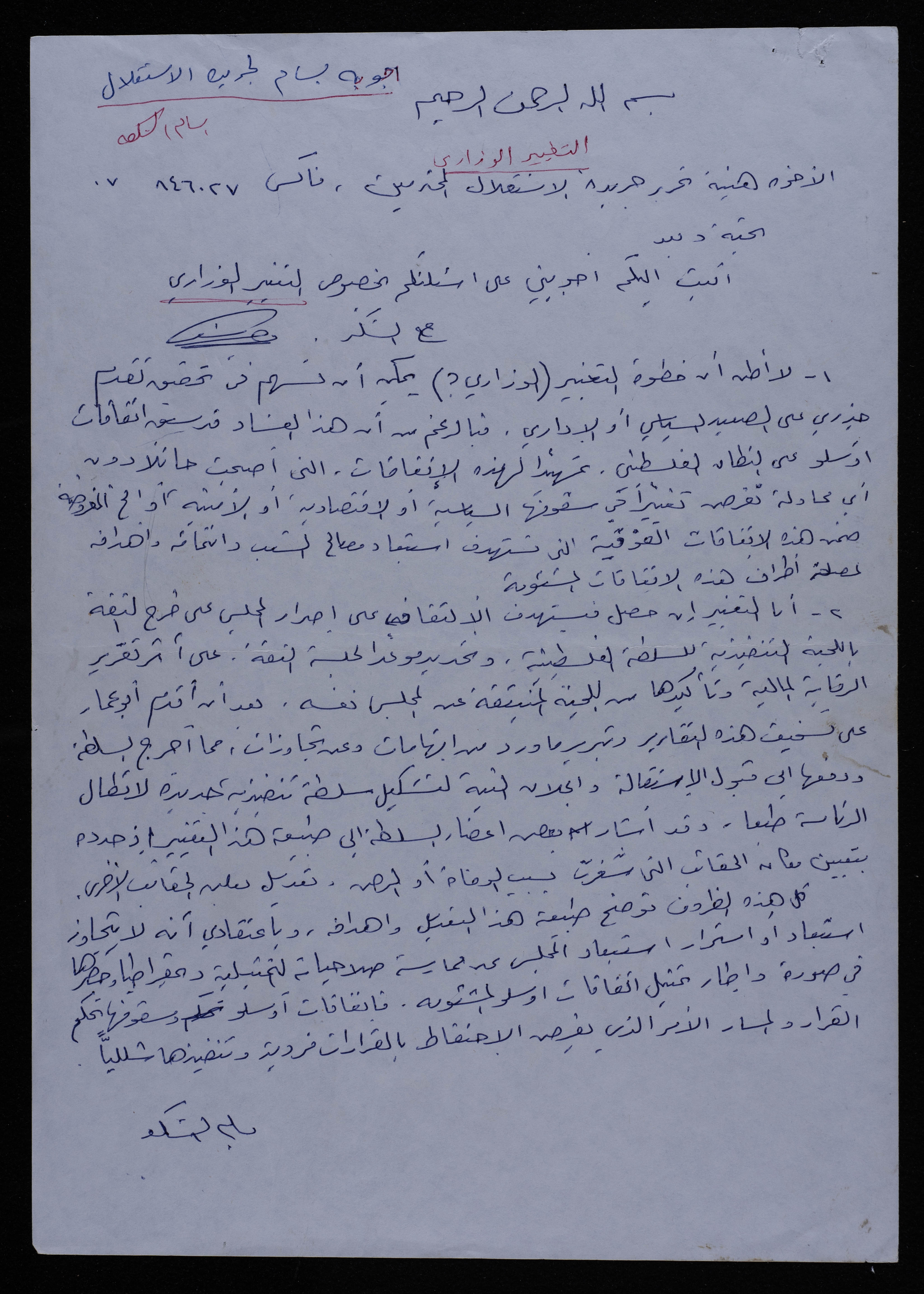 .وثيقة مكتوبة باللغة العربية، تتضمن رسالة وصلت هيئة تحرير جريدة الاستقلال من بسام الشكعة حول اجوبته بخصوص التغيير الوزارى