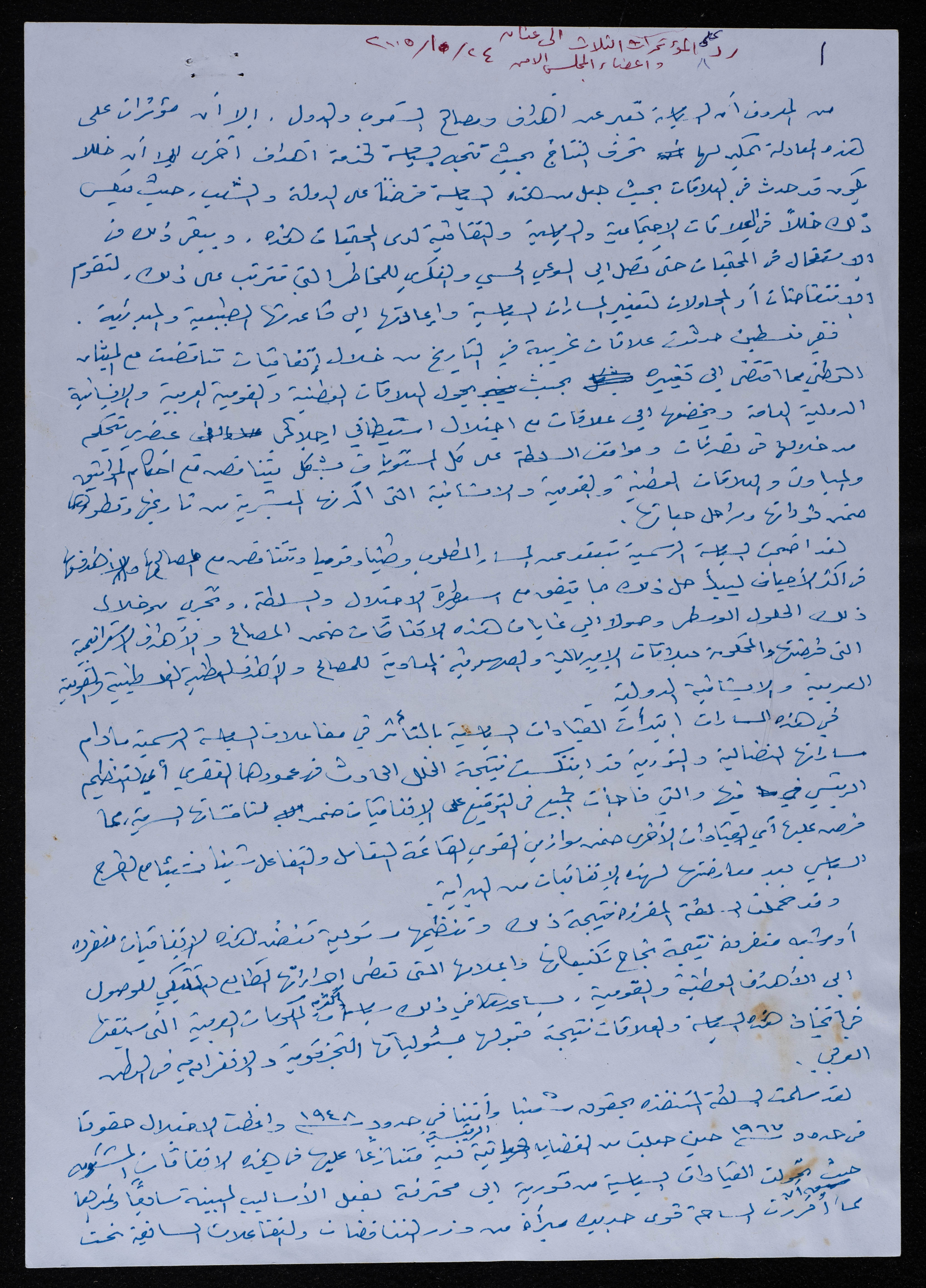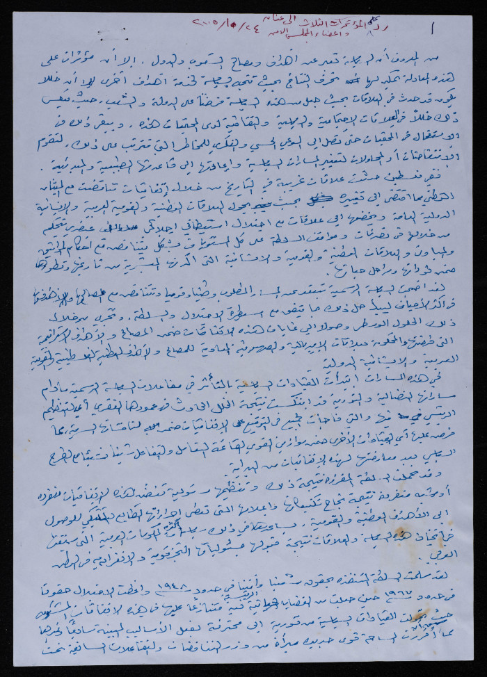 A two-page, handwritten article by Bassam ash-Shakʿa titled, "Extension for the President of Lebanon and Pressures against Syria", in which ash-Shakʿa discussed the Zionist-American pressures made against Syria to withdraw from Lebanon; the issue of extension for the President of Lebanon; the filtration of the resistance and the segmentation of the Arab World; and Syria's place in the midst of the Arab-Israel conflict.