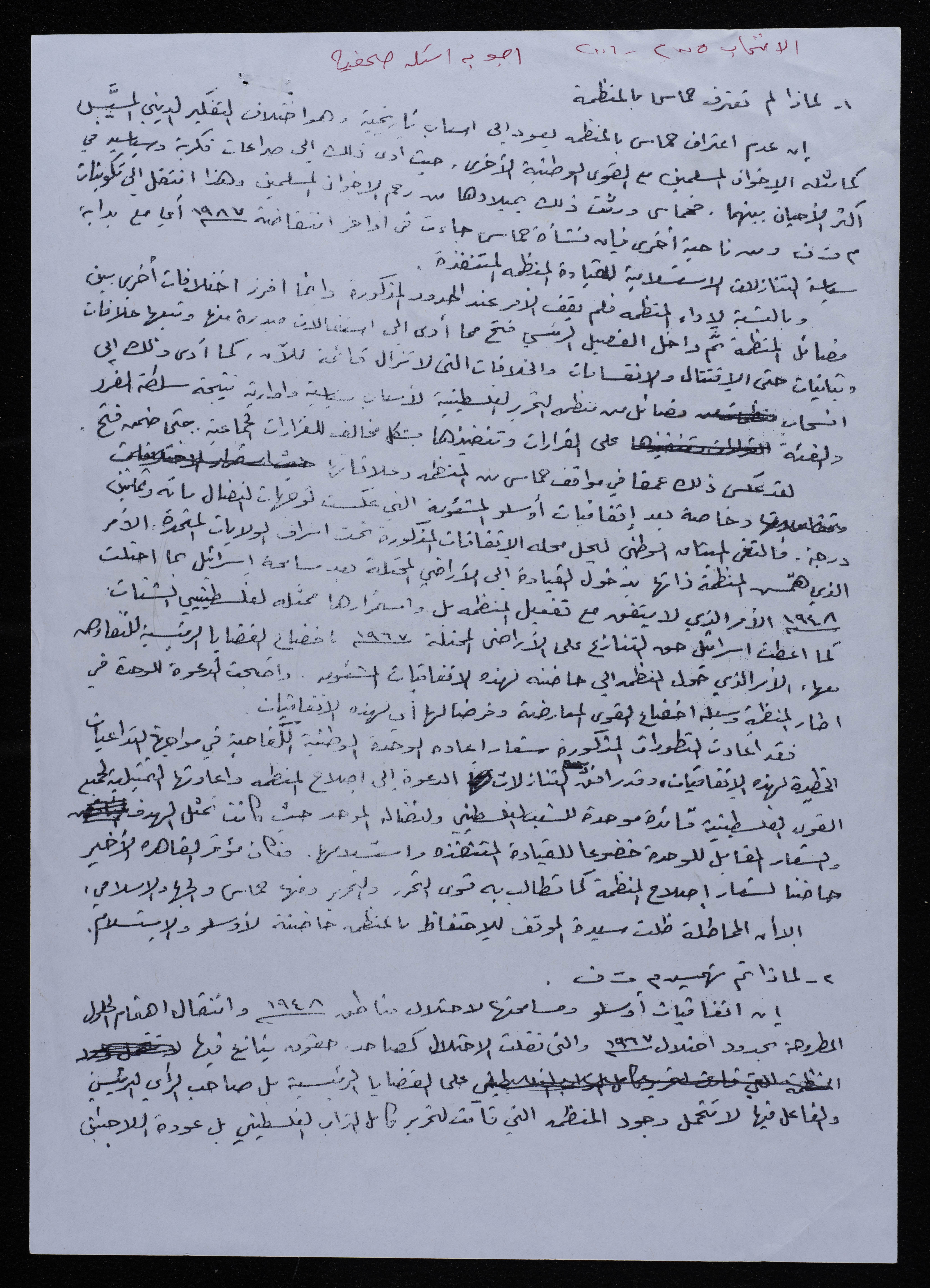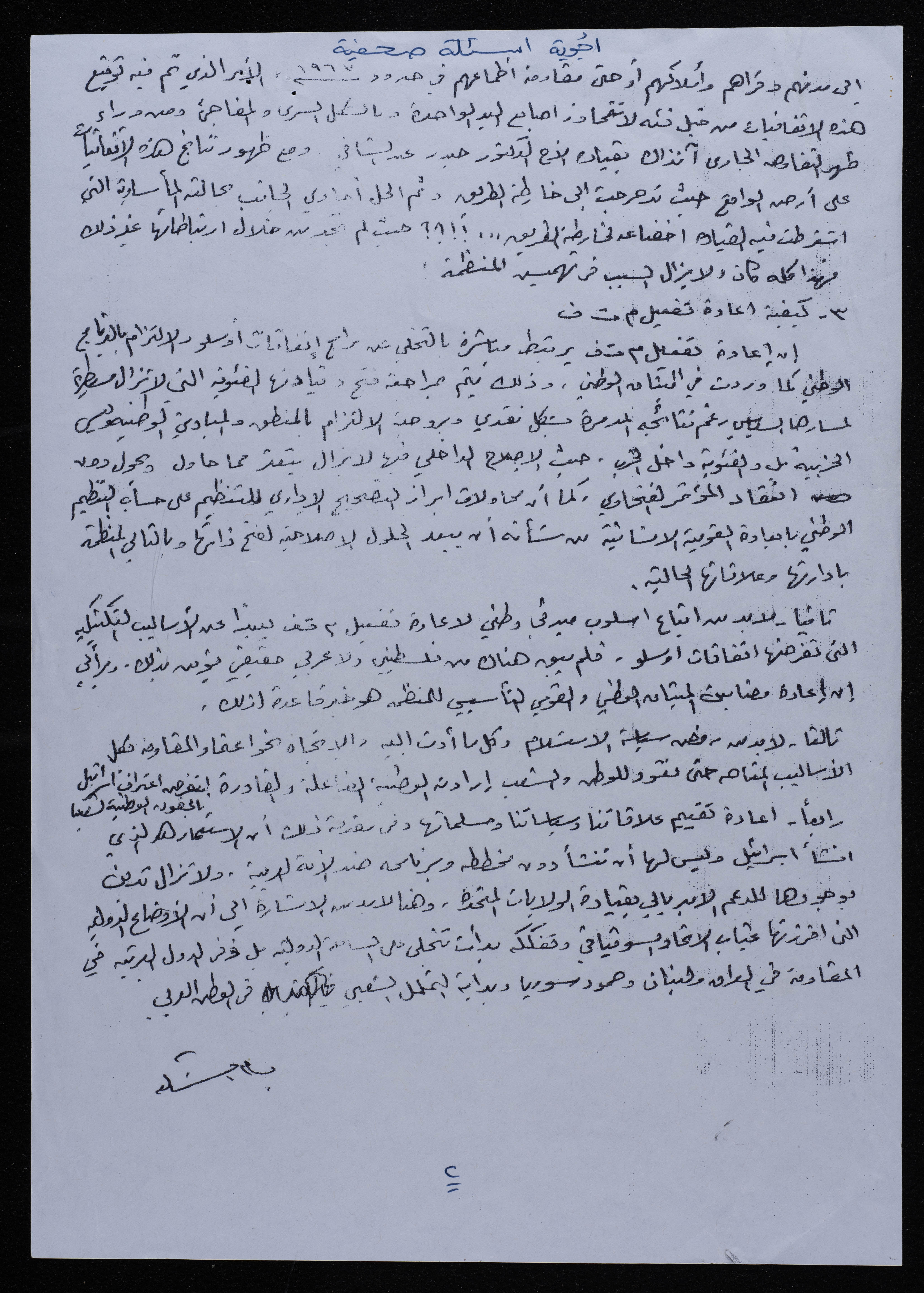 A document containing responses written by Bassam ash-Shakʿa to a collection of questions. Among the responses, Bassam ash-Shakʿa explains that Hamas did not recognise the Palestine Liberation Organization (PLO) due to historical reasons, one of which is the difference between religious thought and national authorities.