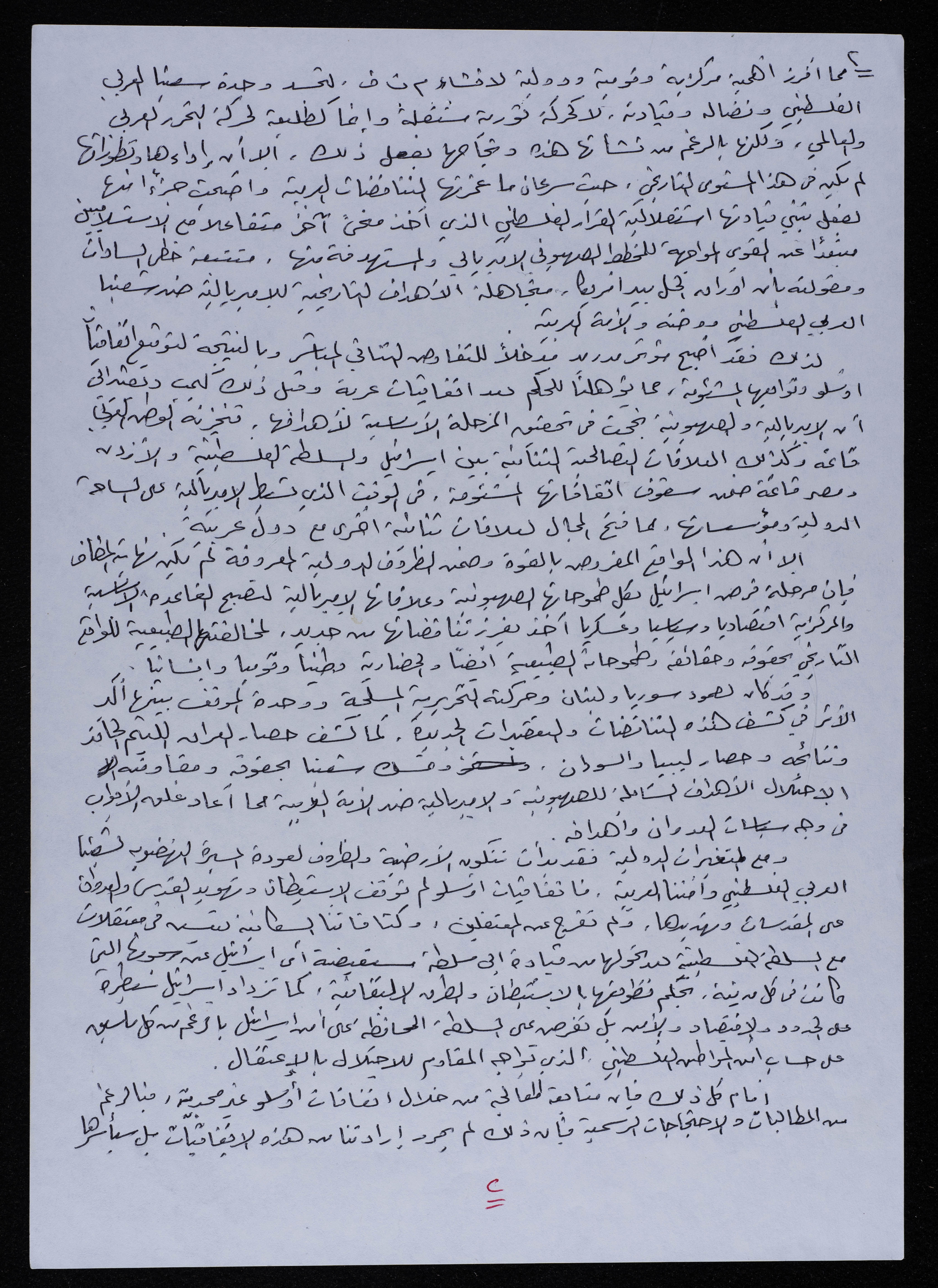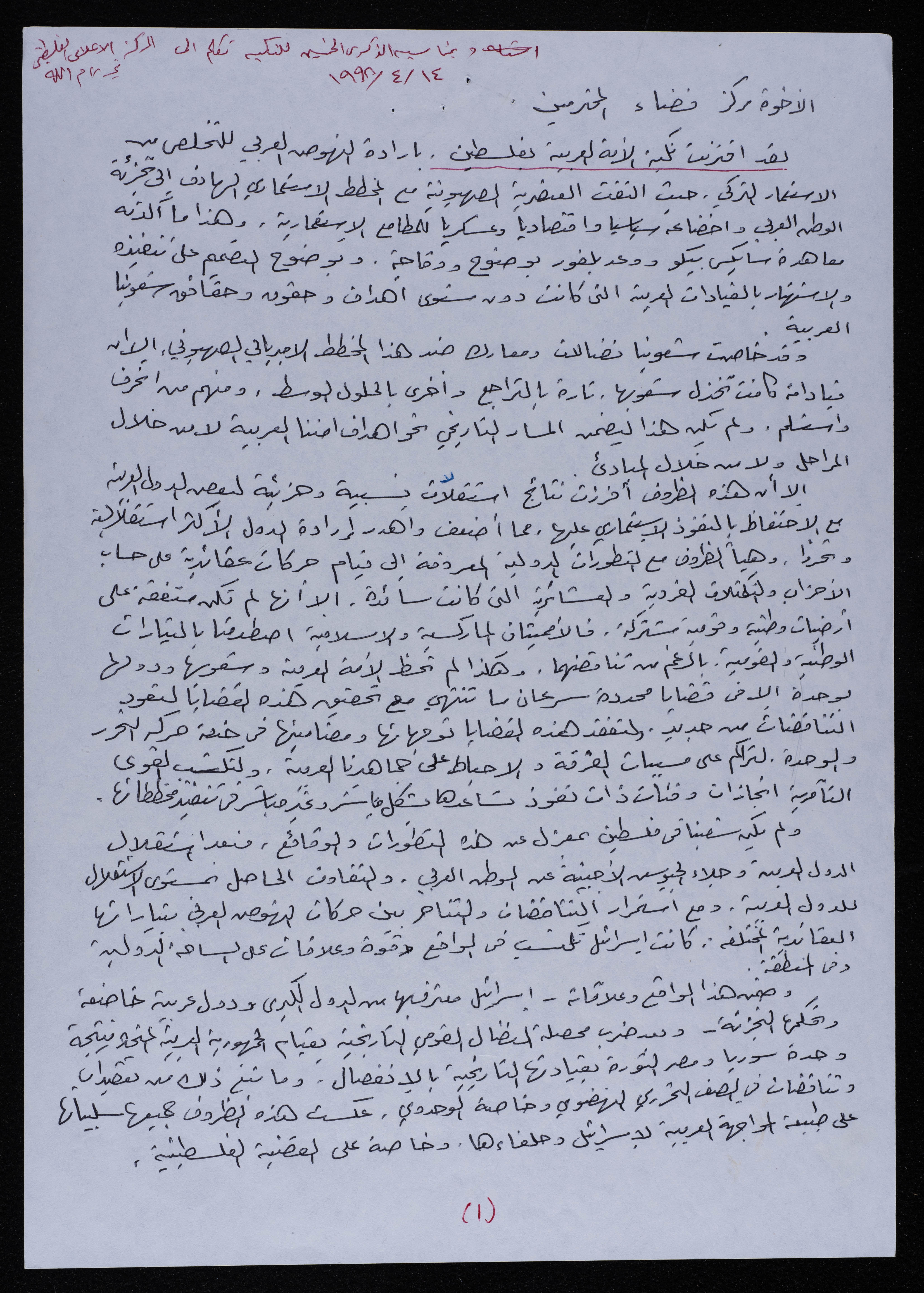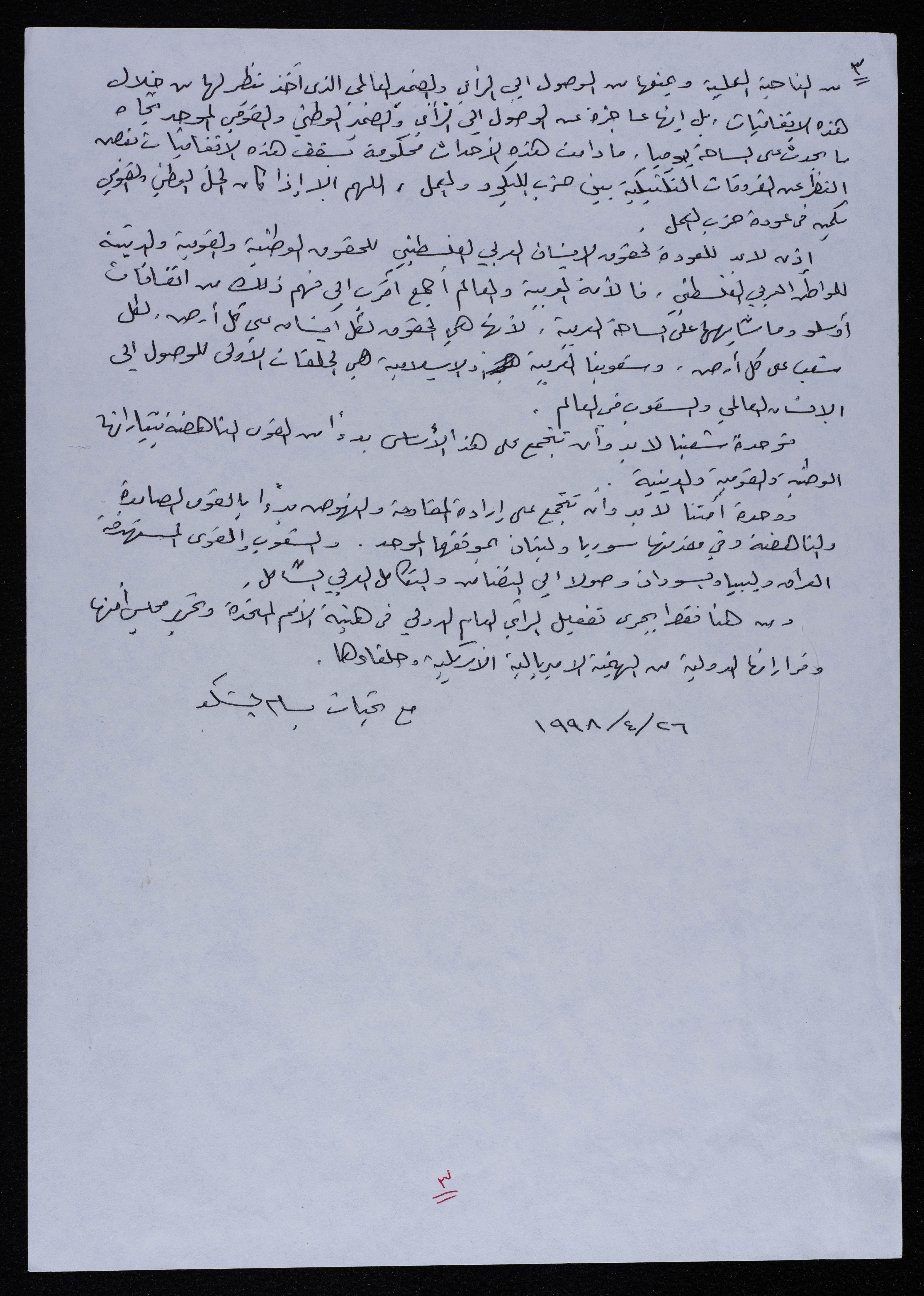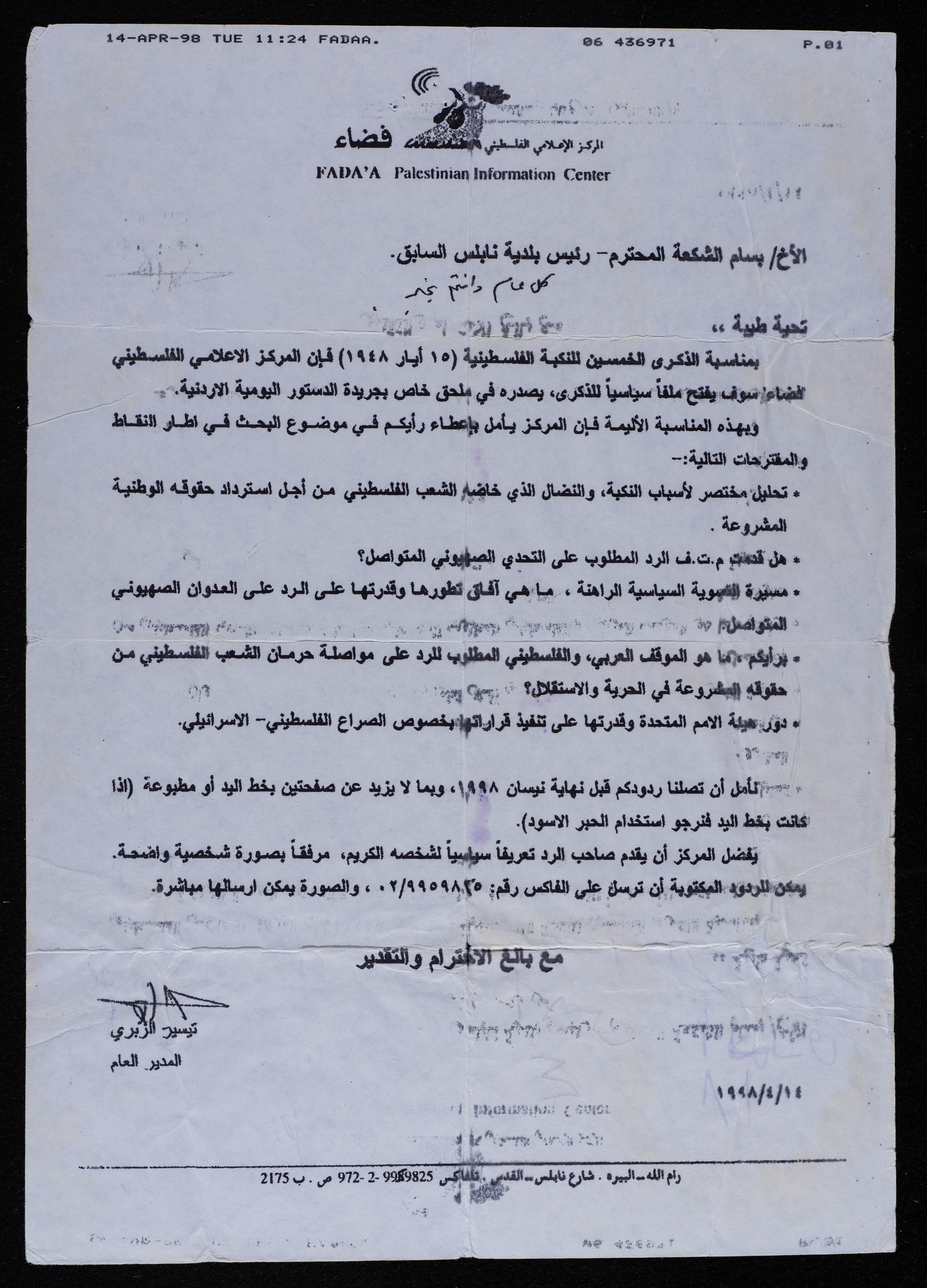A letter addressed by the Palestinian Information Center (FADA) to Bassam ash-Shakʿa on opening up a political file for the 50th anniversary of the Palestinian Nakba, 15 May 1948.
