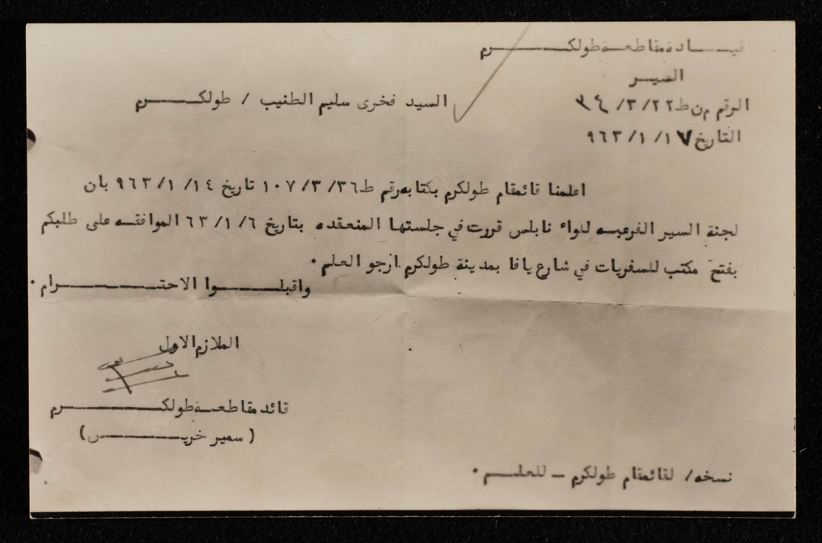 رسالة إلى فخري الطنيب من قائد مقاطعة طولكرم يفيده بموافقة لجنة السير الفرعية للواء نابلس على طلب فتح مكتب للسفريات في شارع يافا في مدينة طولكرم