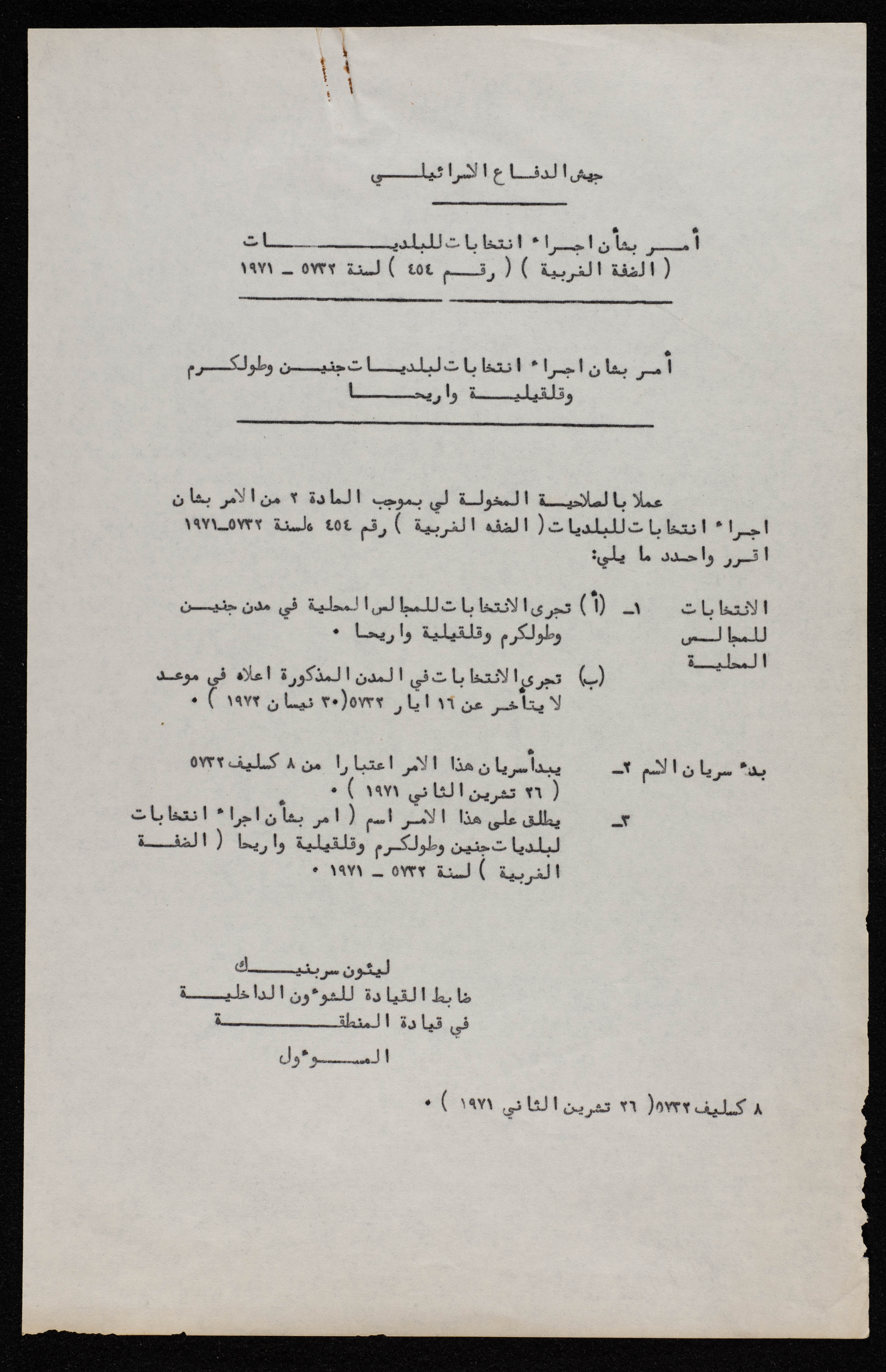 أمر من جيش الاحتلال صادر عن ضابط القيادة للشؤون الداخلية بشأن اجراءانتخابات بلديات طولكرم وجنين وقلقيلية وأريحا لعام 1971.