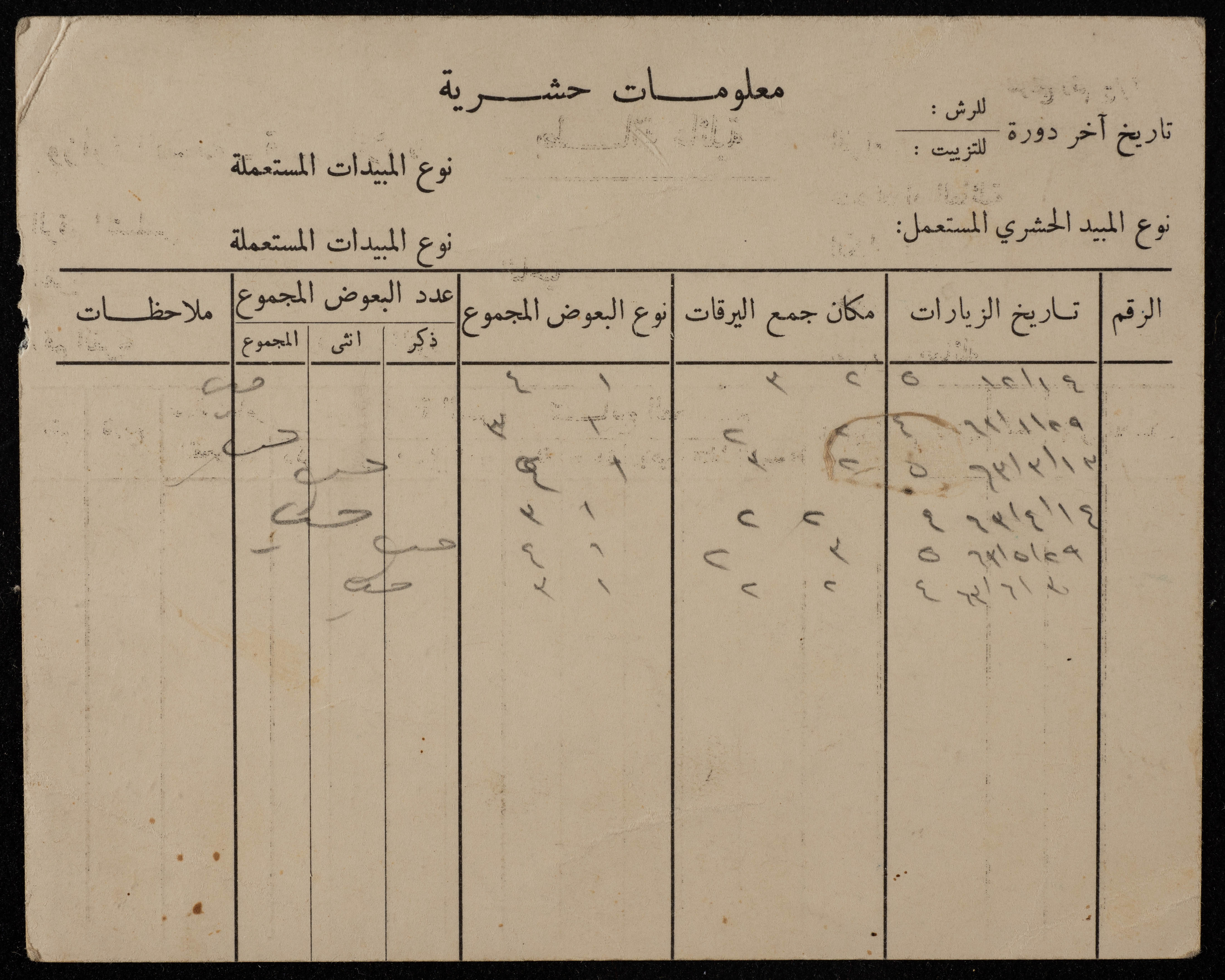 بطاقة عائلية صادرة عن قسم الملاريا في وزارة الصحة عن عائلة عبد العزيز سليم الريماوي فيها تسجيل تواريخ فحص أفراد العائلة. ومرفق بها وثيقة المعلومات عن المبيدات الحشرية.