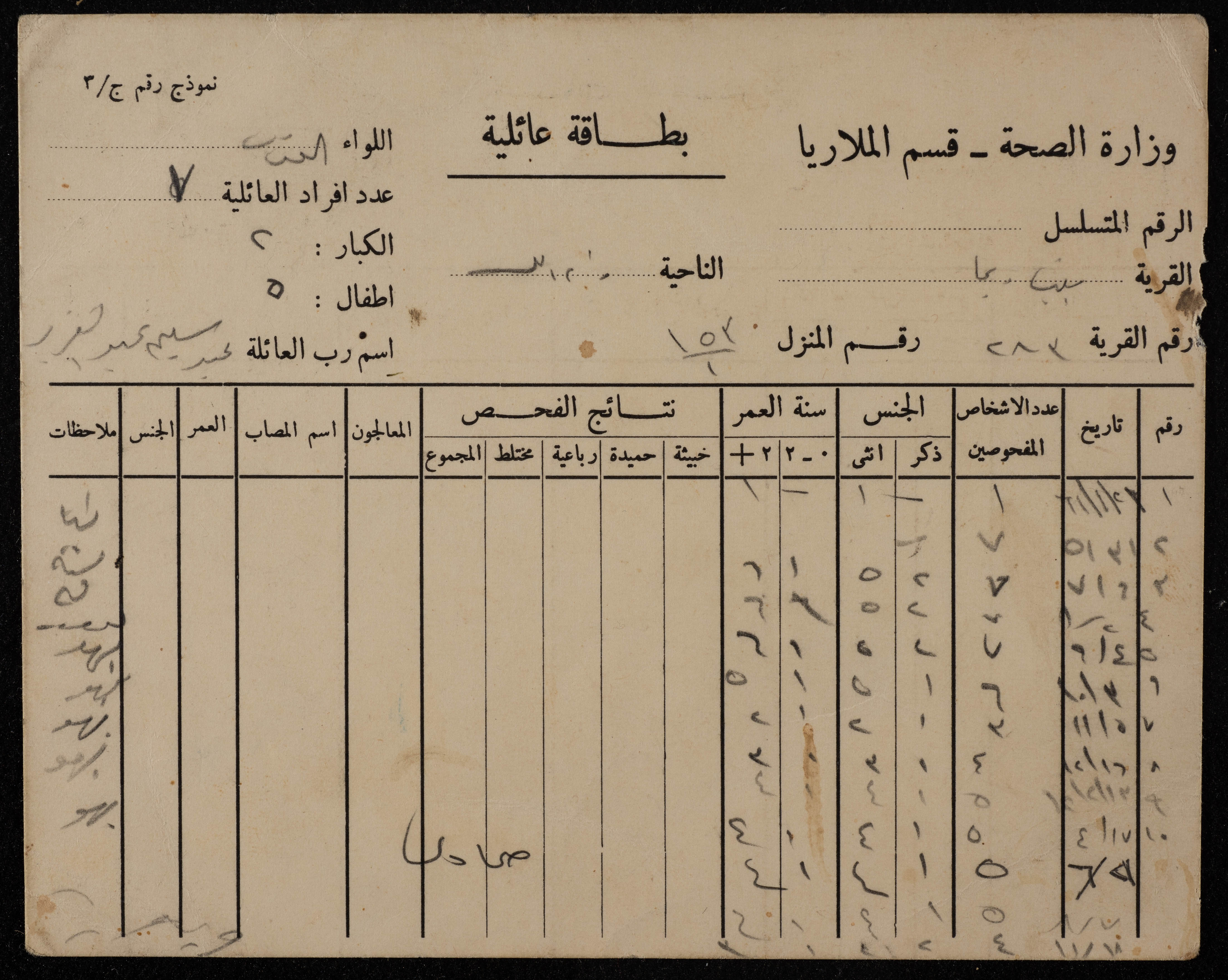 بطاقة عائلية صادرة عن قسم الملاريا في وزارة الصحة عن عائلة عبد العزيز سليم الريماوي