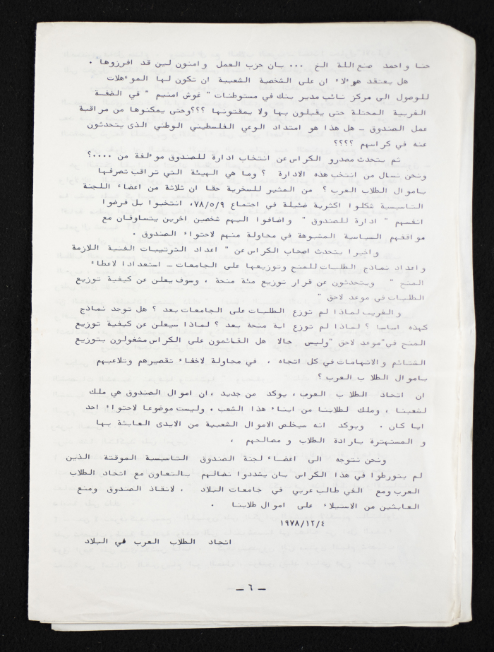 "The Loans and Grants Fund Should Become a Useful Tool to Help Arab Students", a Statement Issued by the National Union of Arab Students, 1978