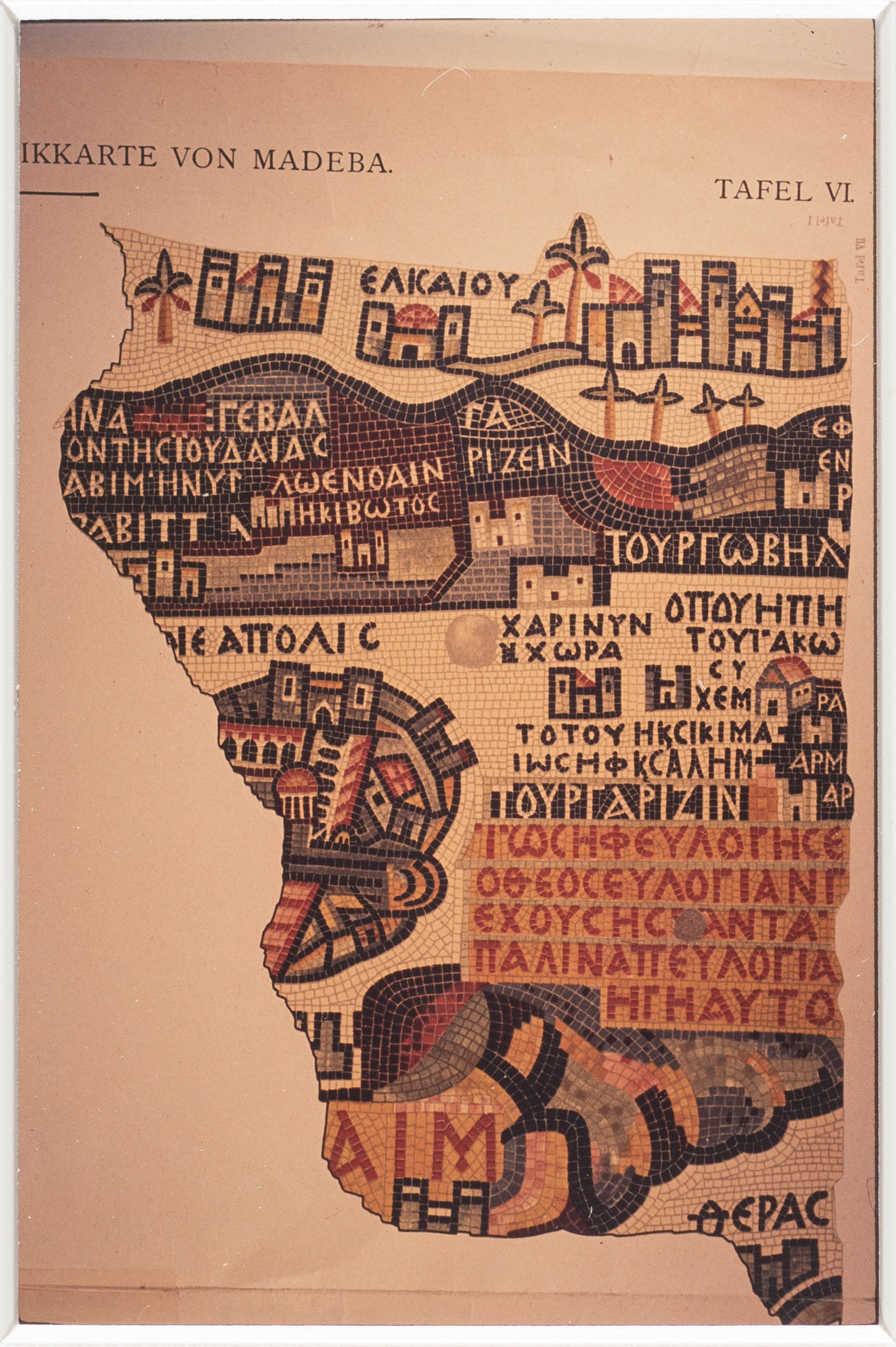 A colour photograph snipped of a book featuring part of Madaba's Mosiac map, this map is located on the ground of the Orthodox church in the Jordanian city of Madaba, as this map is considered to be the third most important Antiquity in Jordan after the cities of Petra and Jarash.