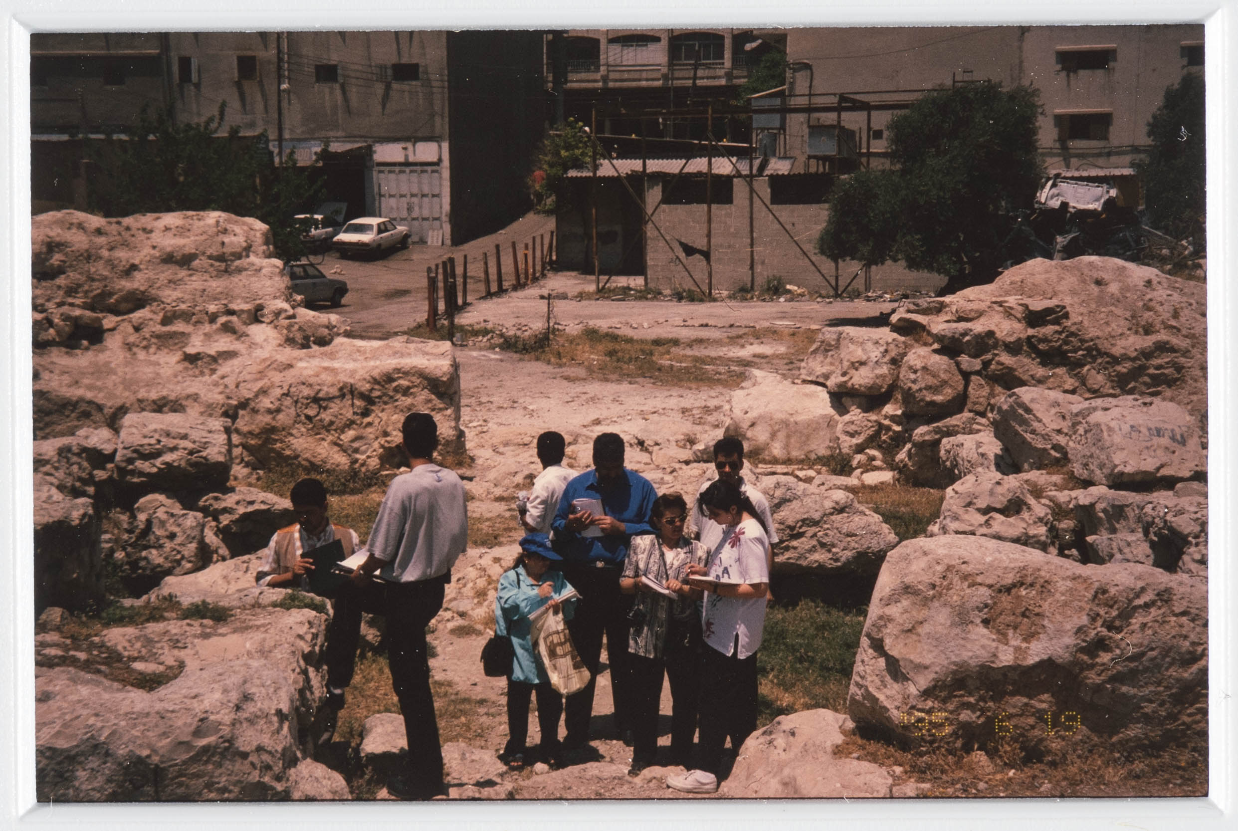 صورة ملونة يظهر فيها مجموعة من الأشخاص الذين قدموا لاستكشاف منطقة تل بلاطة الأثرية، وجدت الصورة في ارشيف ابراهيم الفني.
