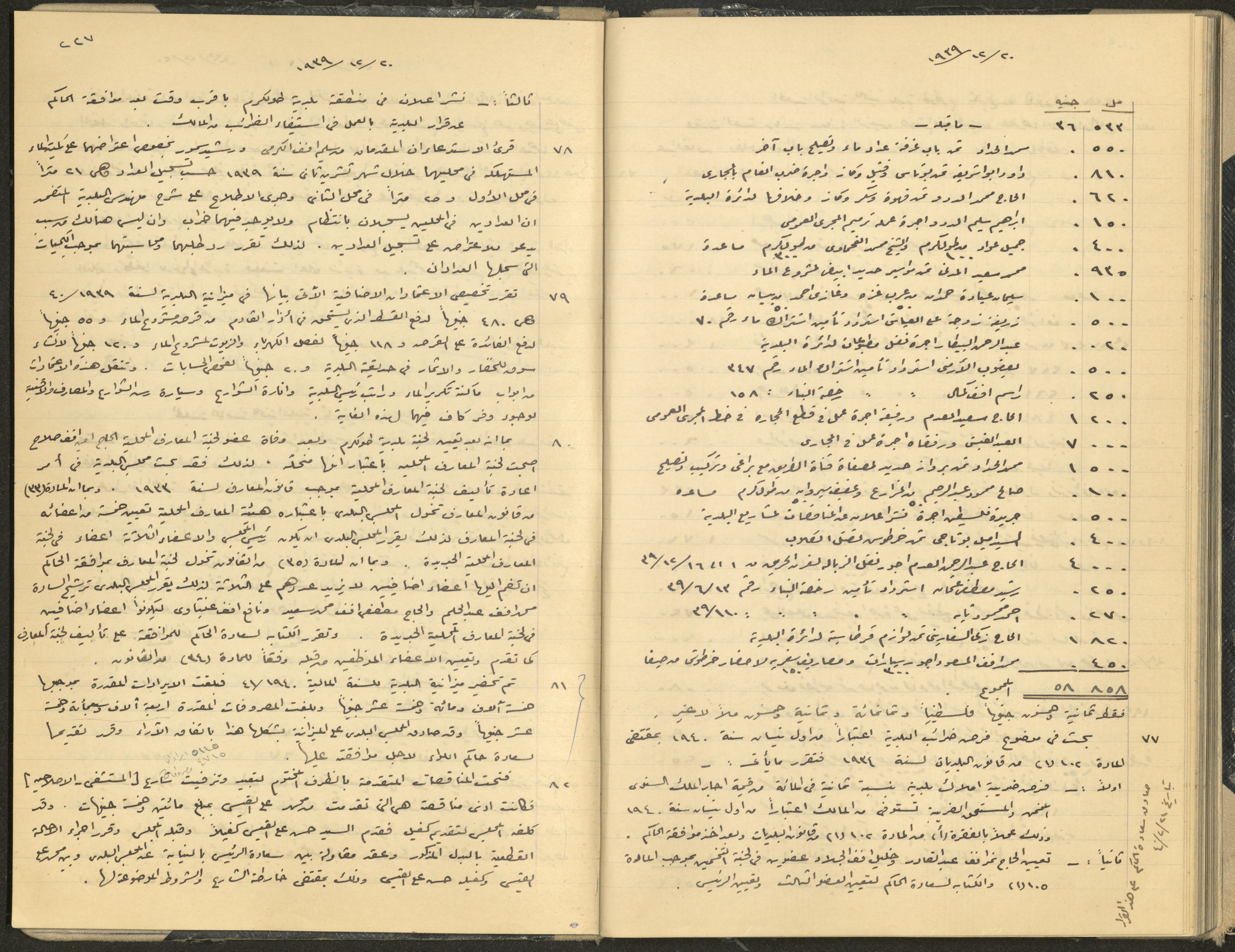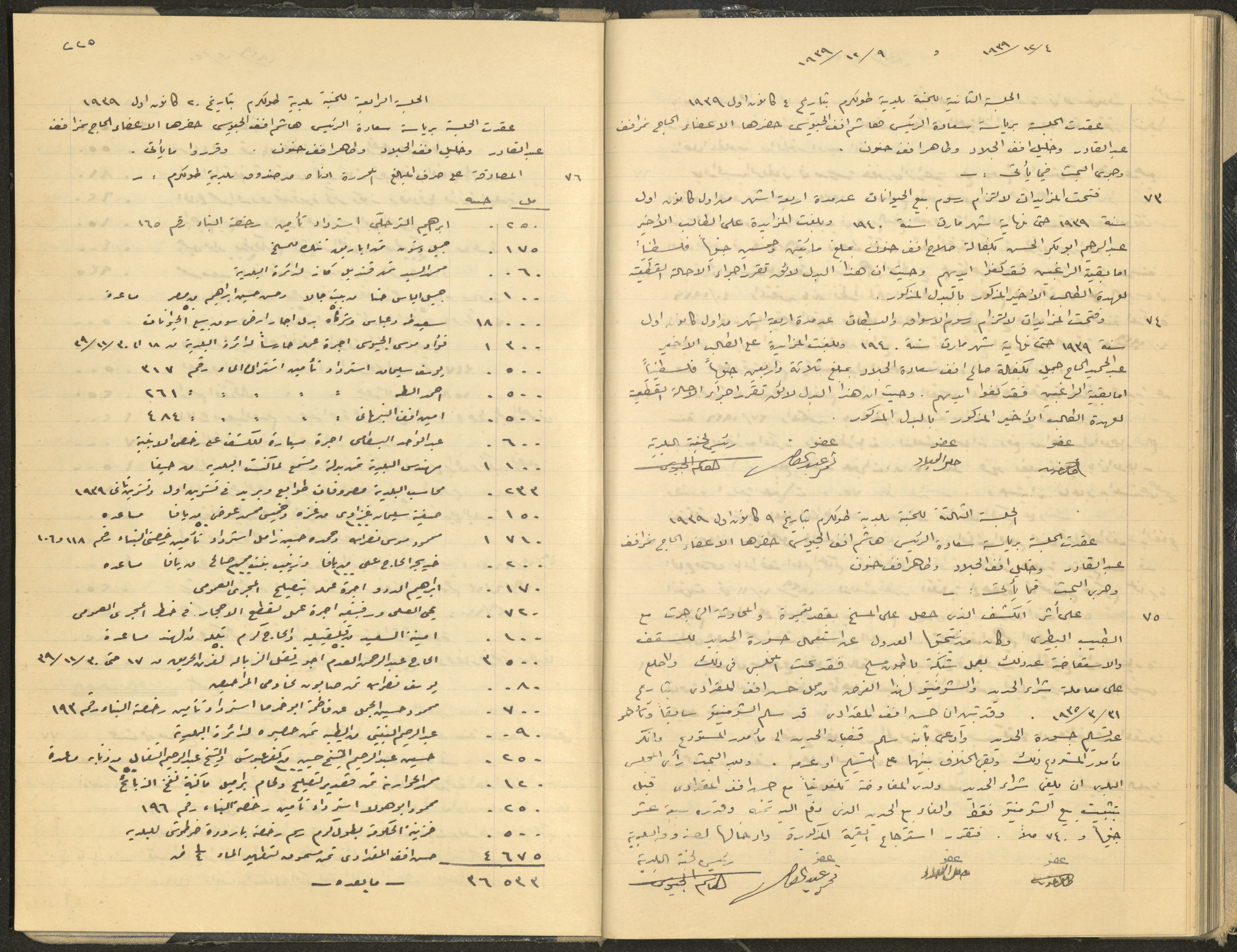 وثيقة مكتوبة بخط اليد ضمن سجل قرارات بلدية طولكرم، وهي عبارة عن محضر جلسة لمجلس بلدي المدينة، بتاريخ 4 كانون أول 1939 وجلسة بتاريخ 9 كانون أول 1939، تضمنتا عدة قرارات اتخذها المجلس تتعلق بتقديم خدمات للسكان وإدارة شؤونهم.