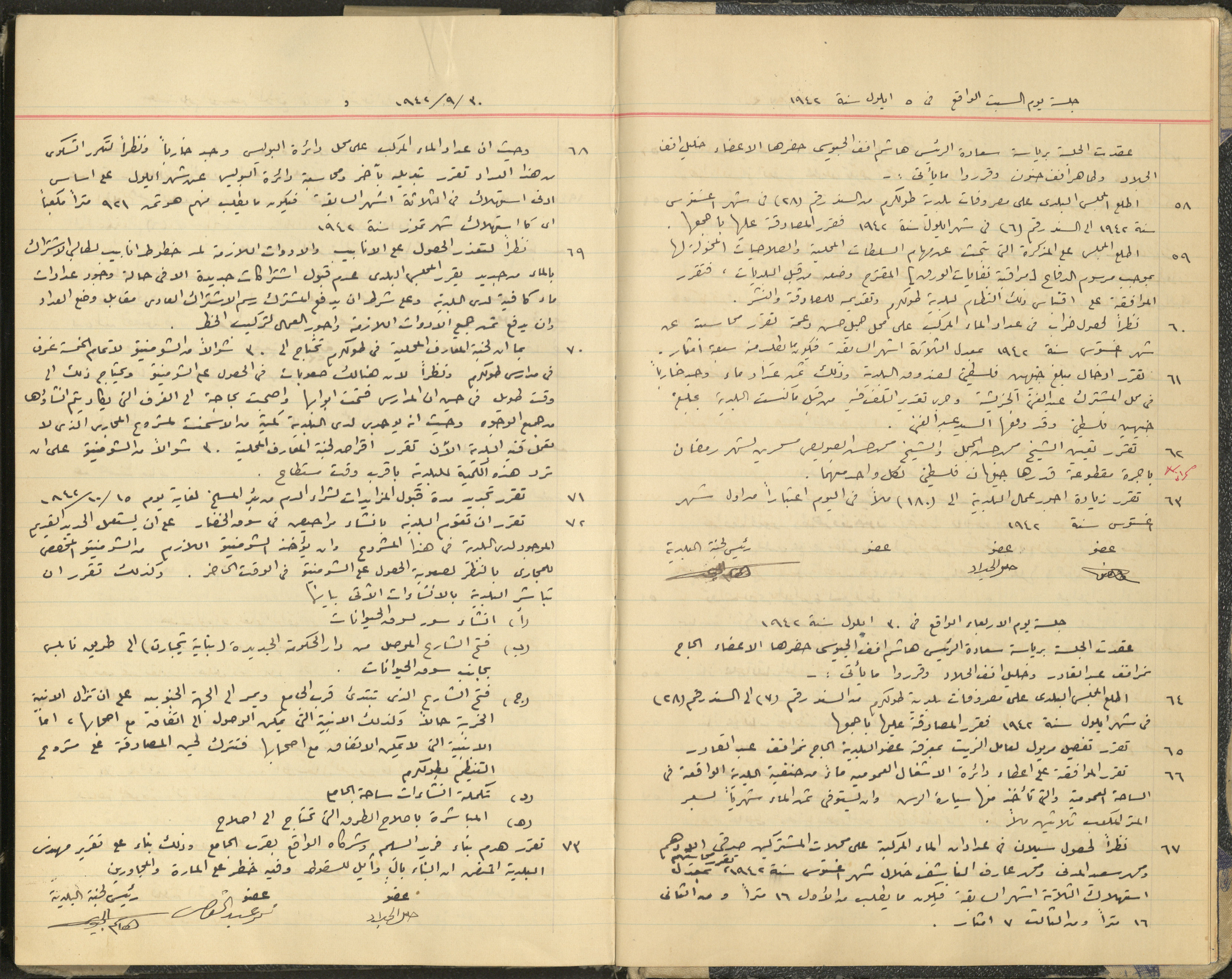 وثيقة مكتوبة بخط اليد ضمن سجل قرارات بلدية طولكرم، وهي عبارة عن محضر جلسة لمجلس بلدي المدينة، بتاريخ 5 أيلول 1942 وجلسة بتاريخ 30 أيلول 1942، تضمنتا عدة قرارات اتخذها المجلس تتعلق بتقديم خدمات للسكان وإدارة شؤونهم.