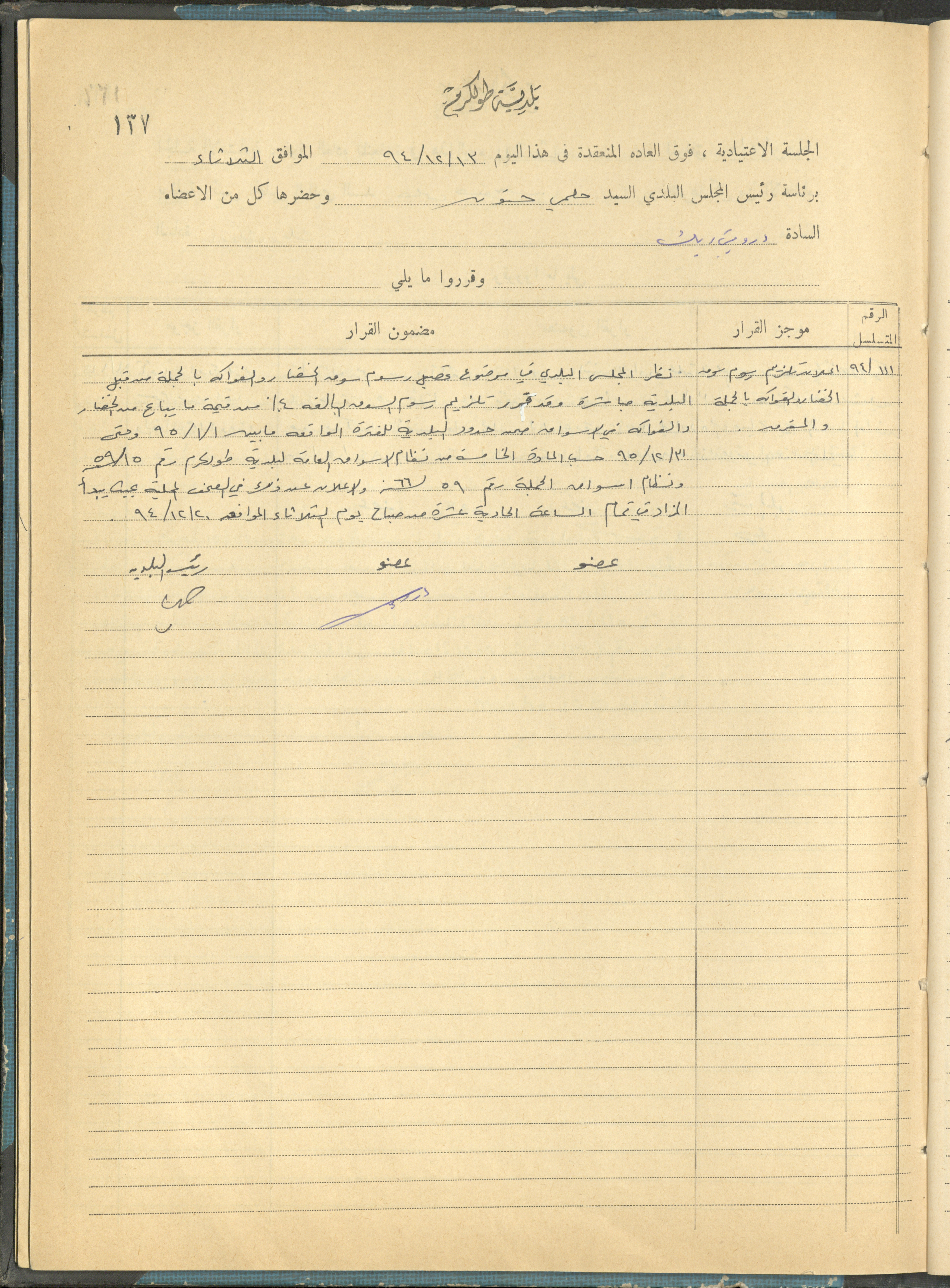 Found in the Tulkarm Municipality records, these are handwritten minutes of the municipal meetings. The notes record the proceedings and decisions made by the municipality on service provision and local population affairs.