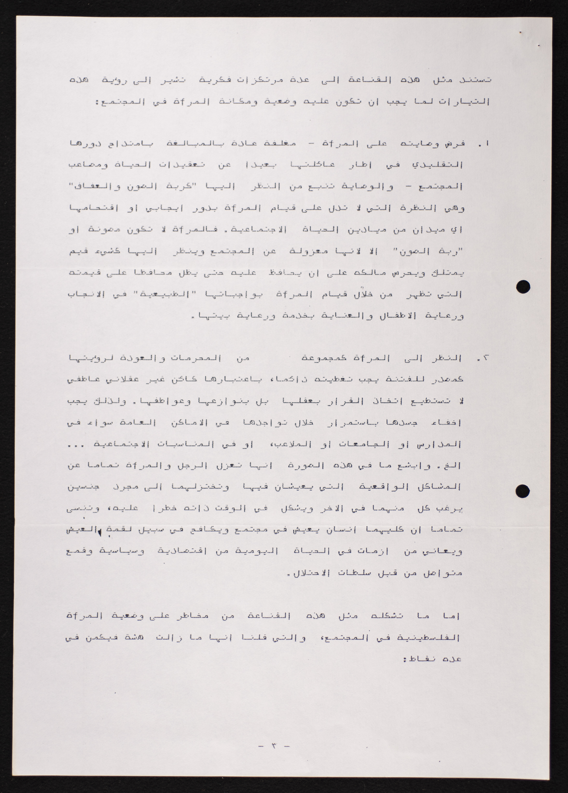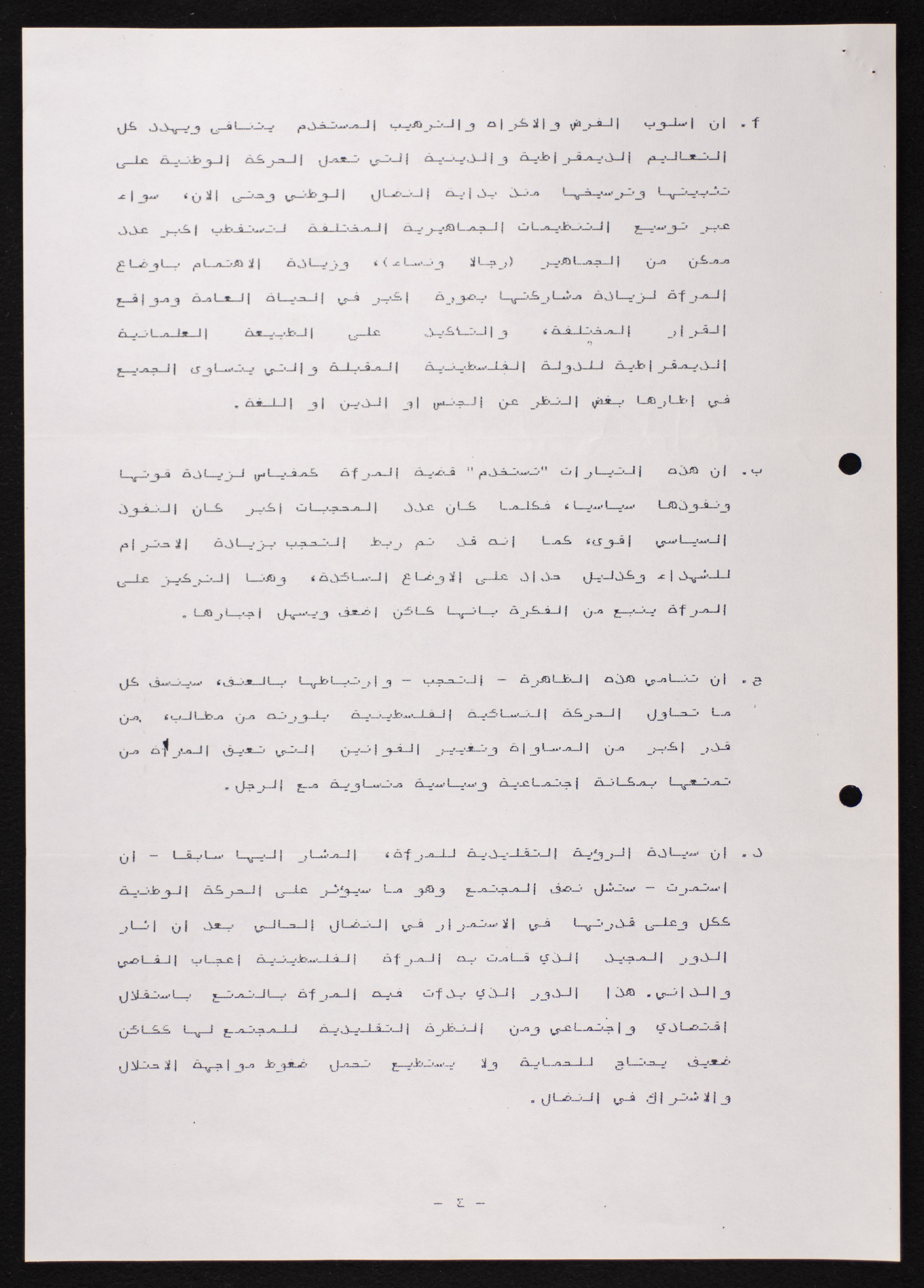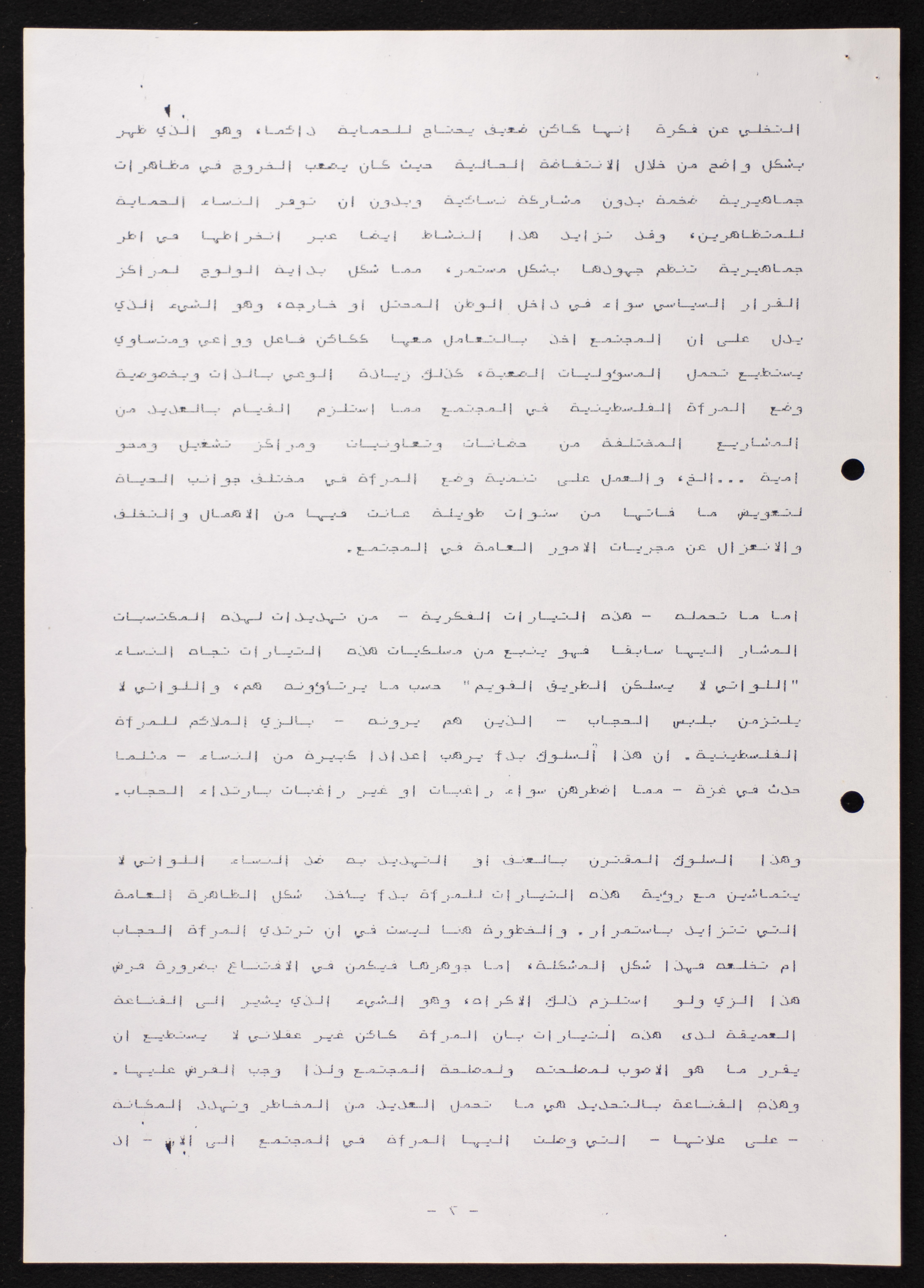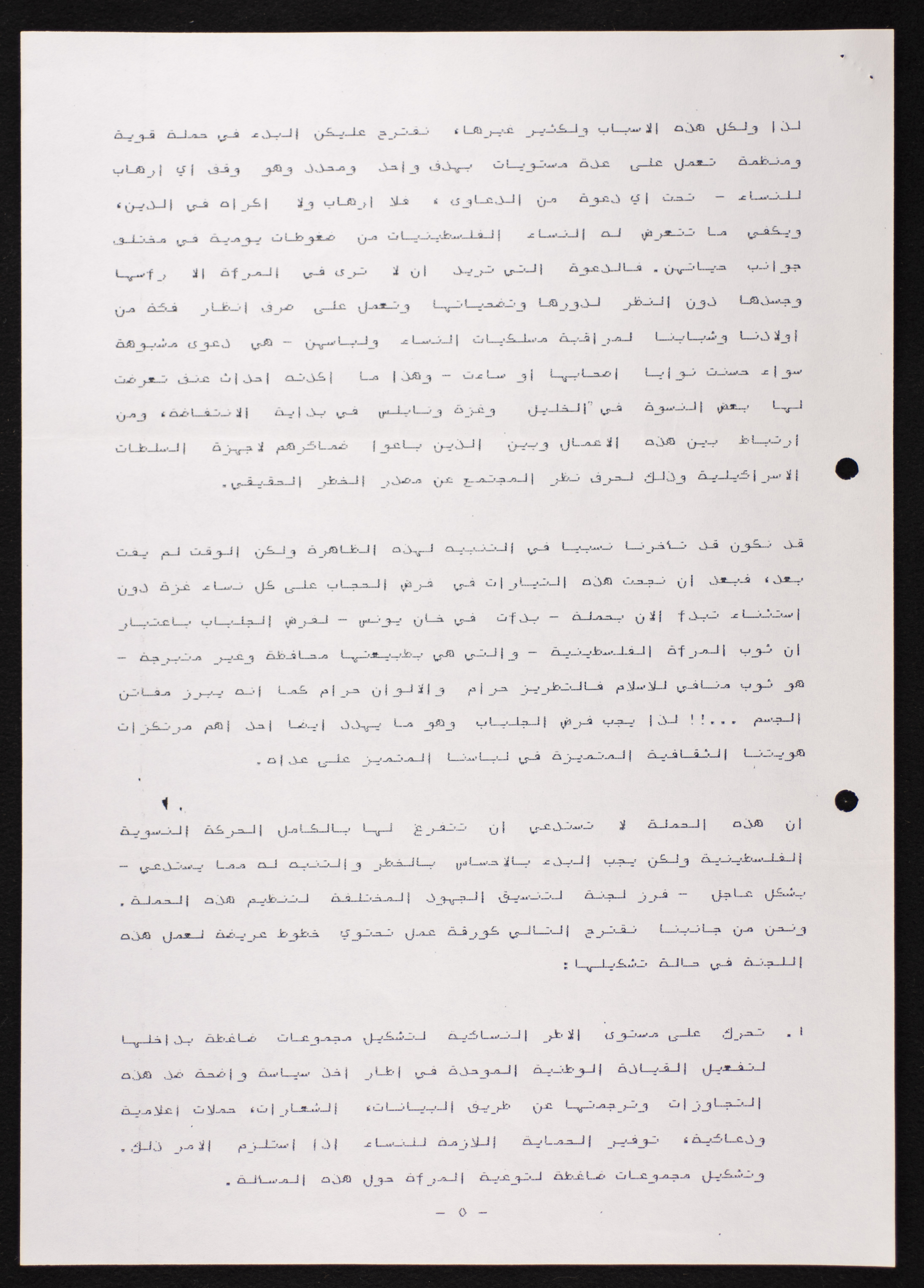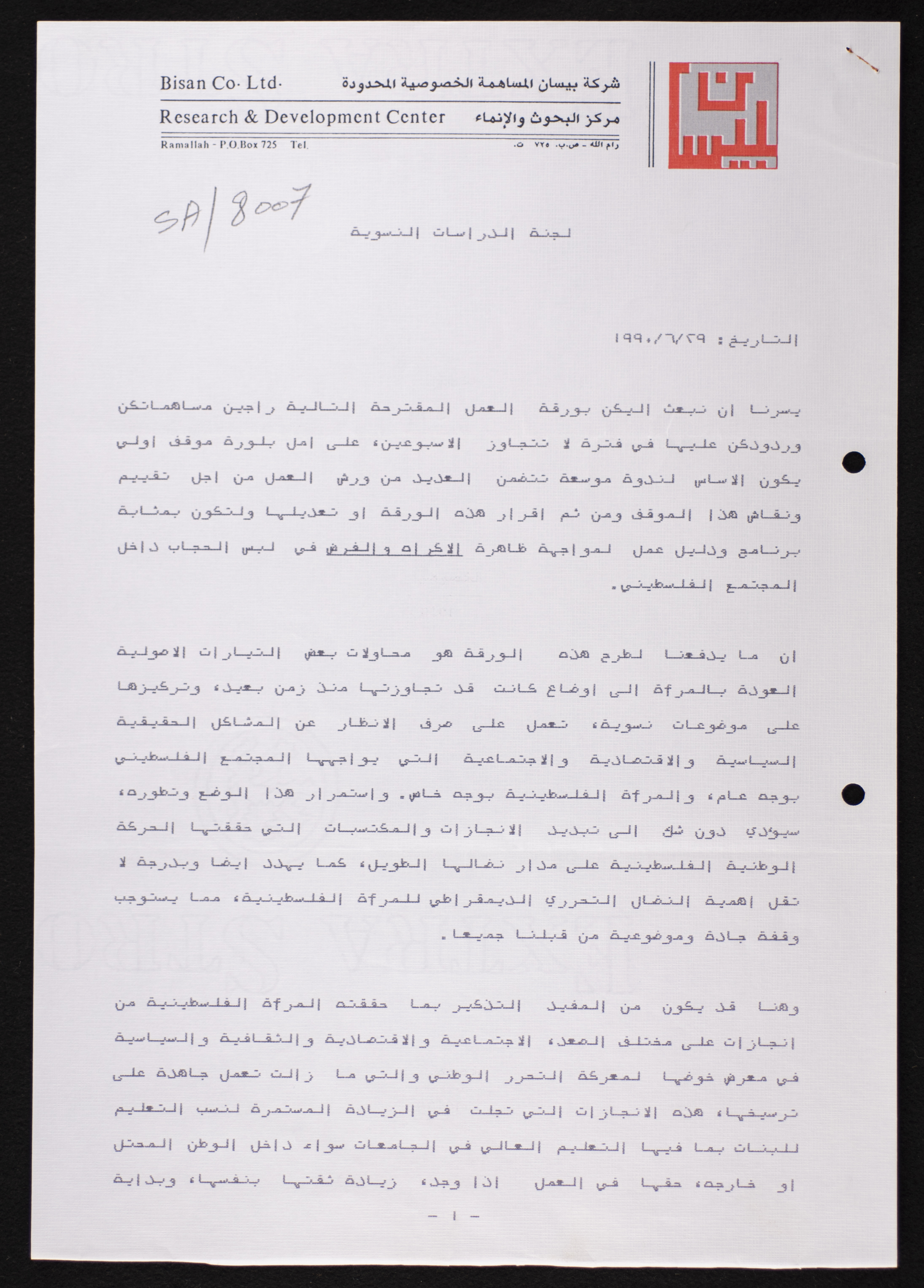 Printed in Arabic, this document shows a worksheet by Bisan Research and Development Centre on forcing the Hijab sent to the Palestinian Federation of Women's Action Committees for suggestions.