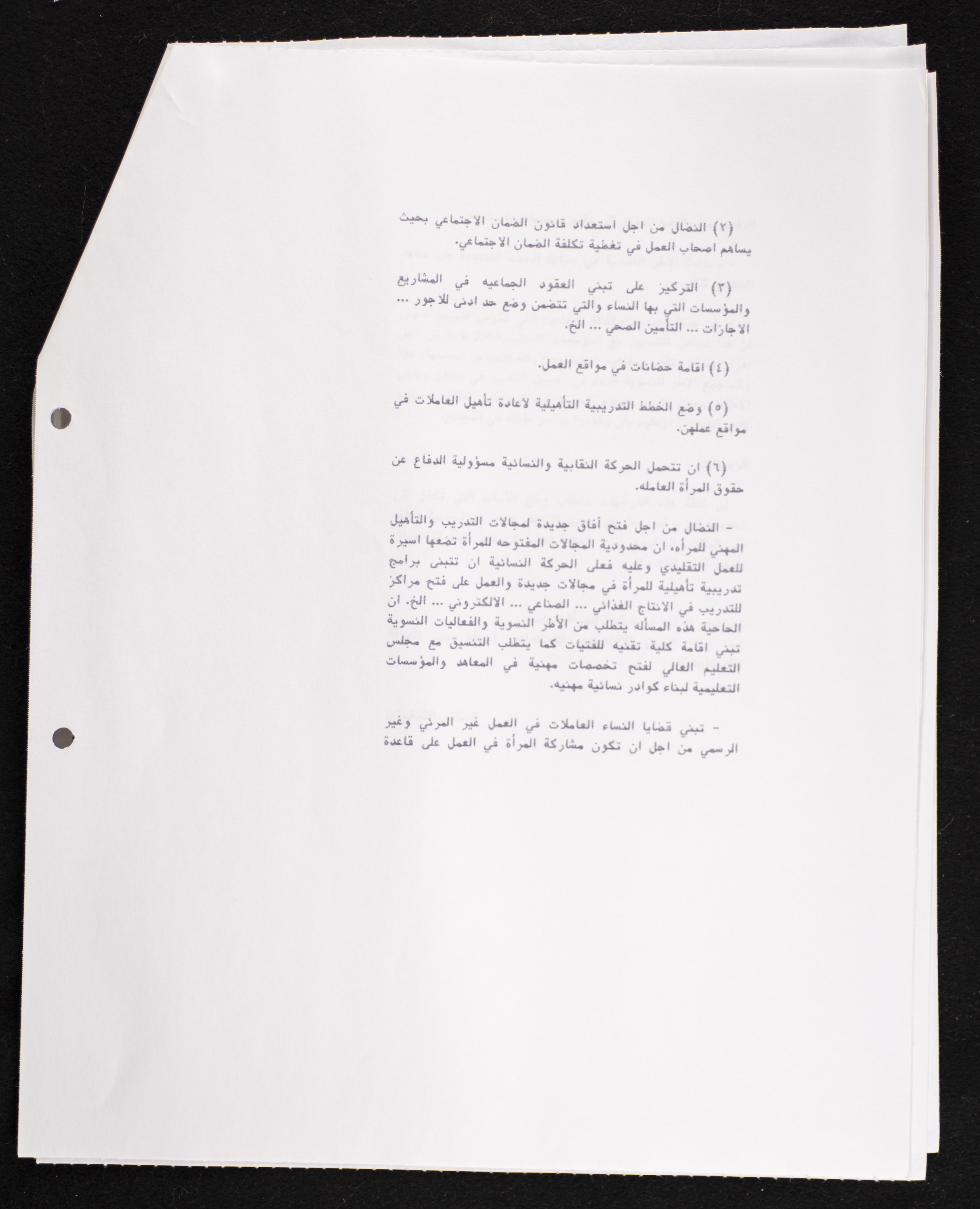 مادة مطبوعة باللغة العربية، صادرة عن المكتب التنفيذي لاتحاد لجان العمل النسائي، تحتوي على توصيات حول ورشة العمل (اليوم الدراسي) التي أعده نظمها الاتحاد بمناسبة الثامن من آذار سنة 1992 بهدف دراسة واقع المرأة العاملة الفلسطينية وتوجهات الحركة النسائية.