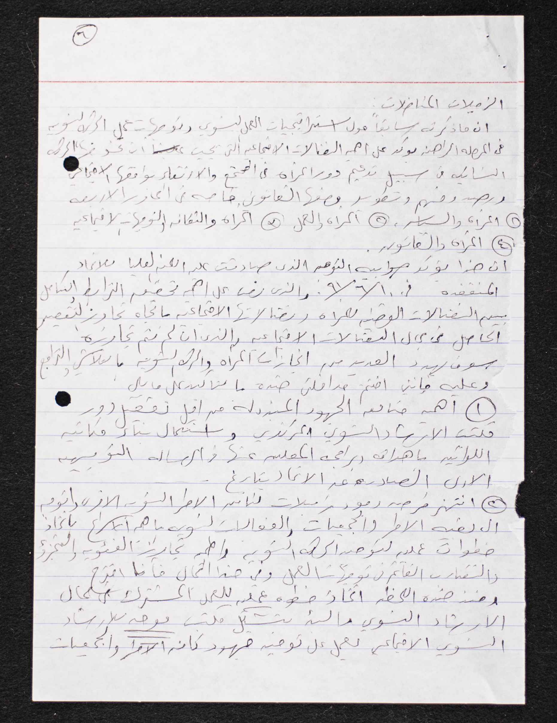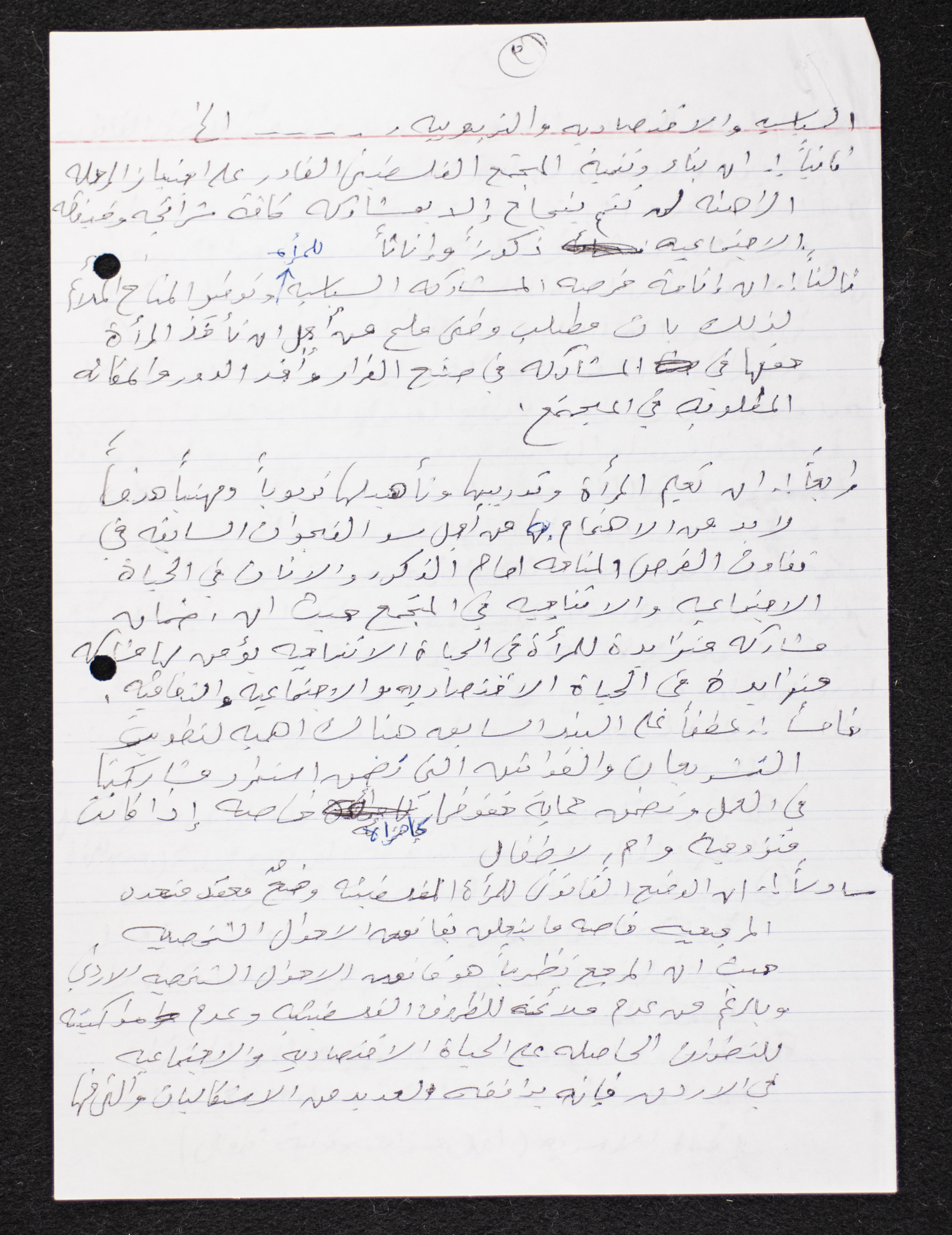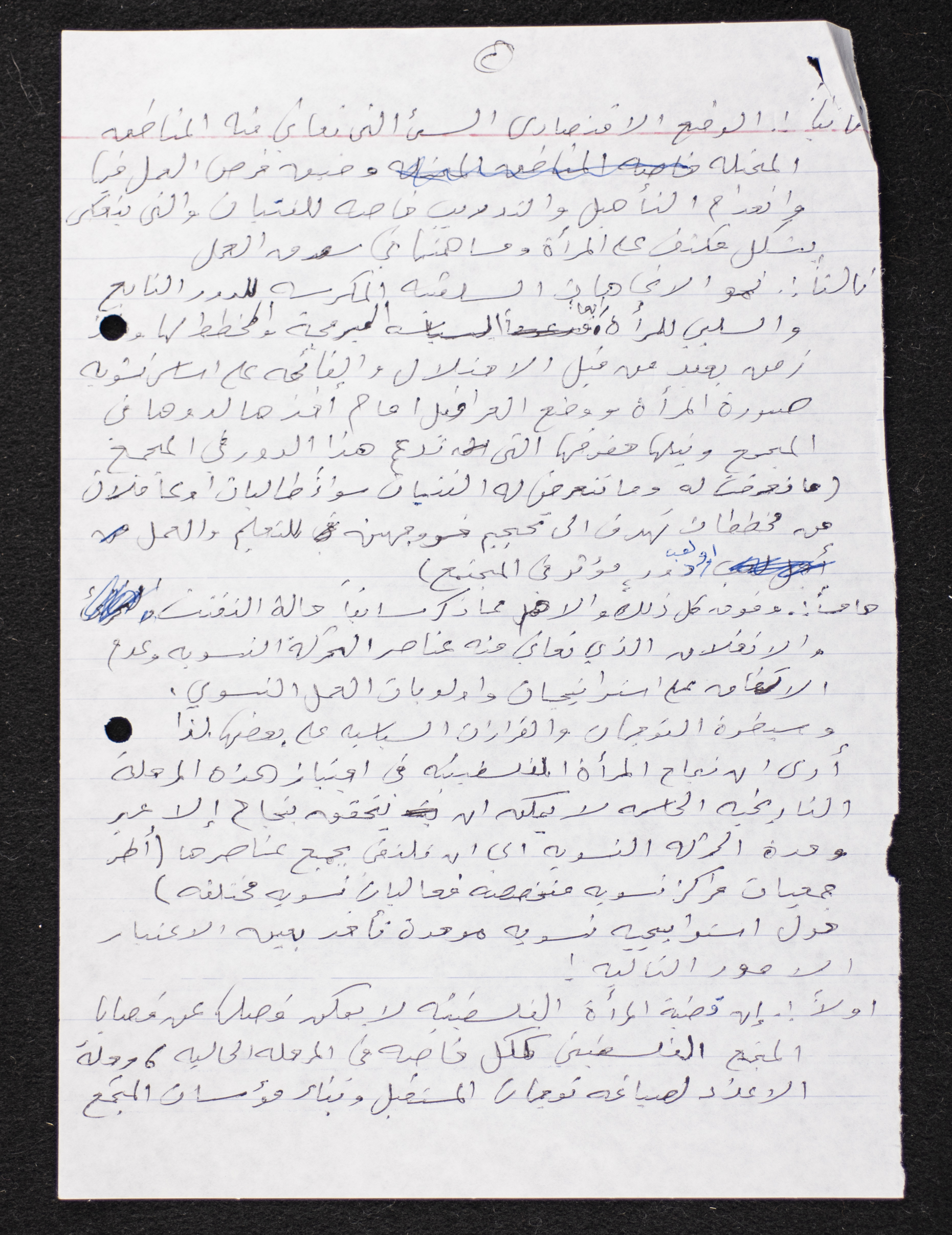 Handwritten in Arabic, this document shows a proposed strategy from the Women Counseling Office of the Palestinian Federation of Women's Action Committees about feminism and their framework.