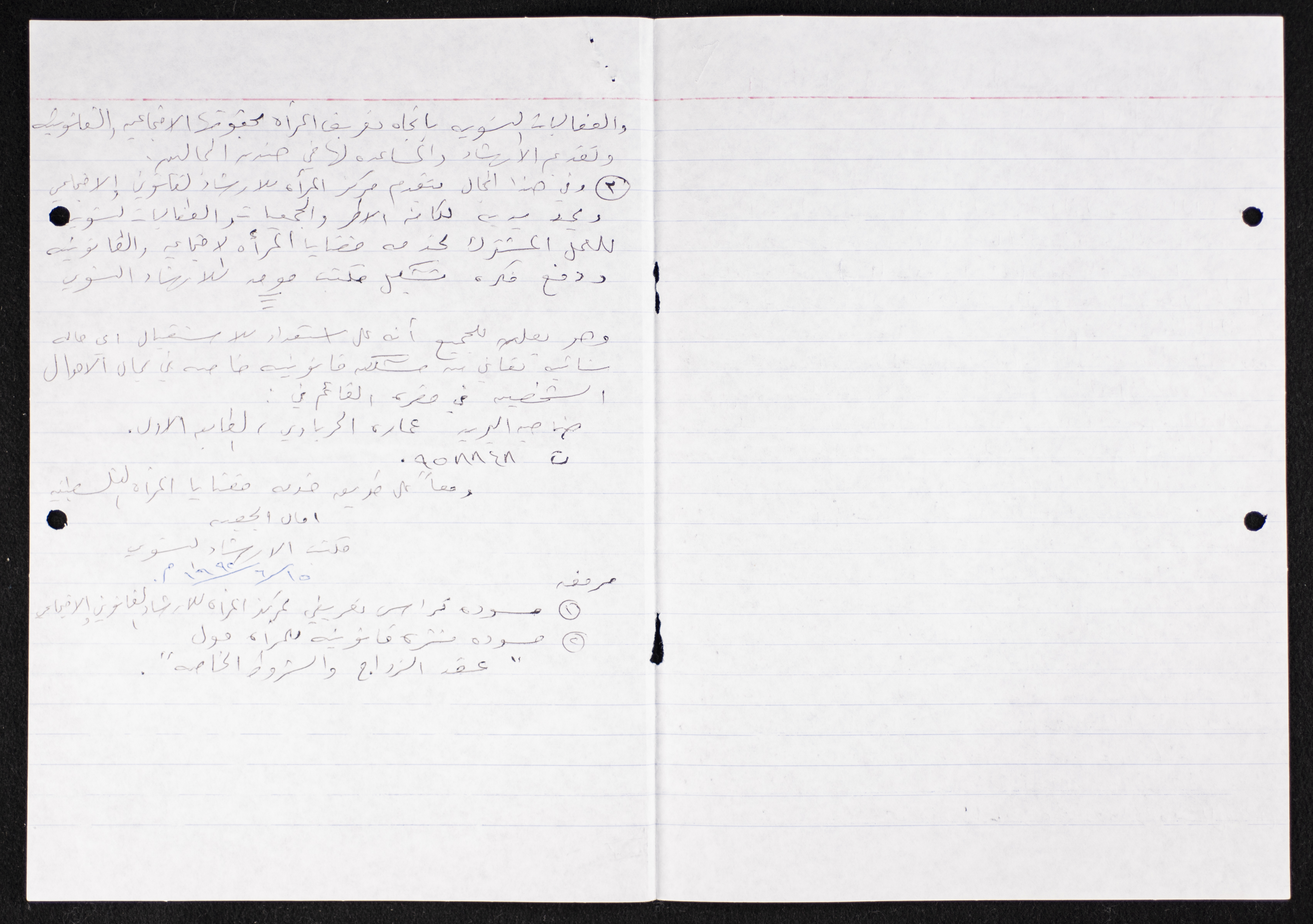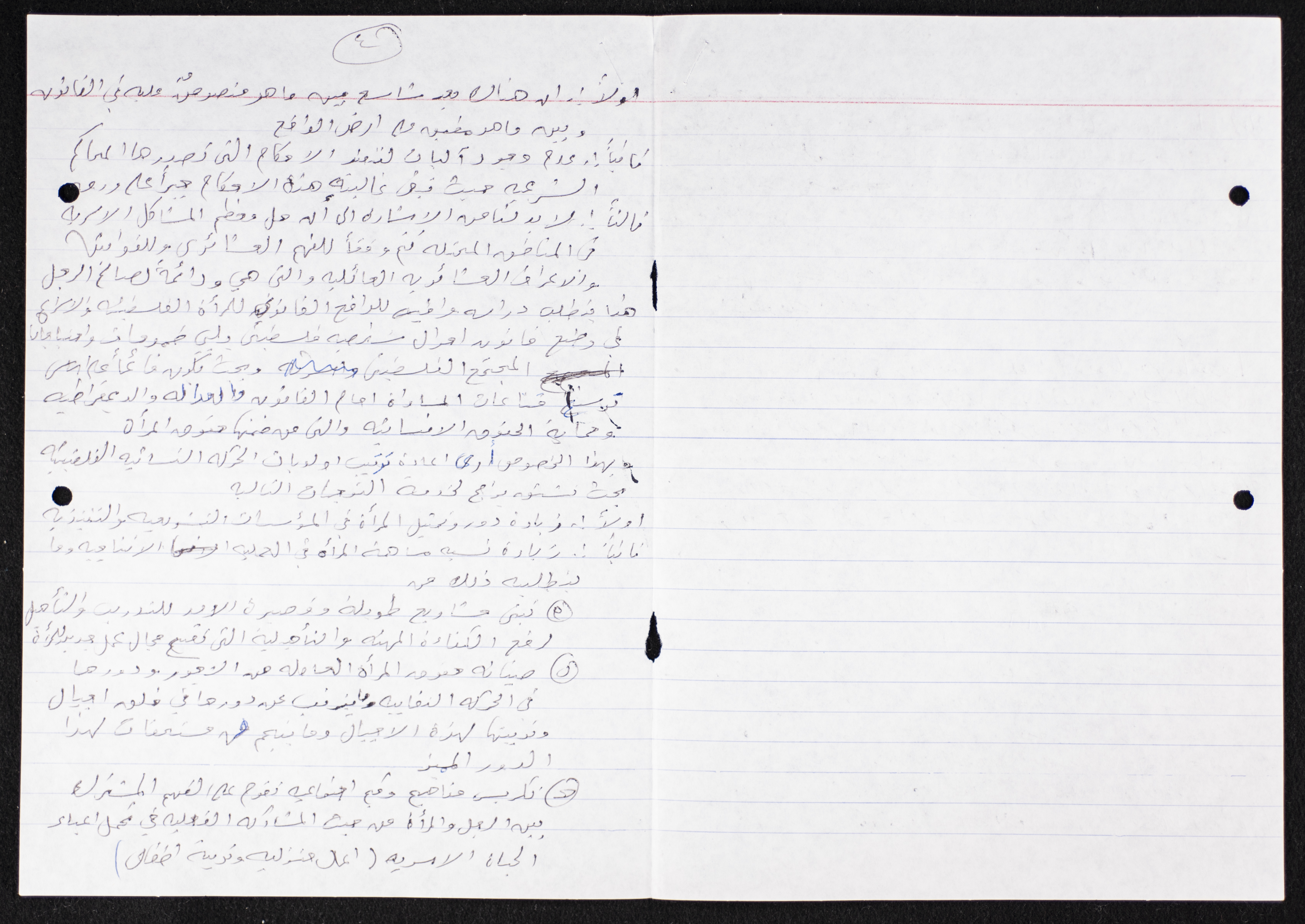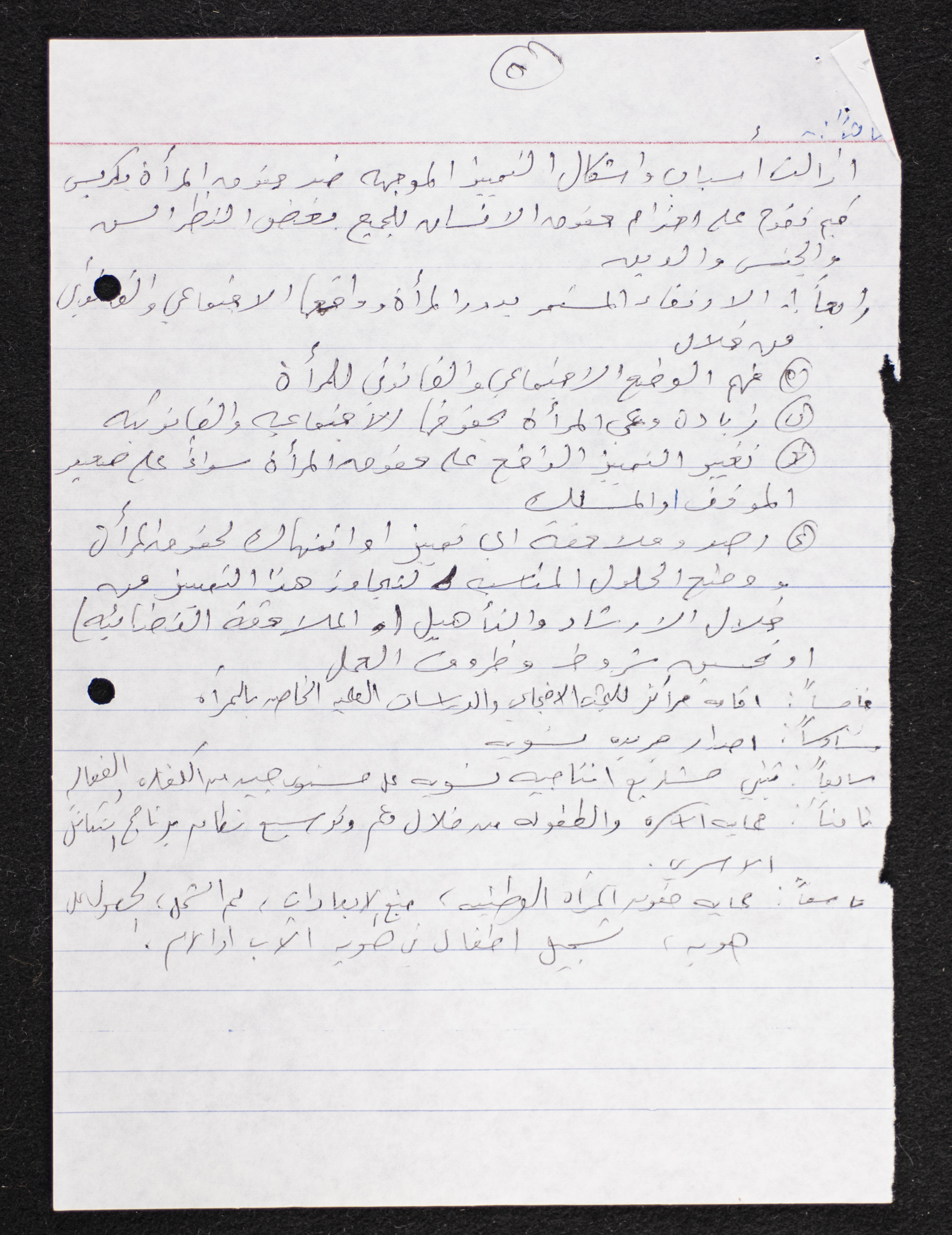 Handwritten in Arabic, this document shows a proposed strategy from the Women Counseling Office of the Palestinian Federation of Women's Action Committees about feminism and their framework.