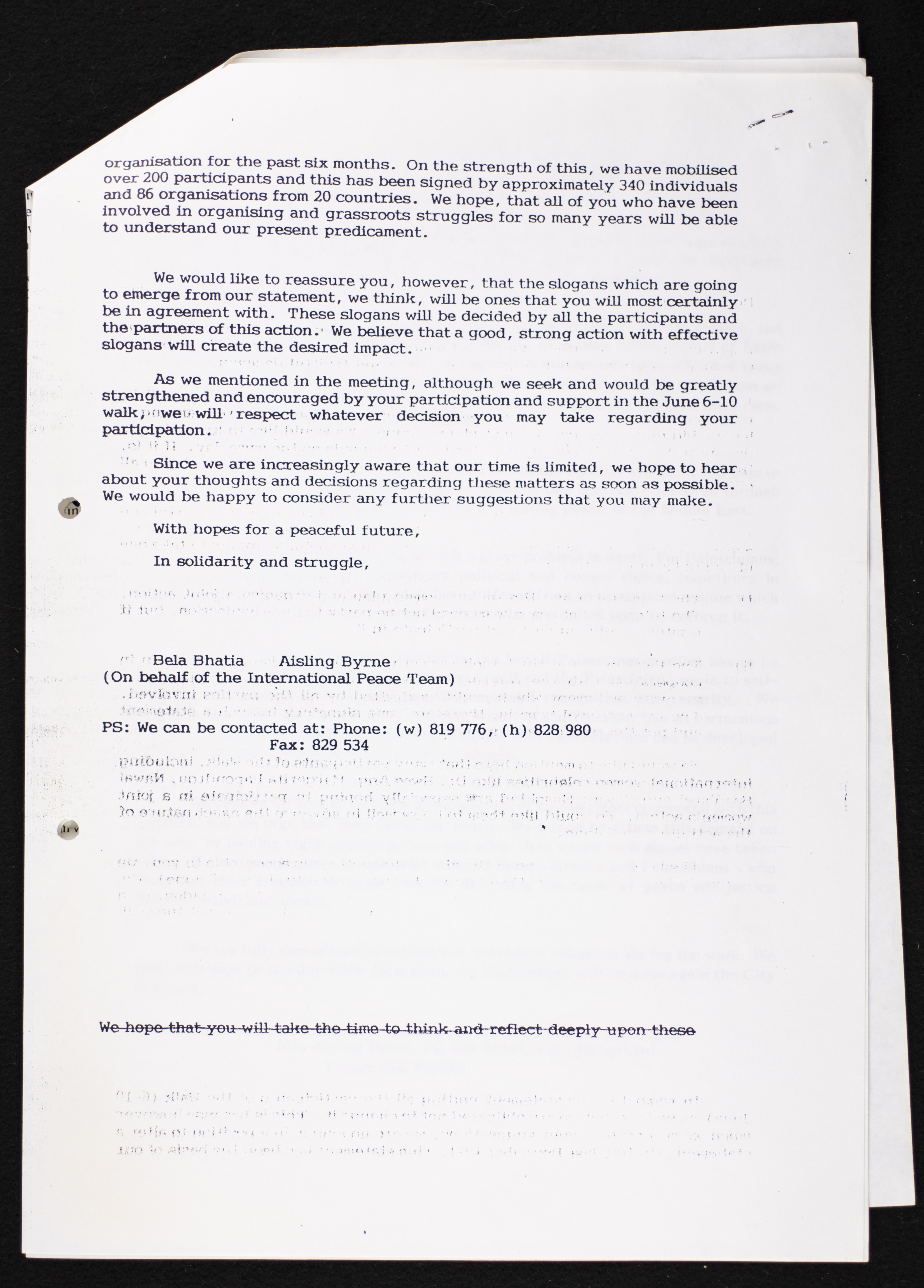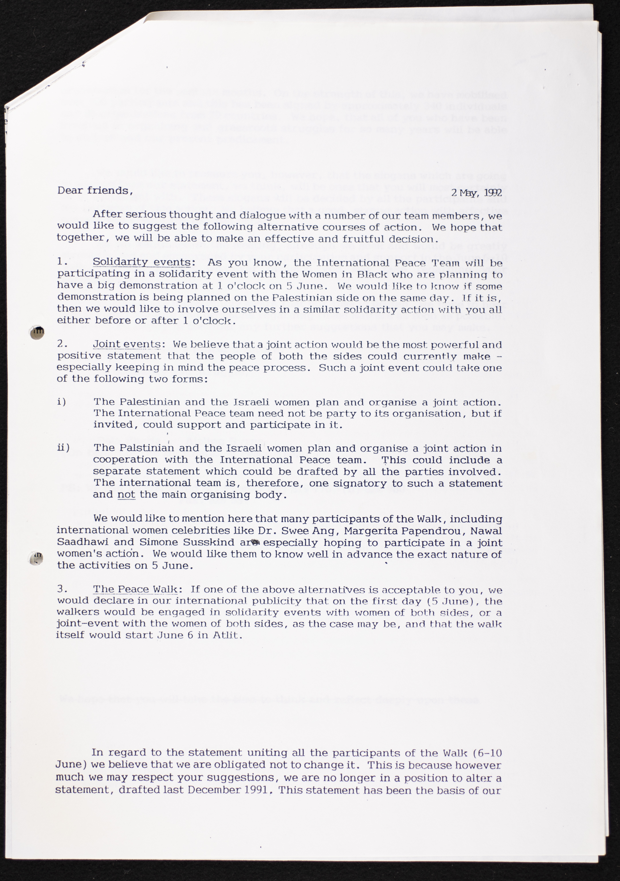مادة مطبوعة باللغة الانجليزية وهي رسالة من فريق السلام العالمي تحتوي على خطة عمل بديلة لتحقيق أهداف الفريق، وجهت الرسالة الى (الأصدقاء الأعزاء) وقد كتب في نهايتها معلومات اتصال مع المرسلات. هذه الوثيقة هي واحدة من مجموعة وثائق تقتنيها سهام البرغوثي.