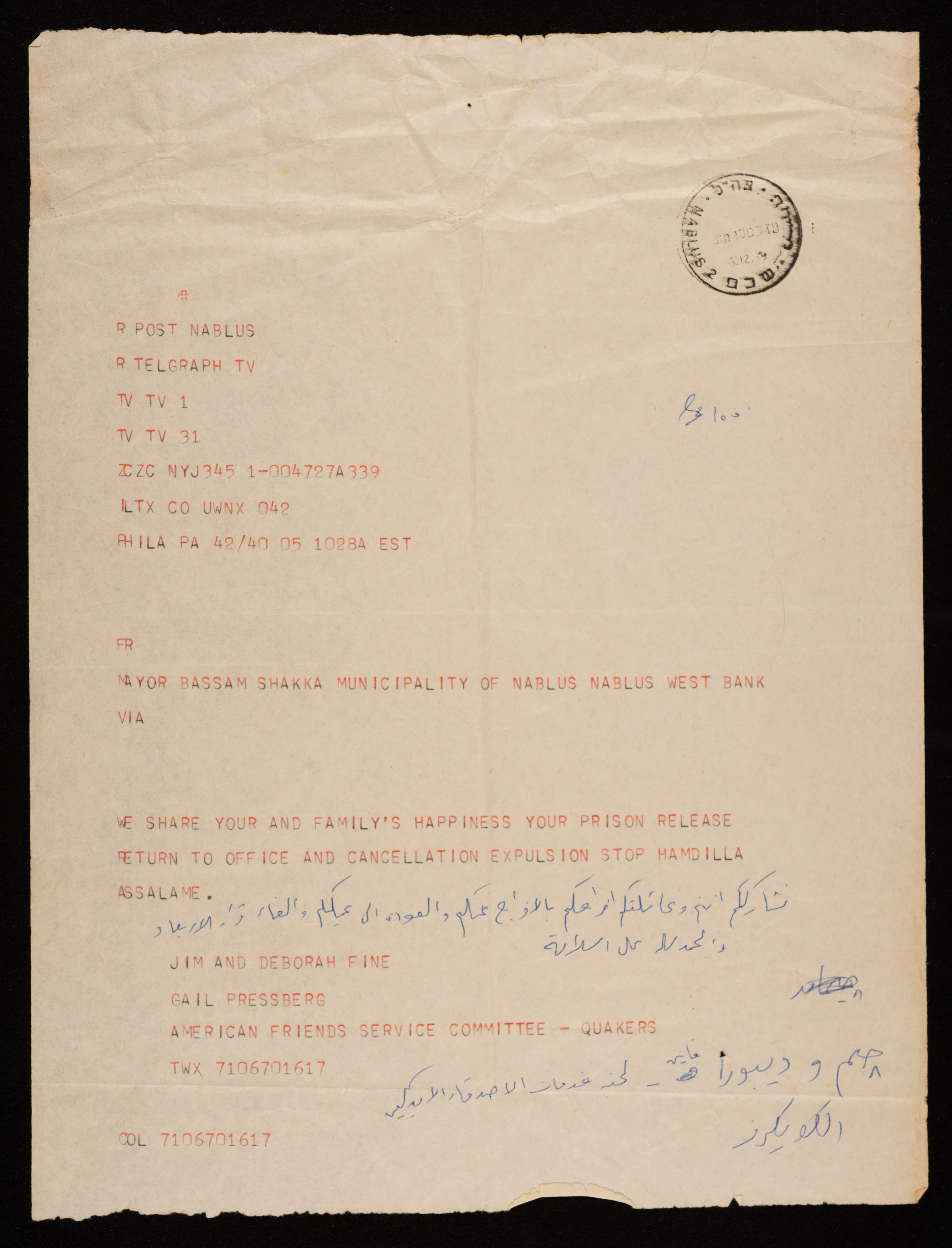 .وثيقة مطبوعة باللغة الانجليزية، تتضمن برقية تهنئة وصلت بسام الشكعة رئيس بلدية نابلس