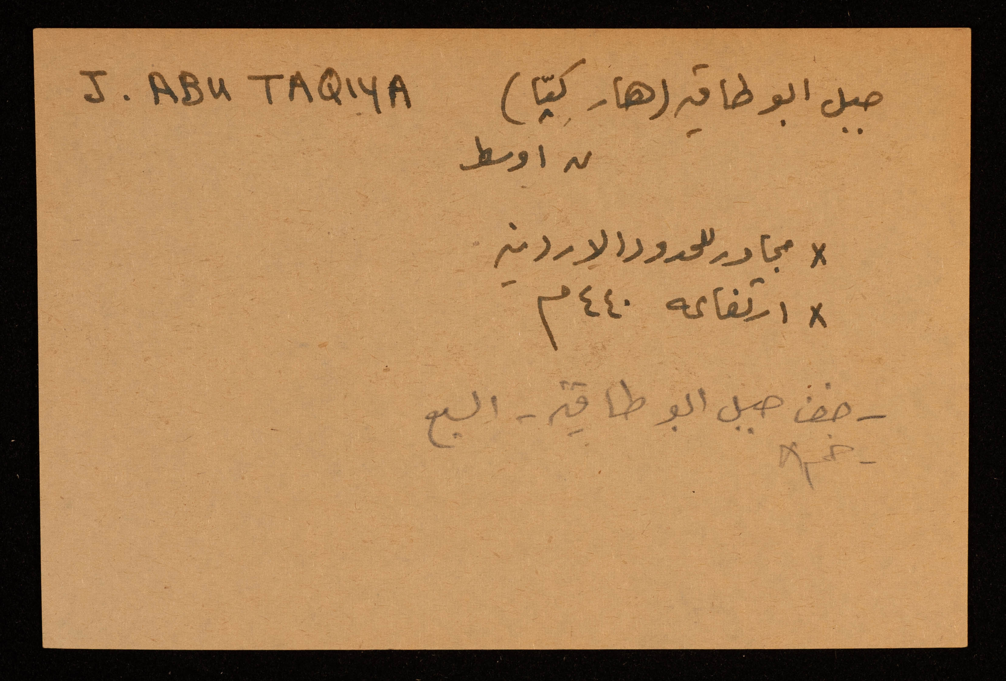 قصاصة توثق الإسم العربي لجبل أبو طاقية في بئر السبع مجاوراً للحدود الأردنية ويبلغ ارتفاعه 440 متر عن سطح البحر.