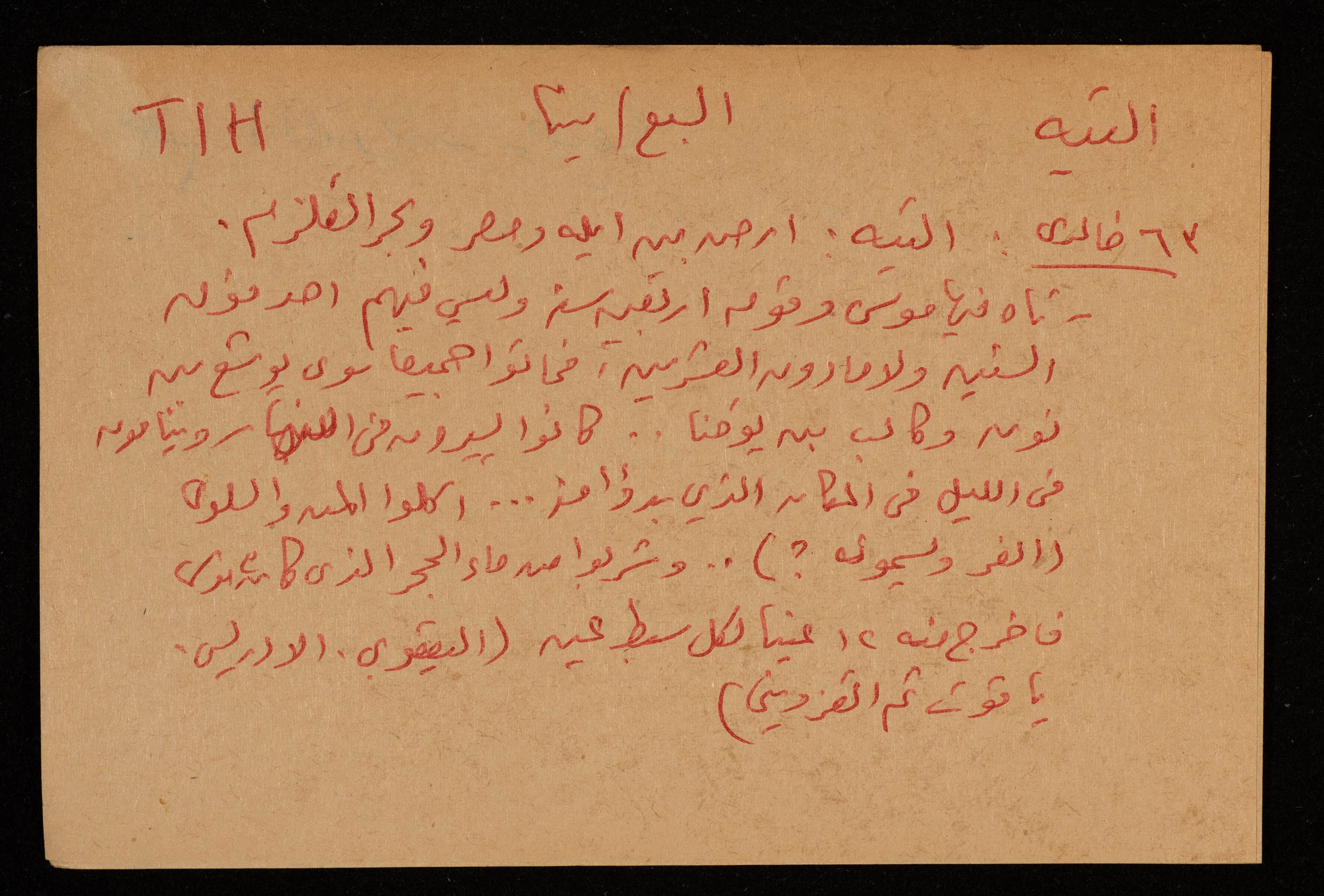 قصاصة توثق الإسم العربي لقرية التيه في بئر السبع. وهي أرض بين أيله ومصر وبحر القلزم. وهي التي تاه فيها موسى وقومه أربعين سنة.