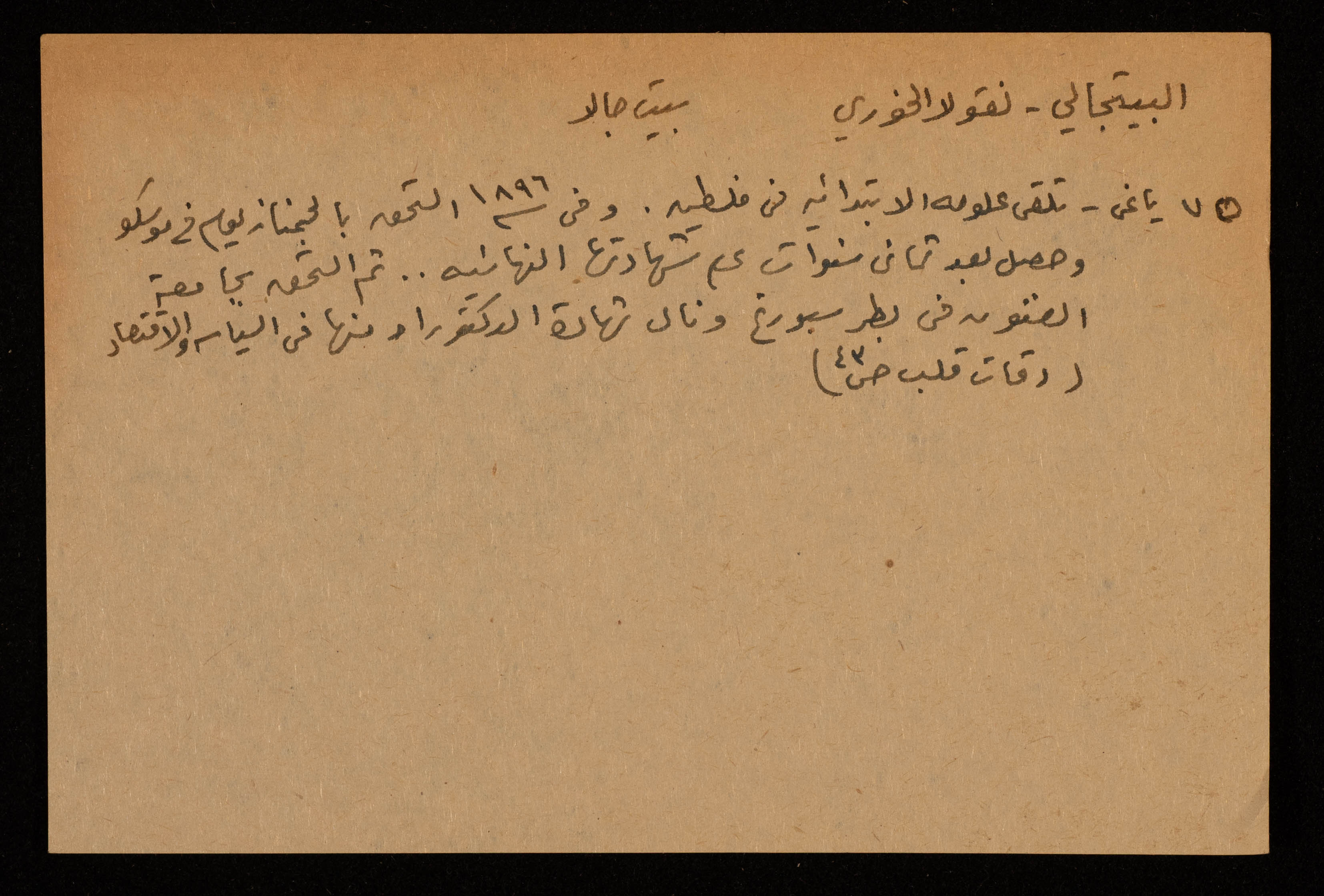 يتحدر نقولا الخوري البيتجالي من مدينة بيت جالا. في عام 1896 التحق بالجمنازيوم في موسكو وحصل بعد ثماني سنوات على شهادتها النهائية. ثم التحق بجامعة الفنون في بطرسبرغ ونال شهادة الدكتوراة منها في السياسة والاقتصاد.