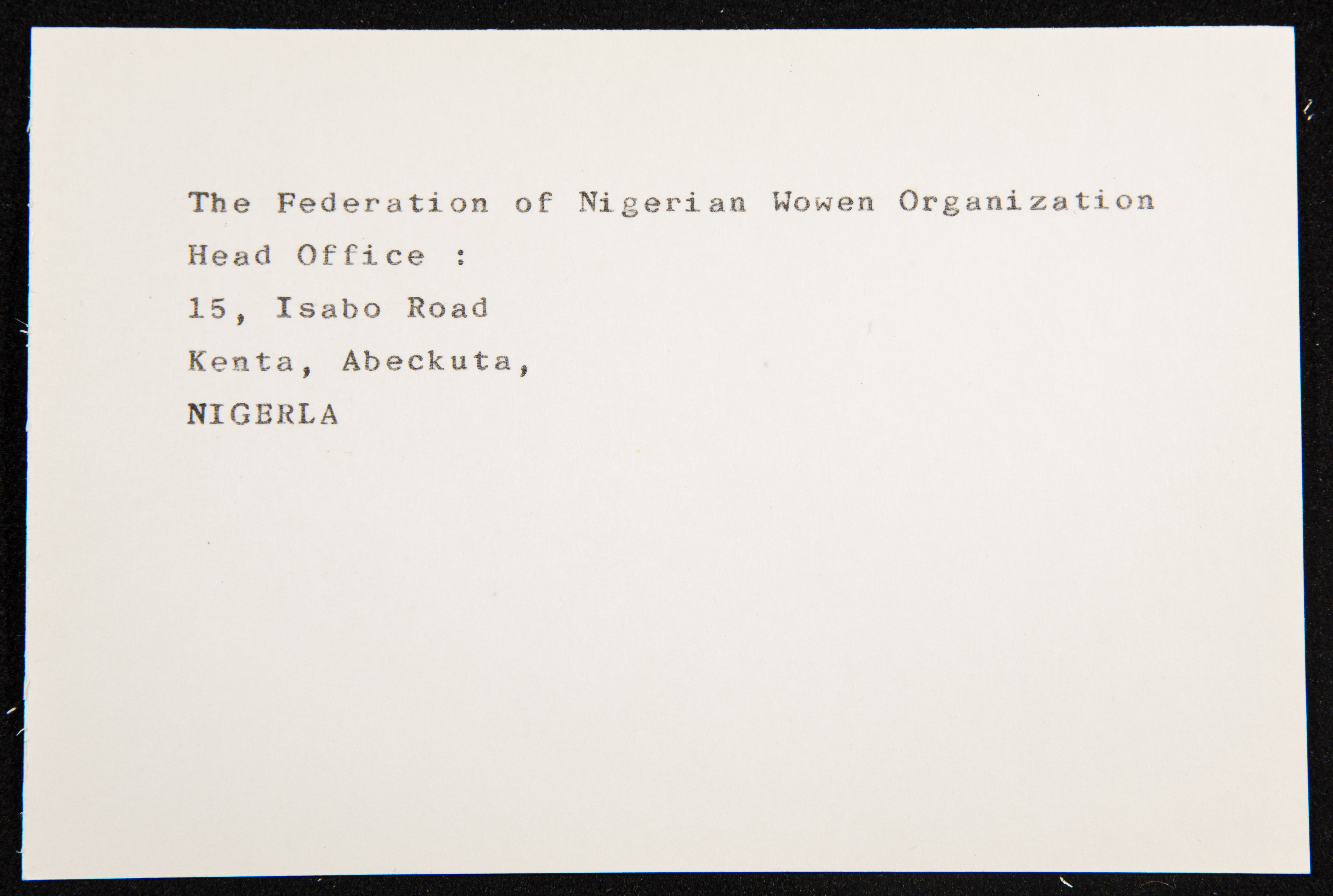 توثق هذه القصاصة، المطبوعة بالآلة الكاتبة، عنوان اتحاد المؤسسات النسوية النيجيرية. من غير الواضح اذا ما كانت القصاصة عبارة عن رسالة بريدية أم قصاصة توثيقية بحثية.
