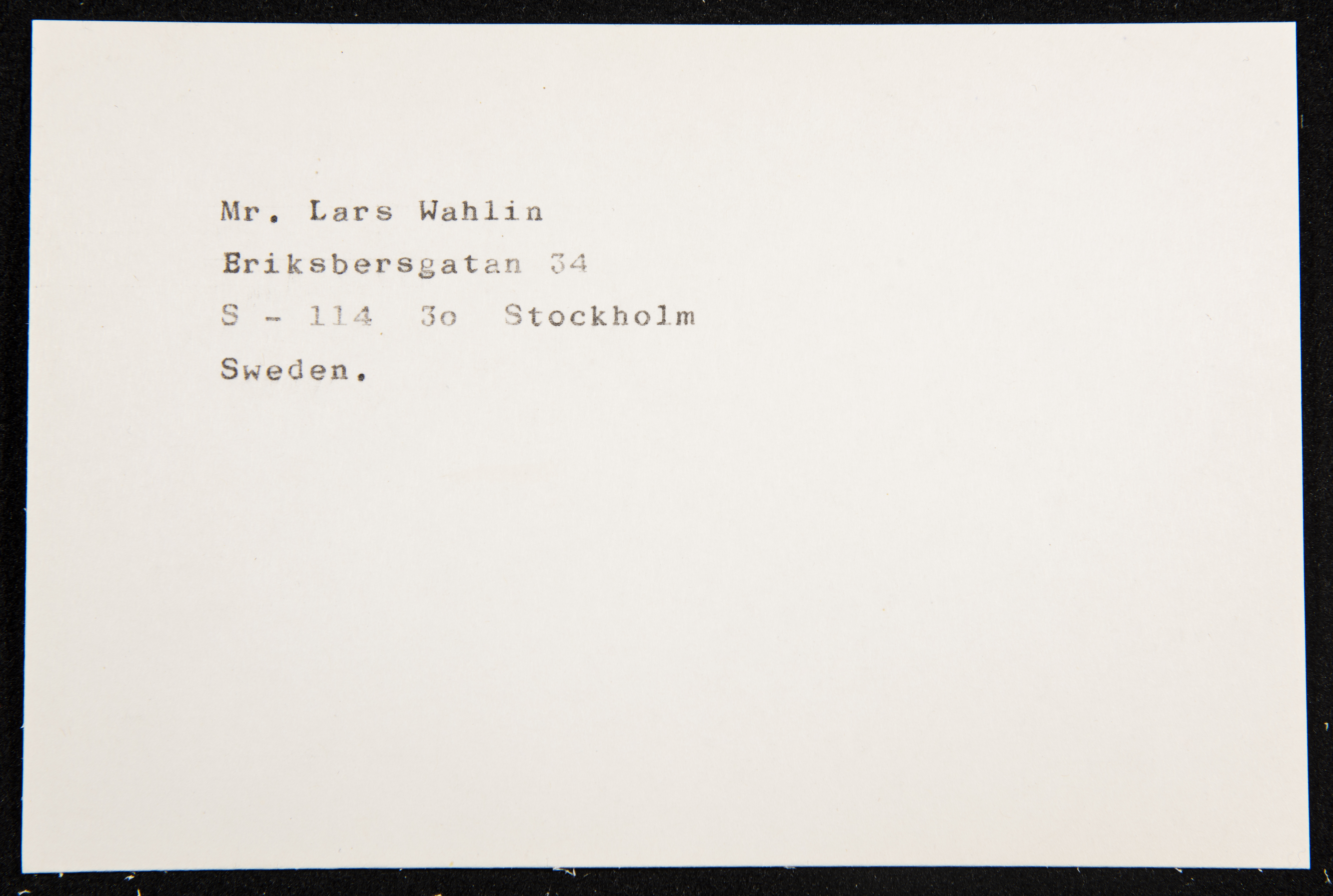 Typed in English, this paper clipping documents the address of Lars Wahlin in Stockholm, Sweden. It is unclear if the clipping is taken from a letter or is a documentary clipping for research purposes.
