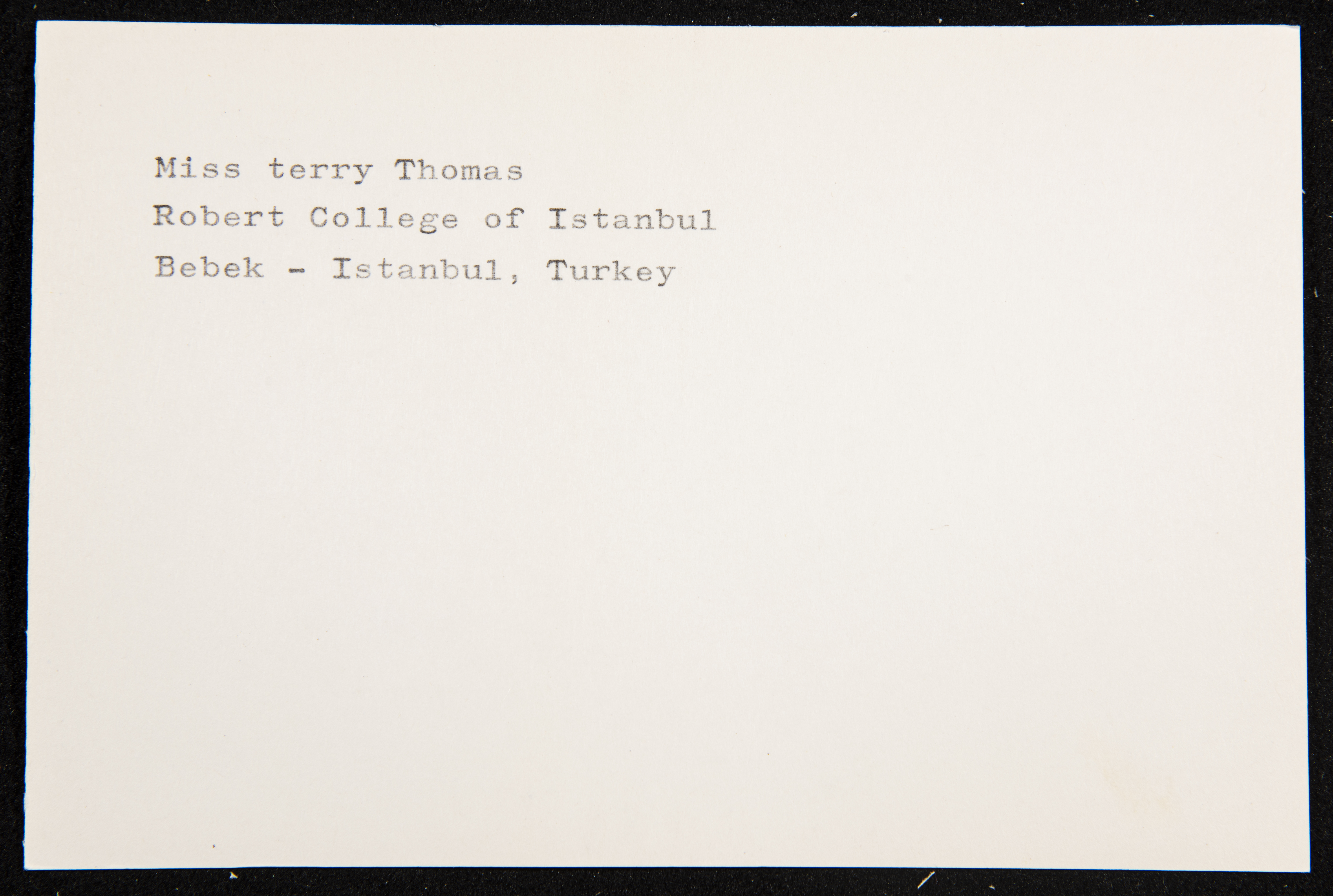 توثق هذه القصاصة، المطبوعة بالآلة الكاتبة، عنوان تيري توماس من كلية روبرت في اسطنبول. من غير الواضح اذا ما كانت القصاصة عبارة عن رسالة بريدية أم قصاصة توثيقية بحثية.