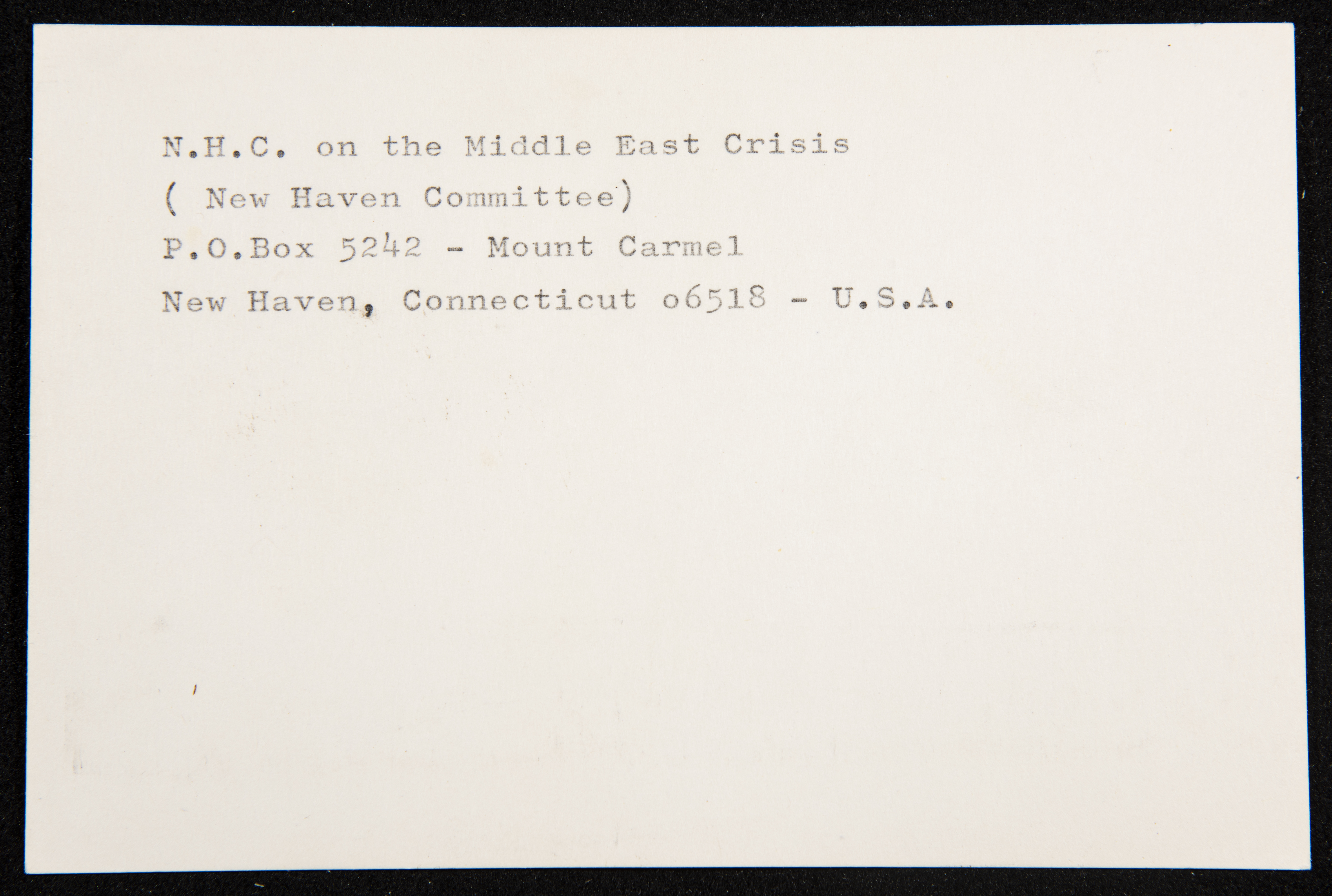 Typed in English, this paper clipping documents the address of New Haven Committee on the Middle East Crisis, in Connecticut, U.S.A. It is unclear if the clipping is taken from a letter or is a documentary clipping for research purposes.