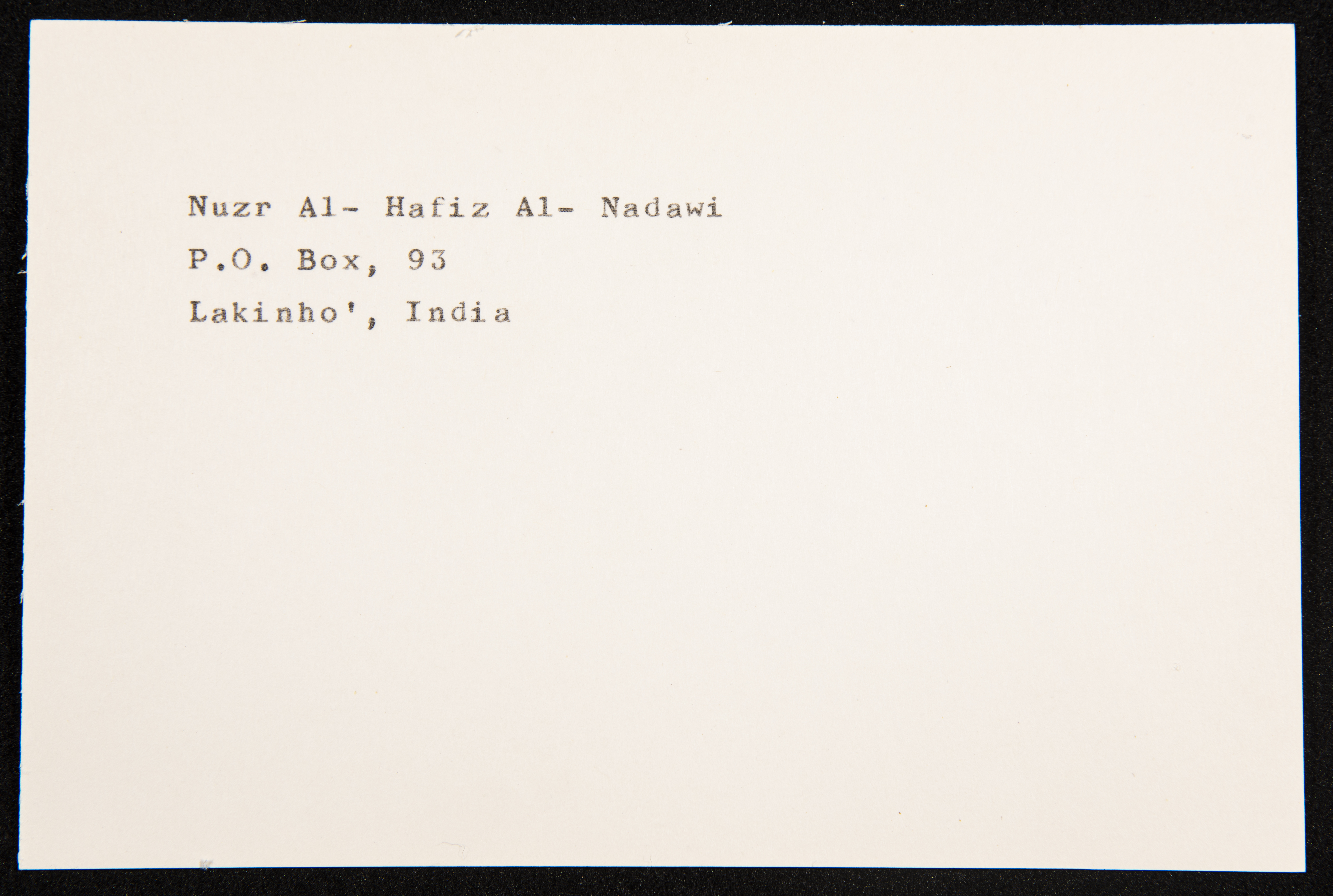 توثق هذه القصاصة، المطبوعة بالآلة الكاتبة، عنوان نُذر الحافظ الندوي في الهند. من غير الواضح اذا ما كانت القصاصة عبارة عن رسالة بريدية أم قصاصة توثيقية بحثية.