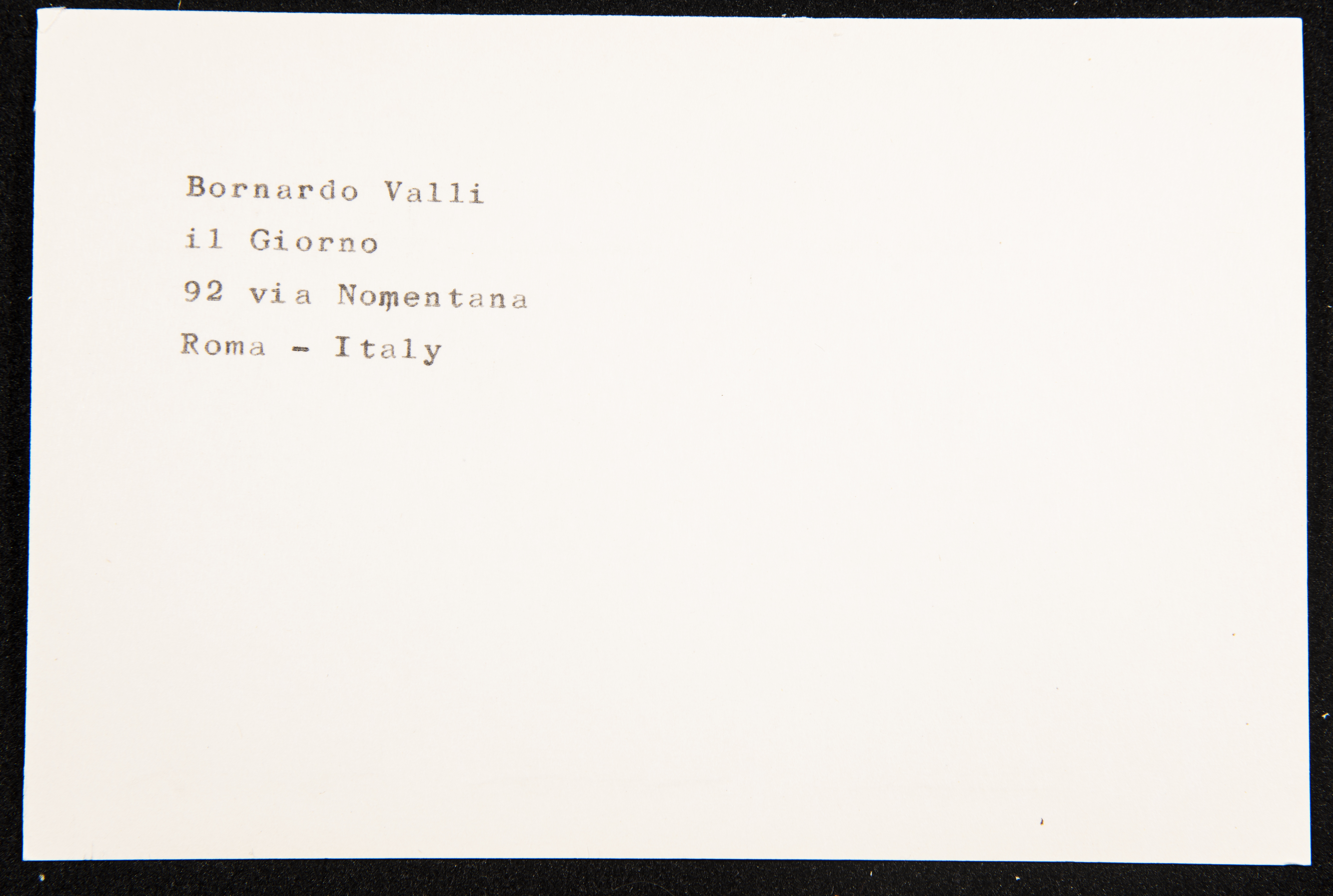 توثق هذه القصاصة، المطبوعة بالآلة الكاتبة، عنوان بورناردو فالي من صحيفة "إل جيورنو"، روما- ايطاليا. من غير الواضح اذا ما كانت القصاصة عبارة عن رسالة بريدية أم قصاصة توثيقية بحثية.