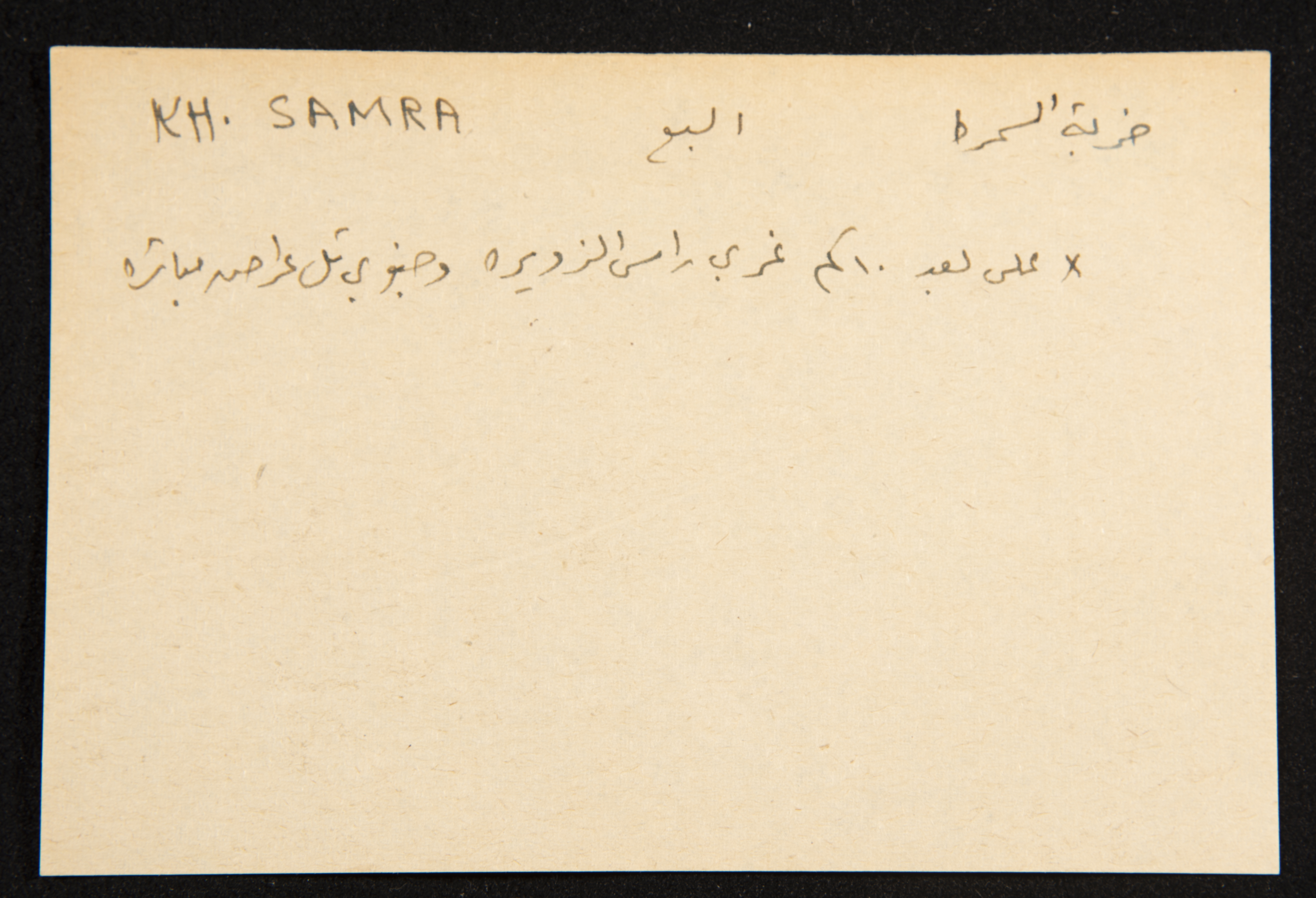 توثق هذه القصاصة، المكتوبة بخط اليد، خربة "السمرة" الواقعة على بعد 10كم (5.5 كم حسب مرجع شكري عراف) جنوبي شرقي تل عراد، و2كم جنوبي الطريق إلى بئر السبع. يذكر شكري عراف أن لفظها خربة "السمرة". كما يذكر وجود خربة أخرى تحمل نفس الإسم وتقع جنوبي غربي قرية مغلّس فيها أساسيات ومغاور وبئر.