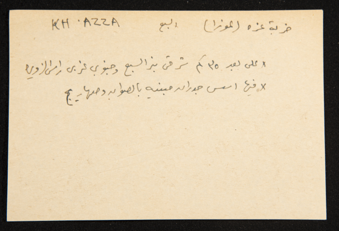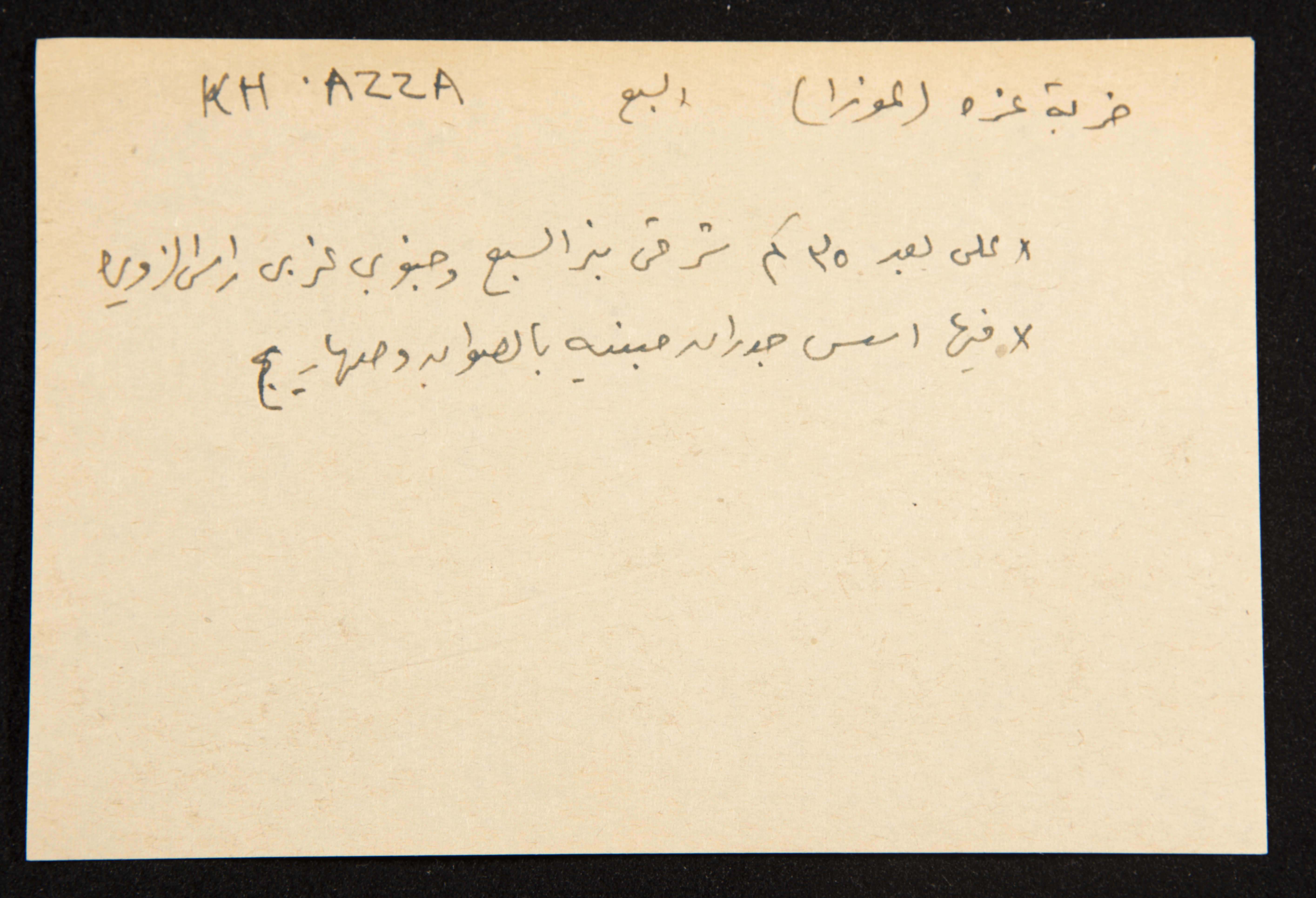 Handwritten in Arabic, this paper clipping documents the name of "Khirbet 'Azza ('Uza in Hebrew)", a Khirbet (helmet) thirty-five kilometres east of Beʾr as-Sabeʿ featuring flint wall foundations and many ontainers.