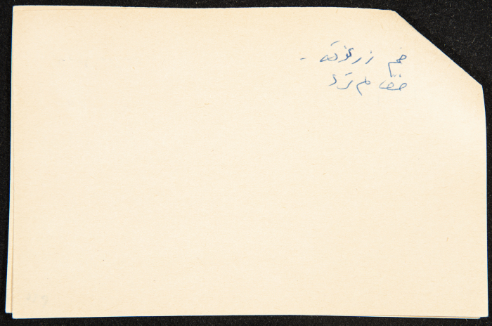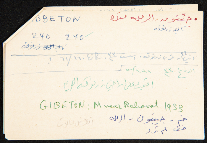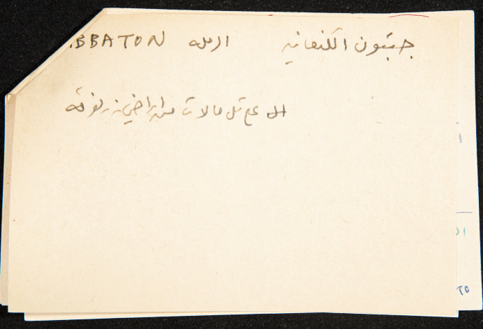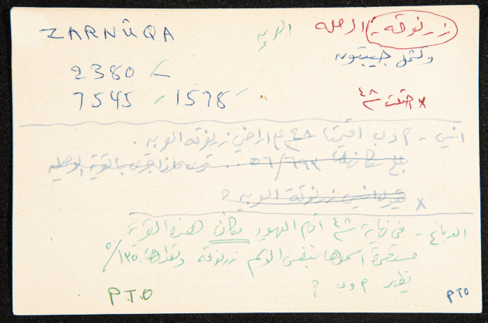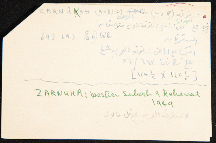 Handwritten in Arabic, this paper clipping documents the name of "Zarnuqa", a village depopulated in 1948 and it is where the "Aub" colony was established.