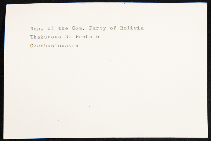 Written in English, this paper clipping shows the address of the Rep. of the Communist Party of Bolivia in Czechoslovakia.