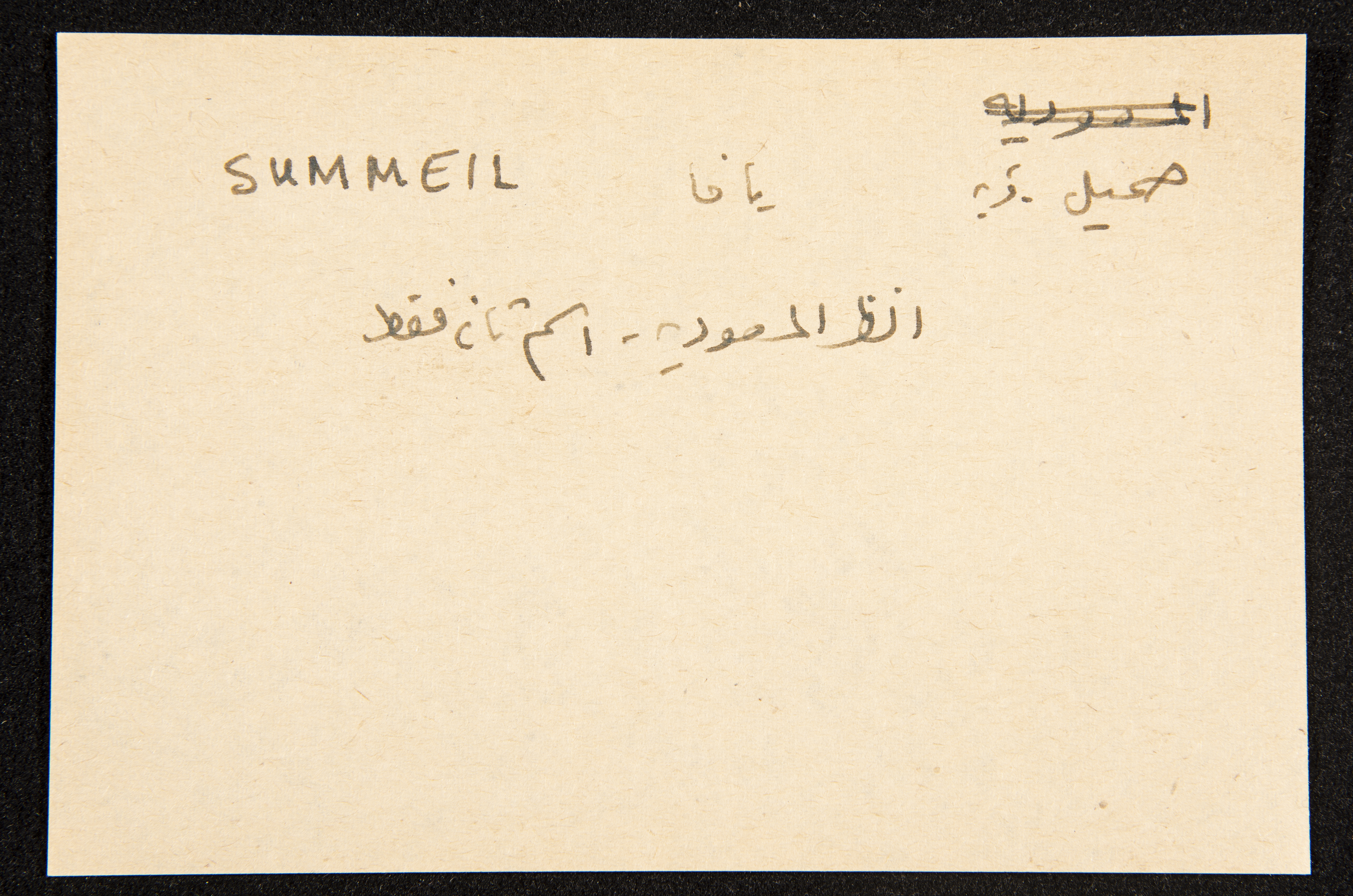 توثق هذه القصاصة، المكتوبة بخط اليد، قرية "صُميل" المهجرة. كانت القرية تقع في رقعة مستوية من الأرض الرملية، في السهل الساحلي الأوسط، على بعد 1.5 كلم إلى الشرق من شاطئ البحر، و 1.5 كلم إلى الجنوب من نهر العوجا. لكنها اكتسبت اسم المسعودية في أوائل القرن العشرين. احتلها الصهاينة عام 1948رغم أن أهلها كانوا قد أخلوها خوفاً في 1947. باتت القرية جزءاً من مستعمرة "تل أبيب" الاستيطانية.