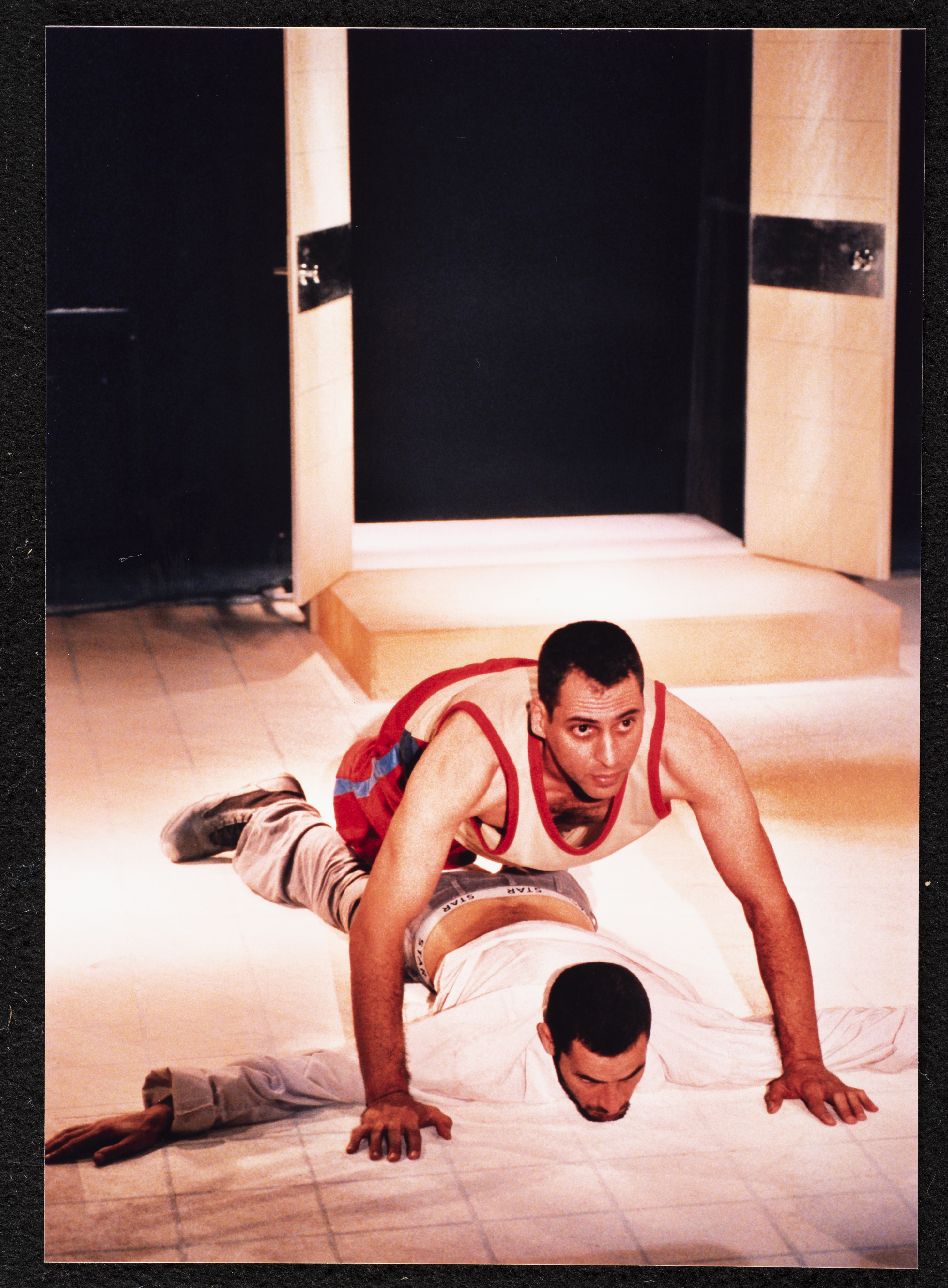 صورة ملونة يظهر فيها صالح بكري وجواد عبد الغني، خلال تأديتهما أحد مشاهد مسرحية جنون خلال العرض، لعب صالح بكري دور "نور الشاب الذي يتعرض لأزمات وضغوطات نفسية"أما جواد عبد الغني لعب دور خاء "الأخ الأكبر لنور، وكان يعمل في تجارة المخدرات". يذكر أن مسرحية جنون هي مسرحية فنية من انتاج مسرح الميدان في حيفا، وتاليف جليلة نكار واعداد تامر سليمان واخراج سامح حجازي، تدور أحداث المسرحية حول رحلة شاب في البحث عن الذات، الشاب يدعى نور مرهف الاحساس لكنه تعرض للكثير من الأزمات والصعاب.