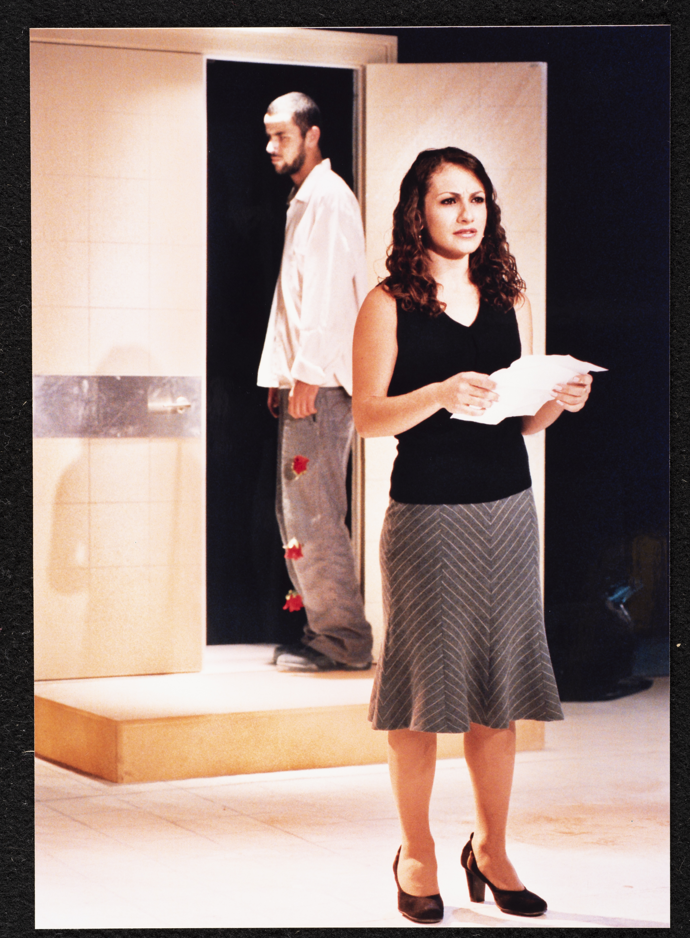 صورة ملونة تظهر فيها حنان حلو وصالح بكري، خلال تأديتهما أحد مشاهد مسرحية جنون في جلسة البروفة، ولعبت حنان حلو دور "الطبيبة النفسية"، في حين لعب صالح البكري دور "نور، الشاب الذي يمر بأزمات وضغوطات نفسية". يذكر أن مسرحية جنون هي مسرحية فنية من انتاج مسرح الميدان في حيفا، وتاليف جليلة نكار واعداد تامر سليمان واخراج سامح حجازي، تدور أحداث المسرحية حول رحلة شاب في البحث عن الذات، الشاب يدعى نور مرهف الاحساس لكنه تعرض للكثير من الأزمات والصعاب.