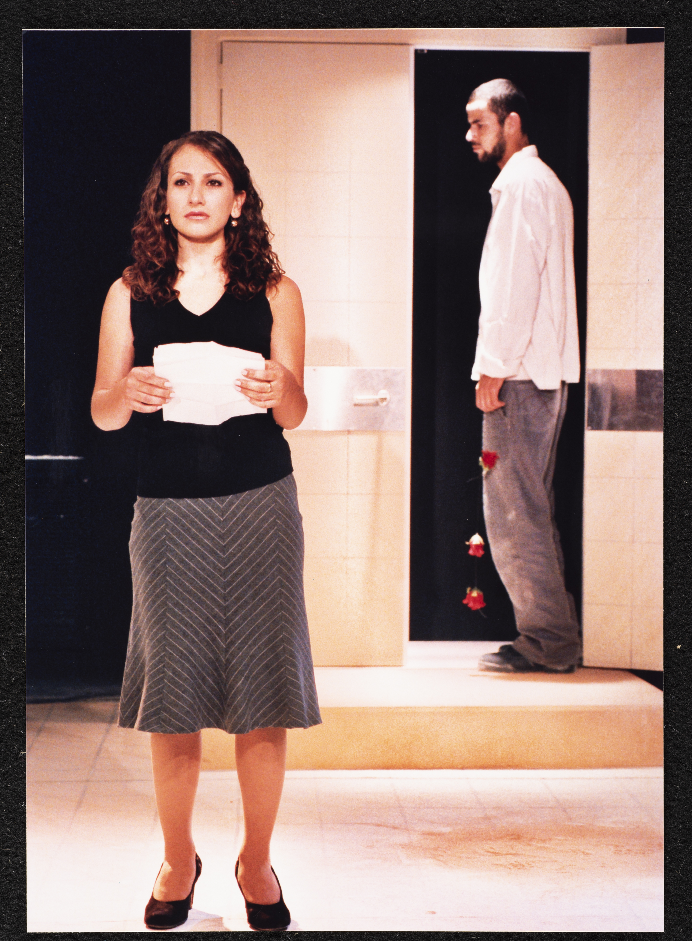 صورة ملونة تظهر فيها حنان حلو وصالح بكري، خلال تأديتهما أحد مشاهد مسرحية جنون في جلسة البروفة، ولعبت حنان حلو دور "الطبيبة النفسية"، في حين لعب صالح البكري دور "نور، الشاب الذي يمر بأزمات وضغوطات نفسية". يذكر أن مسرحية جنون هي مسرحية فنية من انتاج مسرح الميدان في حيفا، وتاليف جليلة نكار واعداد تامر سليمان واخراج سامح حجازي، تدور أحداث المسرحية حول رحلة شاب في البحث عن الذات، الشاب يدعى نور مرهف الاحساس لكنه تعرض للكثير من الأزمات والصعاب.