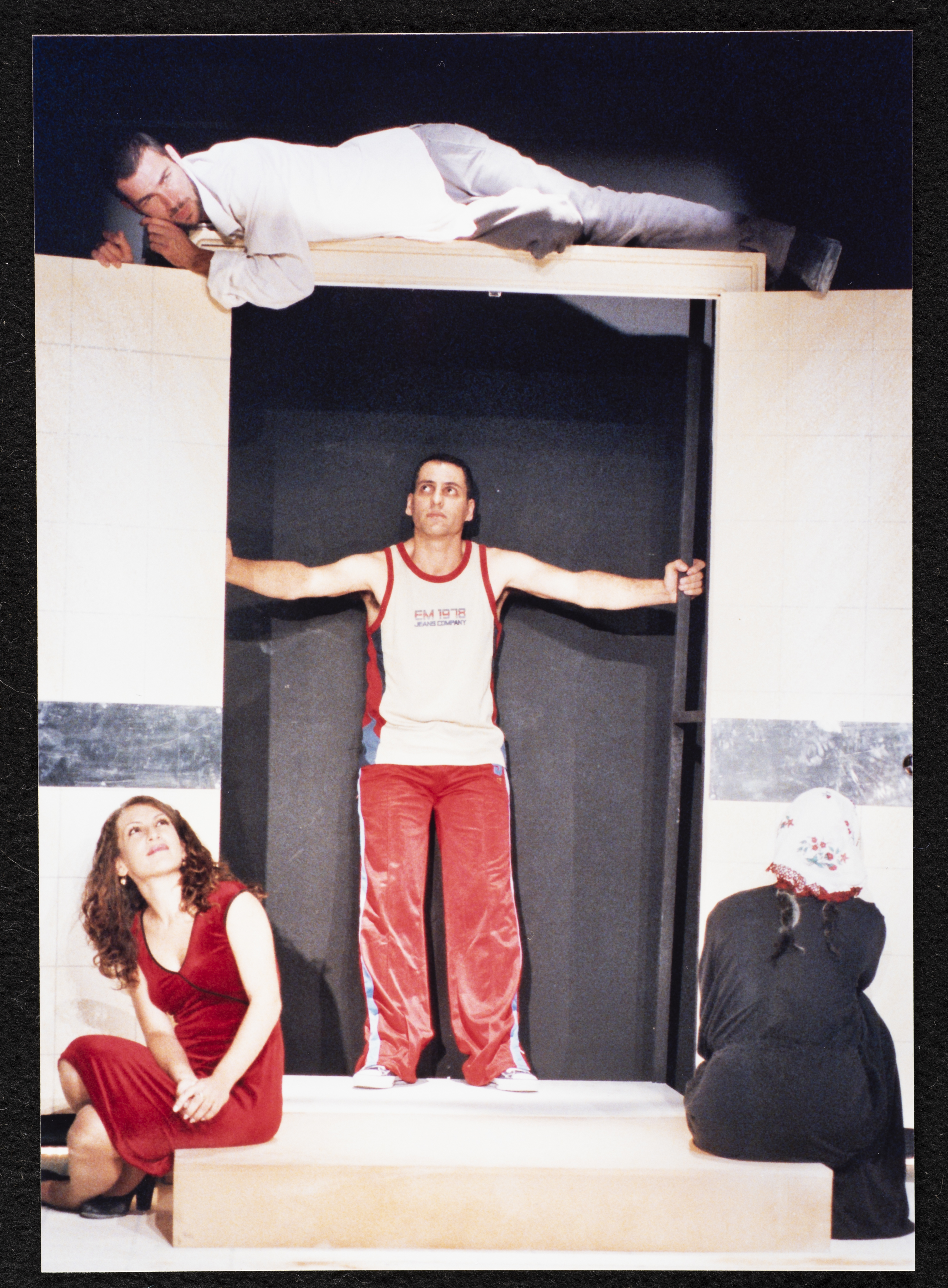 صورة ملونة يظهر فيها جواد عبد الغني وعرين عابدي وصالح بكري وحنان حلو أثناء أدائهم لأحد مشاهد مسرحية جنون خلال عرضها أمام الجمهور. لعبت عرين عابدي دور " أم الشاب نور" أما صالح بكري فلعب دور"نور، الشاب الذي يعاني من أزمات وضغوطات نفسية" أما جواد عبد الغني لعب دور "الأخ الأكبر لنور، وكان يعمل في تجارة المخدرات"، وحنان حلو لعبت دور "الطبيبة النفسية المعالجة لنور" يذكر أن مسرحية جنون هي مسرحية فنية من انتاج مسرح الميدان في حيفا، وتاليف جليلة نكار واعداد تامر سليمان واخراج سامح حجازي، تدور أحداث المسرحية حول رحلة شاب في البحث عن الذات، الشاب يدعى نور مرهف الاحساس لكنه تعرض للكثير من الأزمات والصعاب.