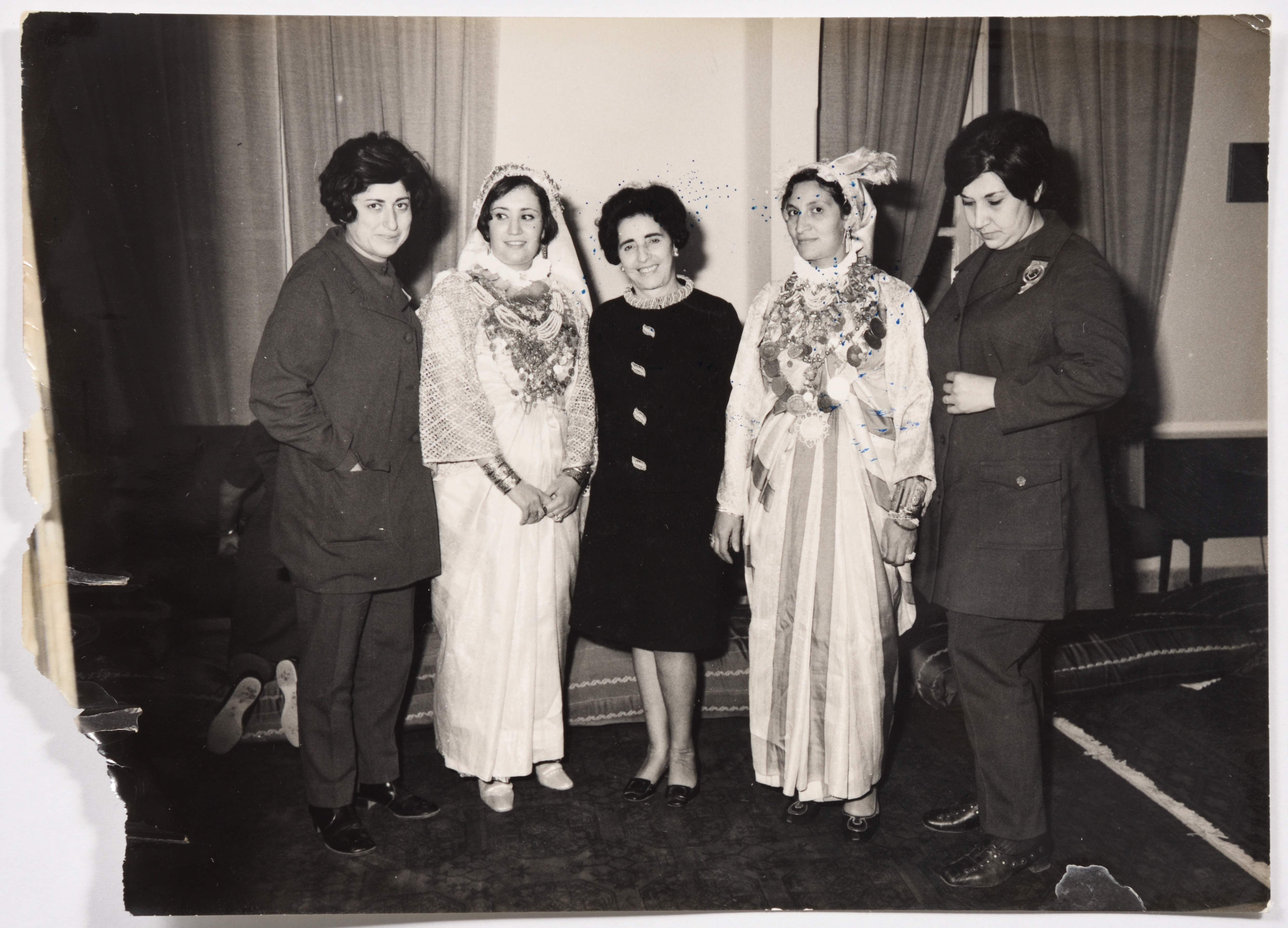A black-and-white photograph of a group of Palestinian women, two of whom are wearing the traditional Libyan dress.