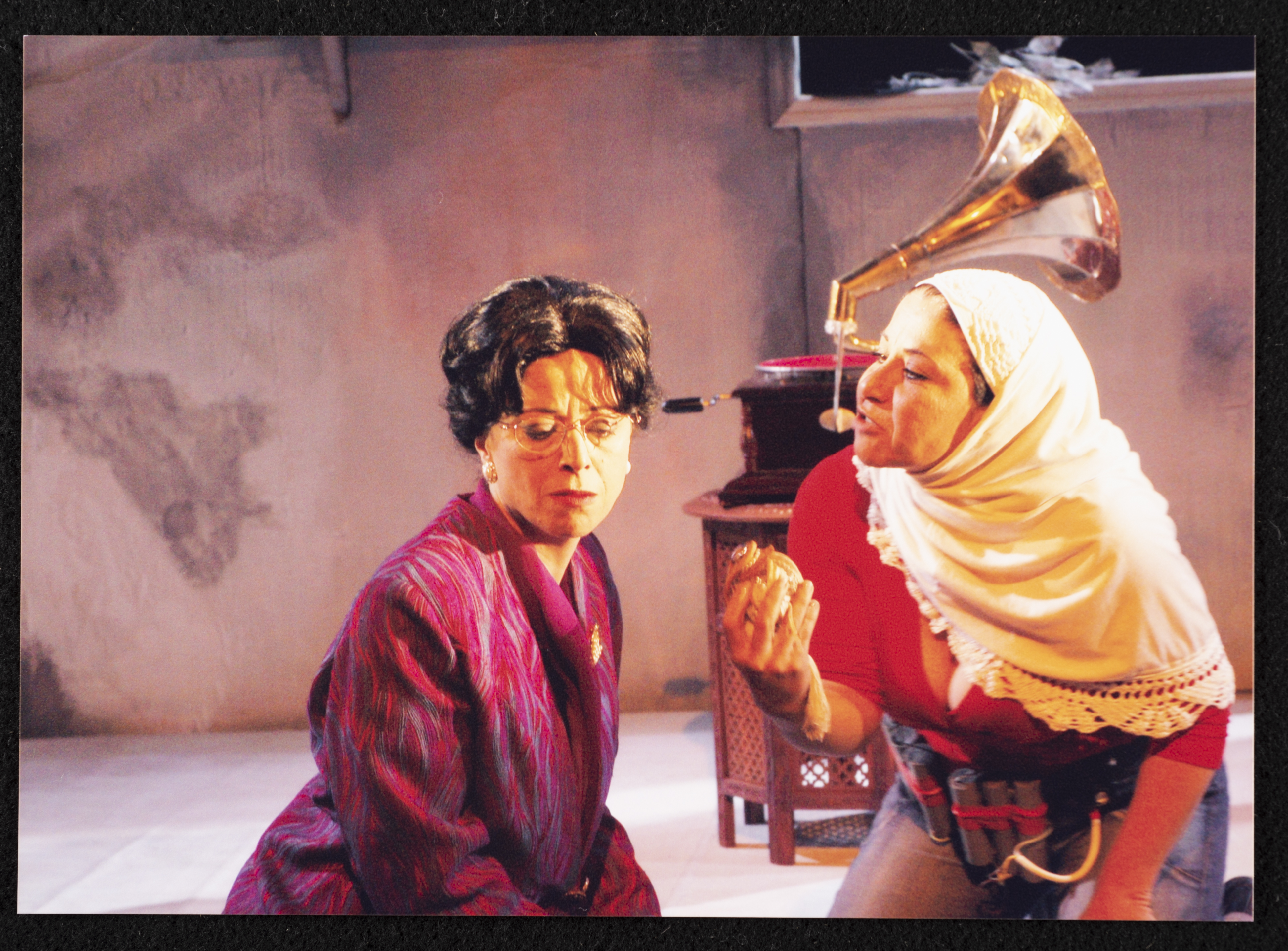 Taken in 2005, this colour photograph shows Salwa Naqara and Sanaʾ Salhab during the theatrical performance of "Ghuyum Fi Rihla Jabaleya [Clouds On a Mountainous Journey]" by al-Midan Theatre. Written and directed by Urna Aqqad and performed by Sanaʾ Lahab who played Inshirah and Salwa Nqara who played Palestinian poet Fadwa Tuqan, the play embodies the life of poet Tuqan as part of her autobiography "Rihla Jabaleya Ṣaʿba [A Mountainous Journey]" was used in the script.
