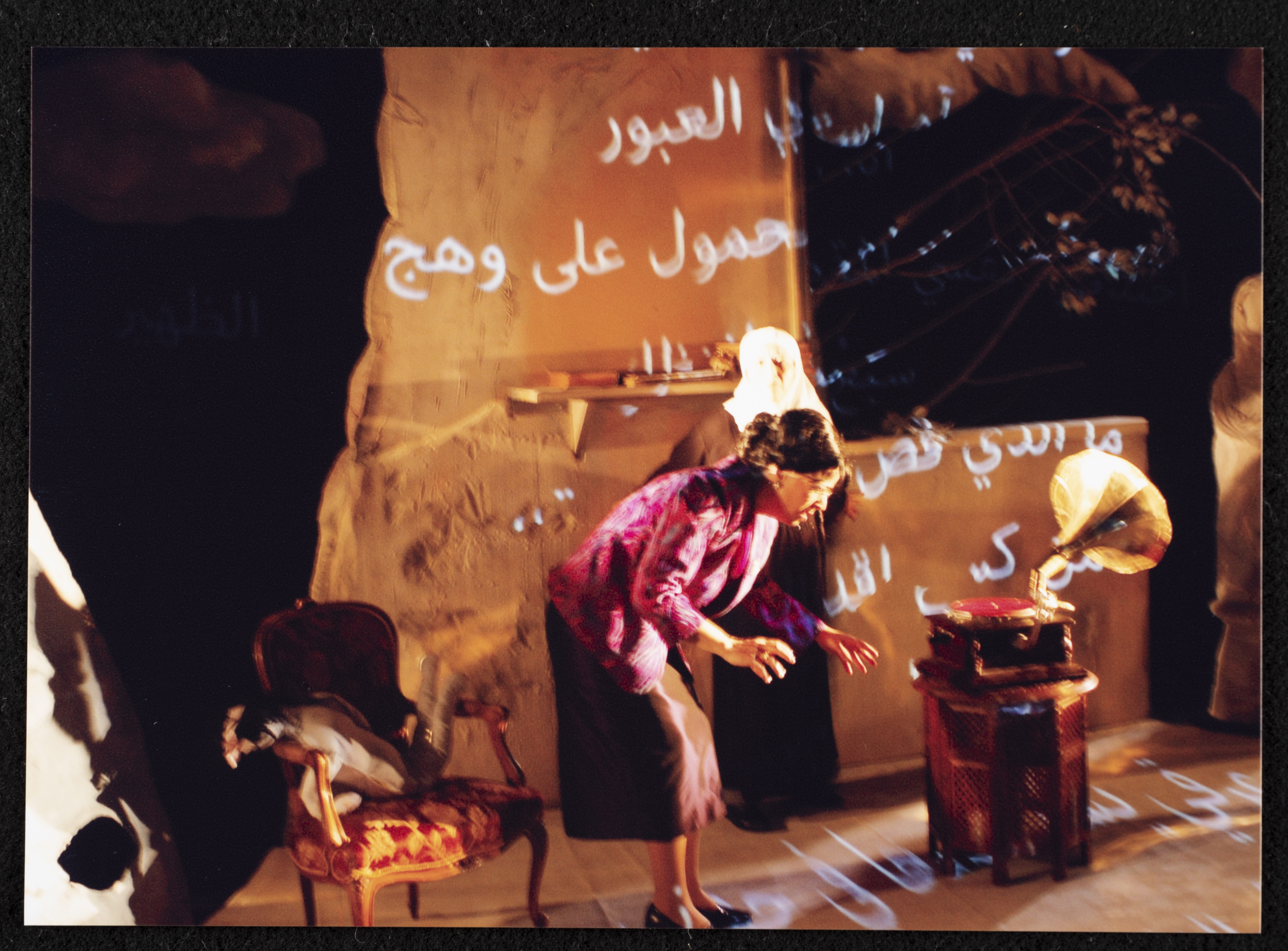 Taken in 2005, this colour photograph shows Salwa Naqara and Sanaʾ Salhab during the theatrical performance of "Ghuyum Fi Rihla Jabaleya [Clouds On a Mountainous Journey]" by al-Midan Theatre. Written and directed by Urna Aqqad and performed by Sanaʾ Lahab who played Inshirah and Salwa Nqara who played Palestinian poet Fadwa Tuqan, the play embodies the life of poet Tuqan as part of her autobiography "Rihla Jabaleya Ṣaʿba [A Mountainous Journey]" was used in the script.