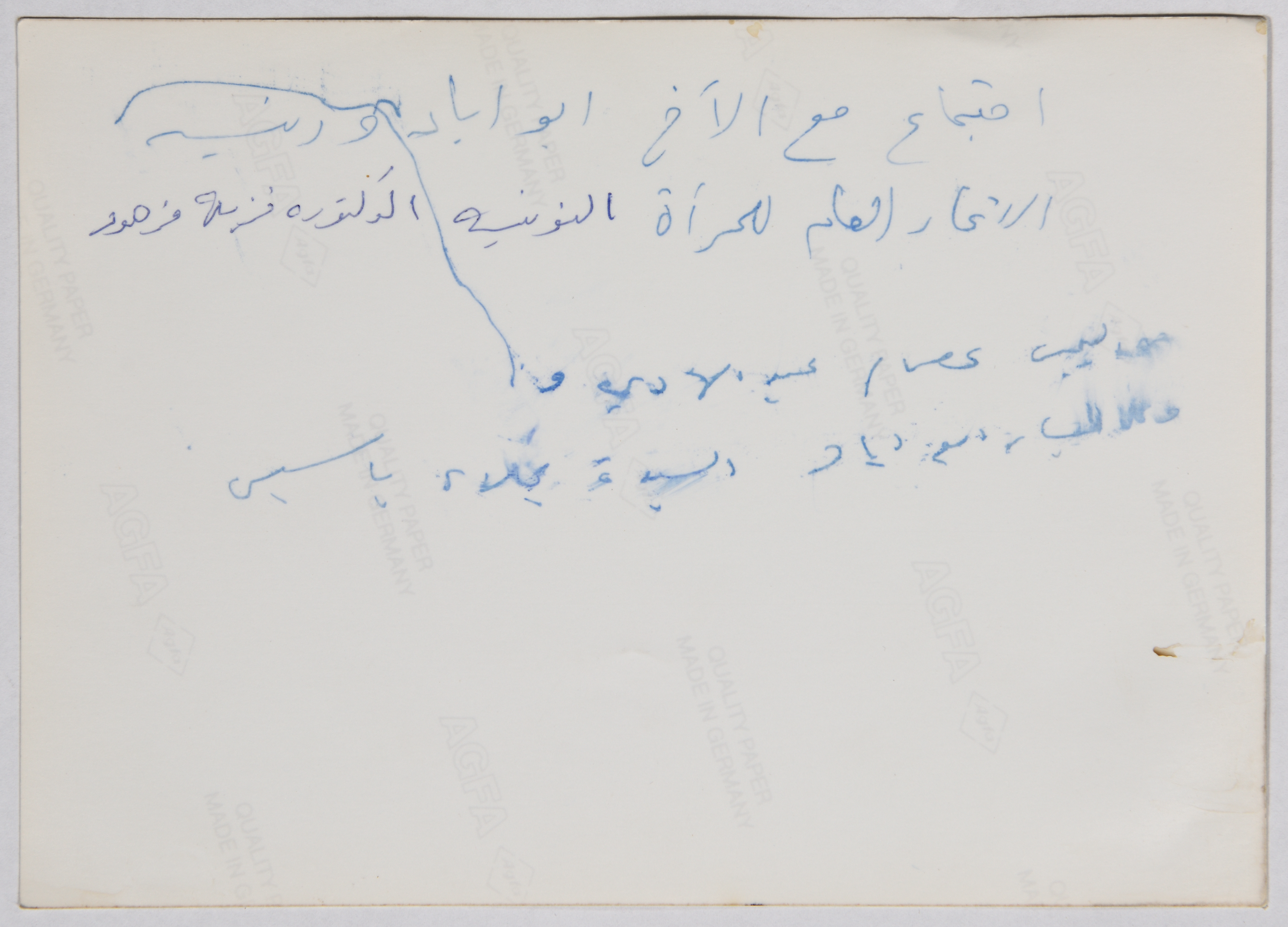 A colour photograph of the meeting of the shaheed Ṣalah Khalaf abu Iyad with the president of the General Federation of Tunisian Women, Dr. Nazeeha Al-Obeidi, Ms. Essam Al-Obeidi and the fighter Najla' Yassin.